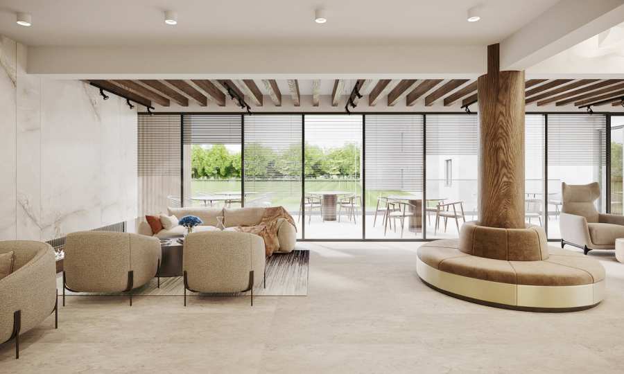 Архитектурната визия ще бъде подчертана с луксозно изпълнени общи части с асансьори KONE, а на разположение на обитателите ще има ресторант от премиален бранд, италианска кафе-сладкарница, скиорна, ултрамодерен уелнес и СПА център, който включва вътрешни и външни сауни, малък басейн с дифузери, парна баня и стаи за масаж, както и фитнес център с Kettler и Tehnogym фитнес уреди.