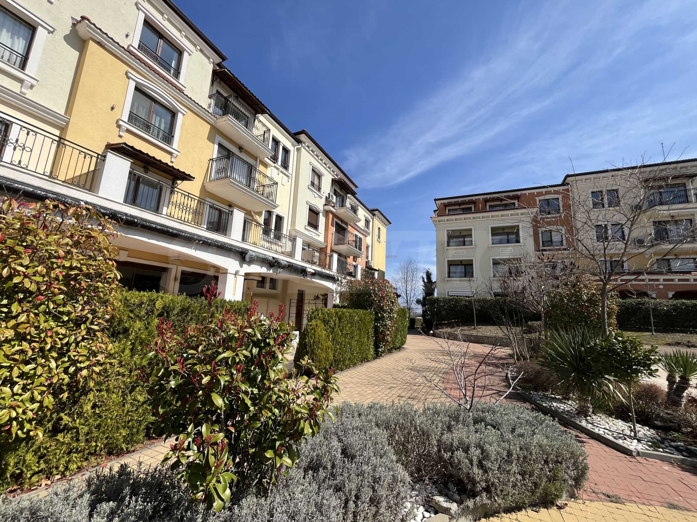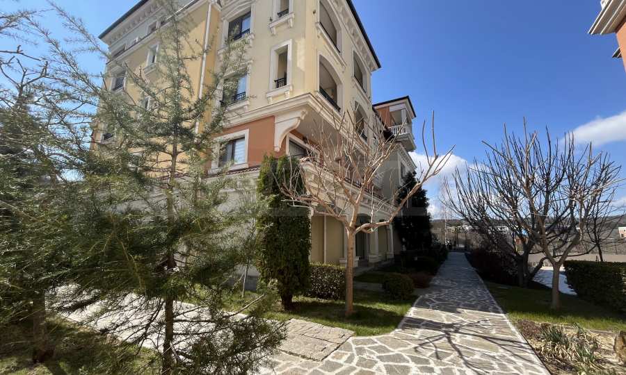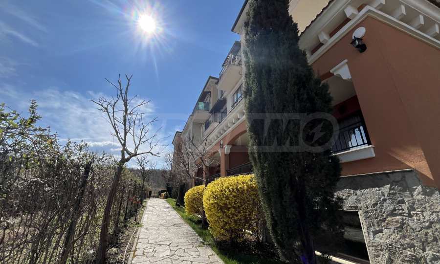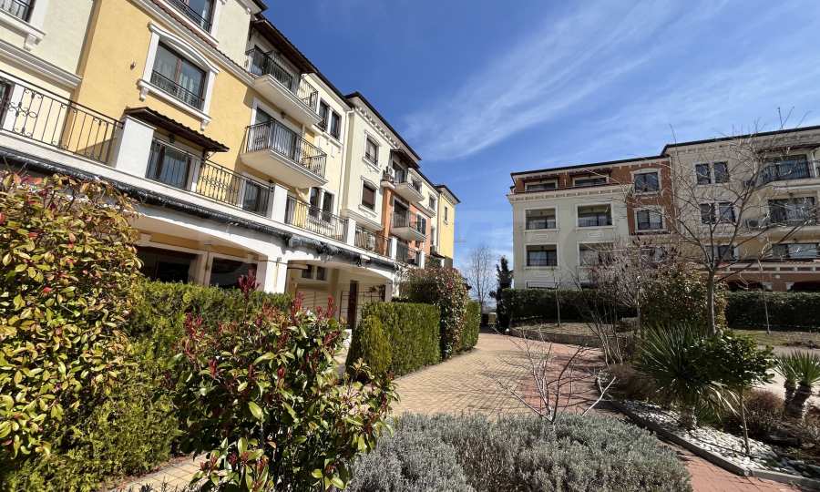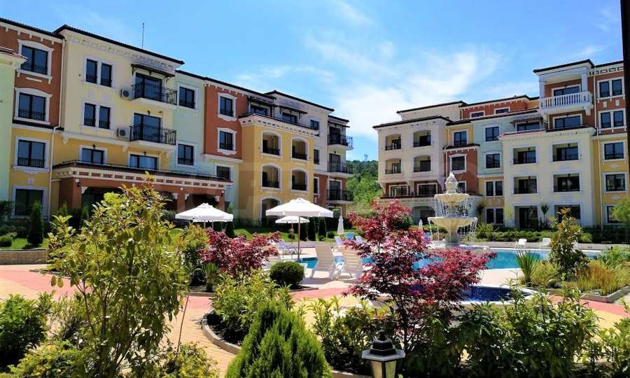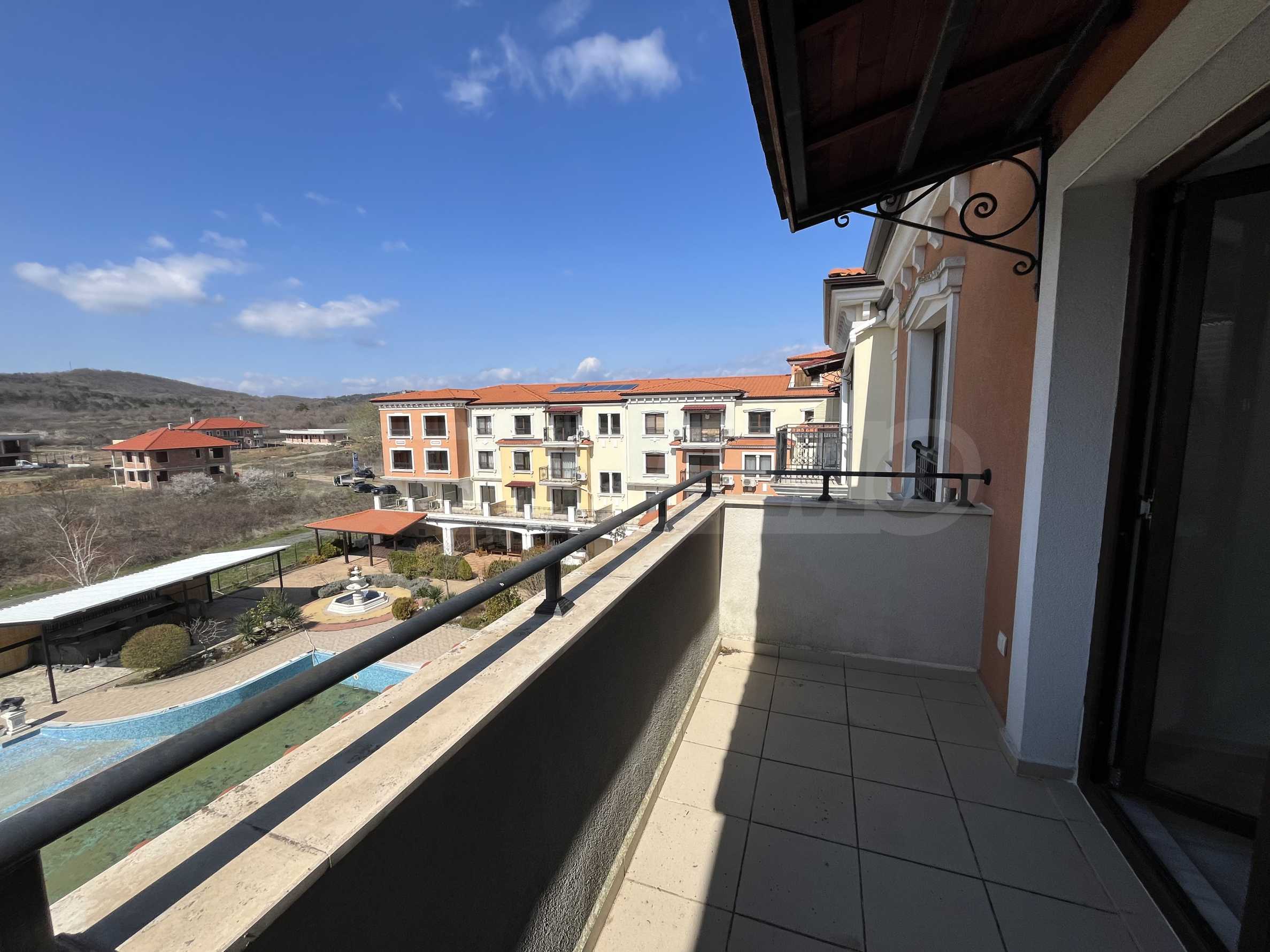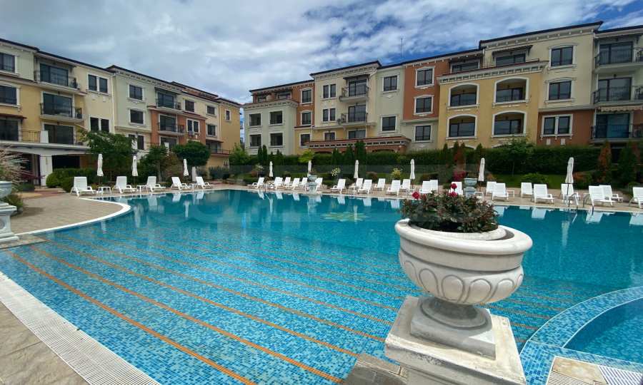 Апартаментът от 57.20 кв.м се намира на 4-ти етаж и има гледка към басейна.