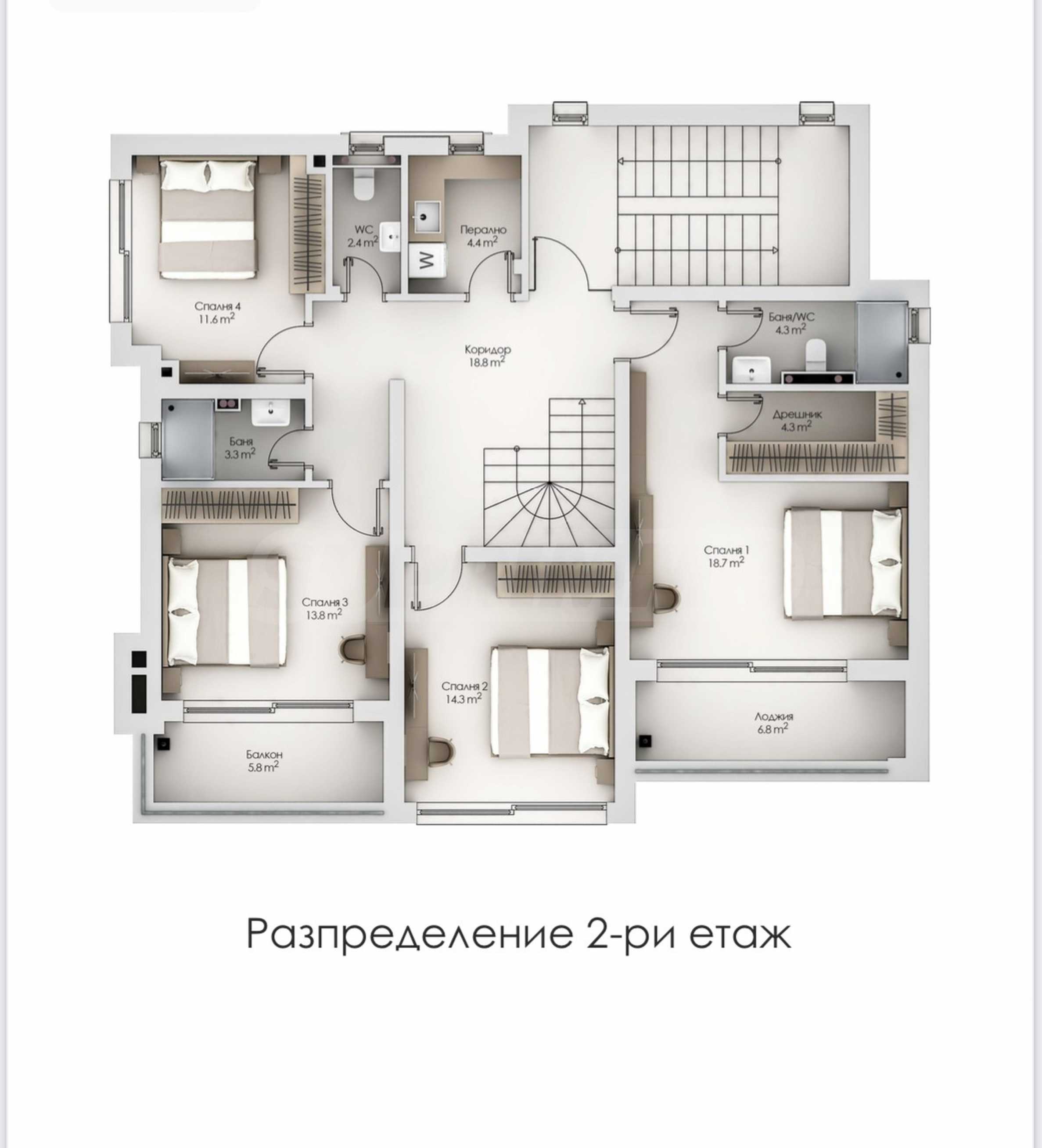 - Етаж 2 - 4 спални, гардеробна, 3 санитарни помещения, мокро помещение;