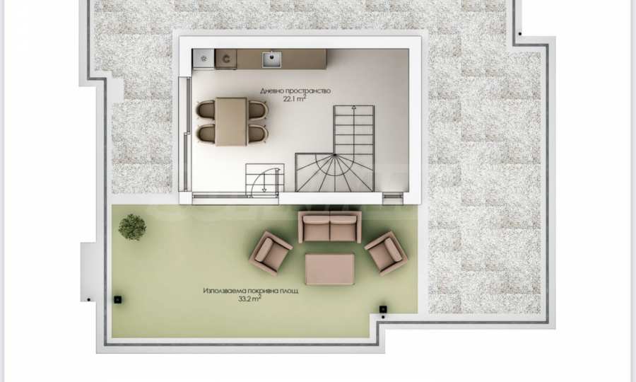 - Етаж 1 - дневна с кухненски кът, килер, санитарно помещение, техническо помещение, веранда;