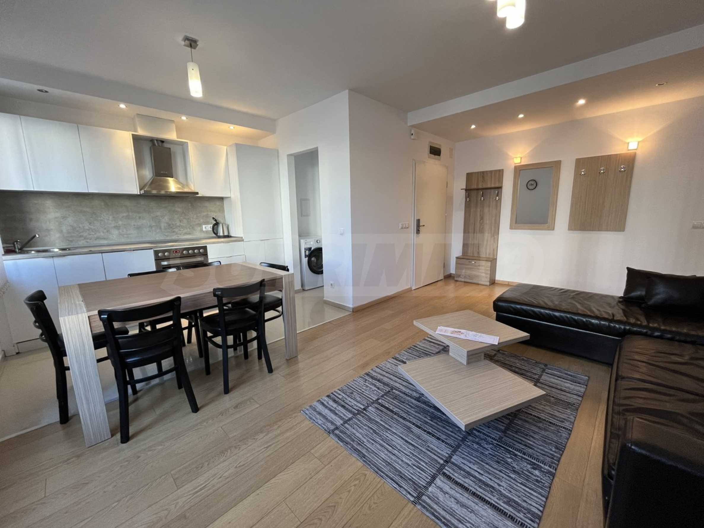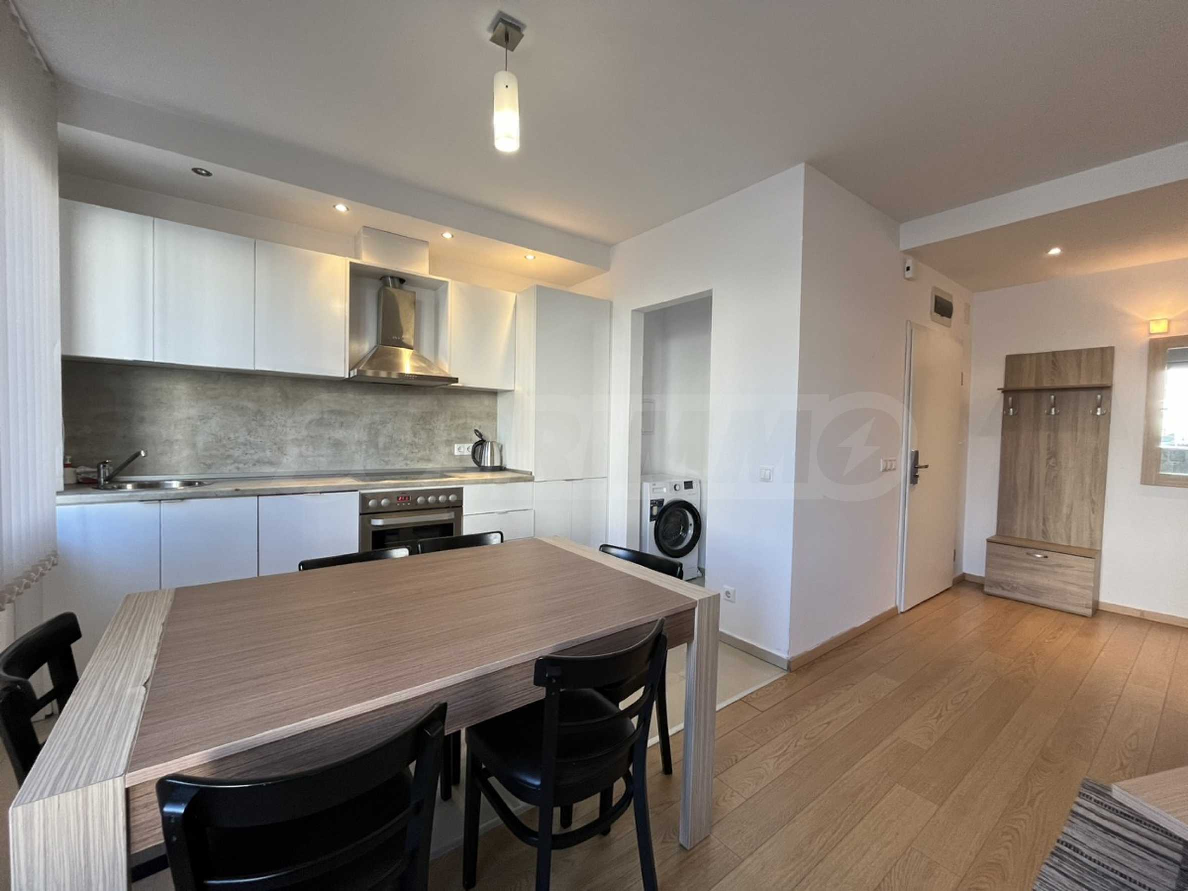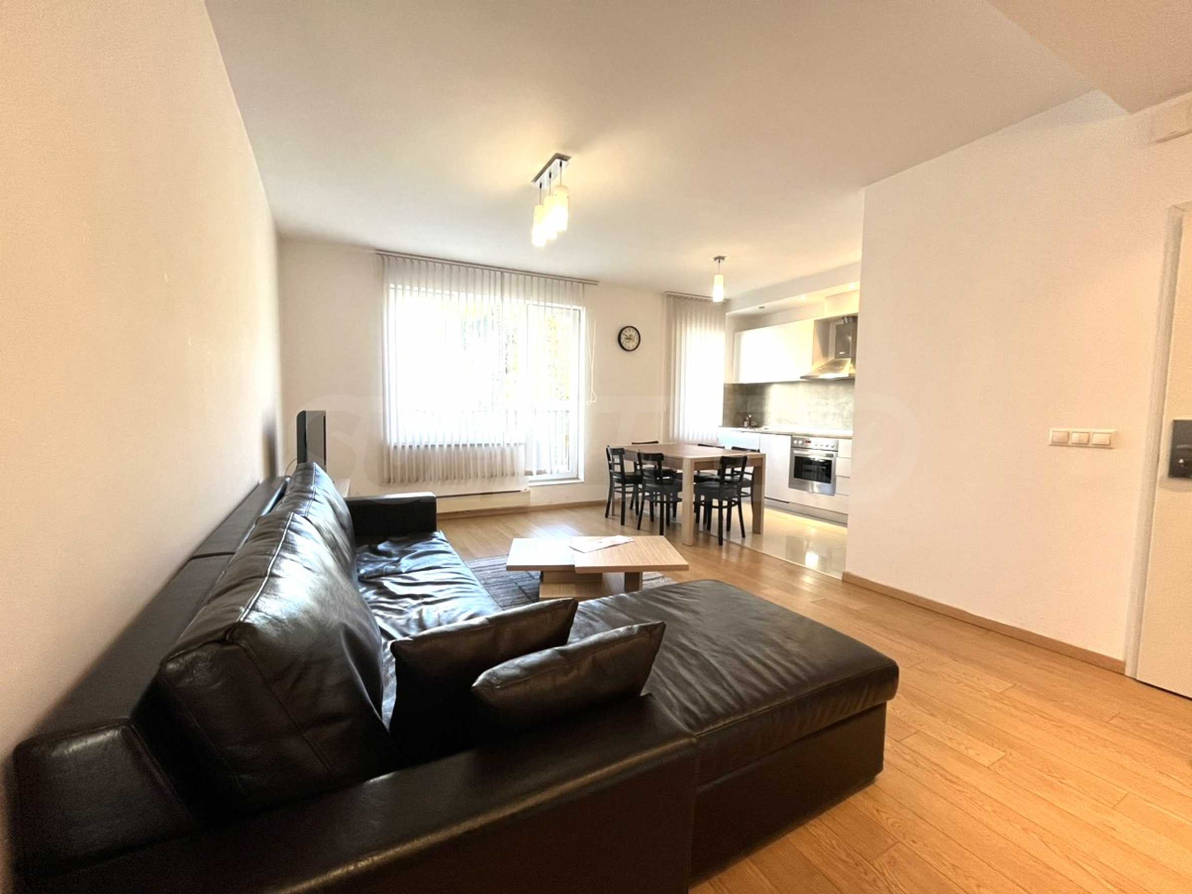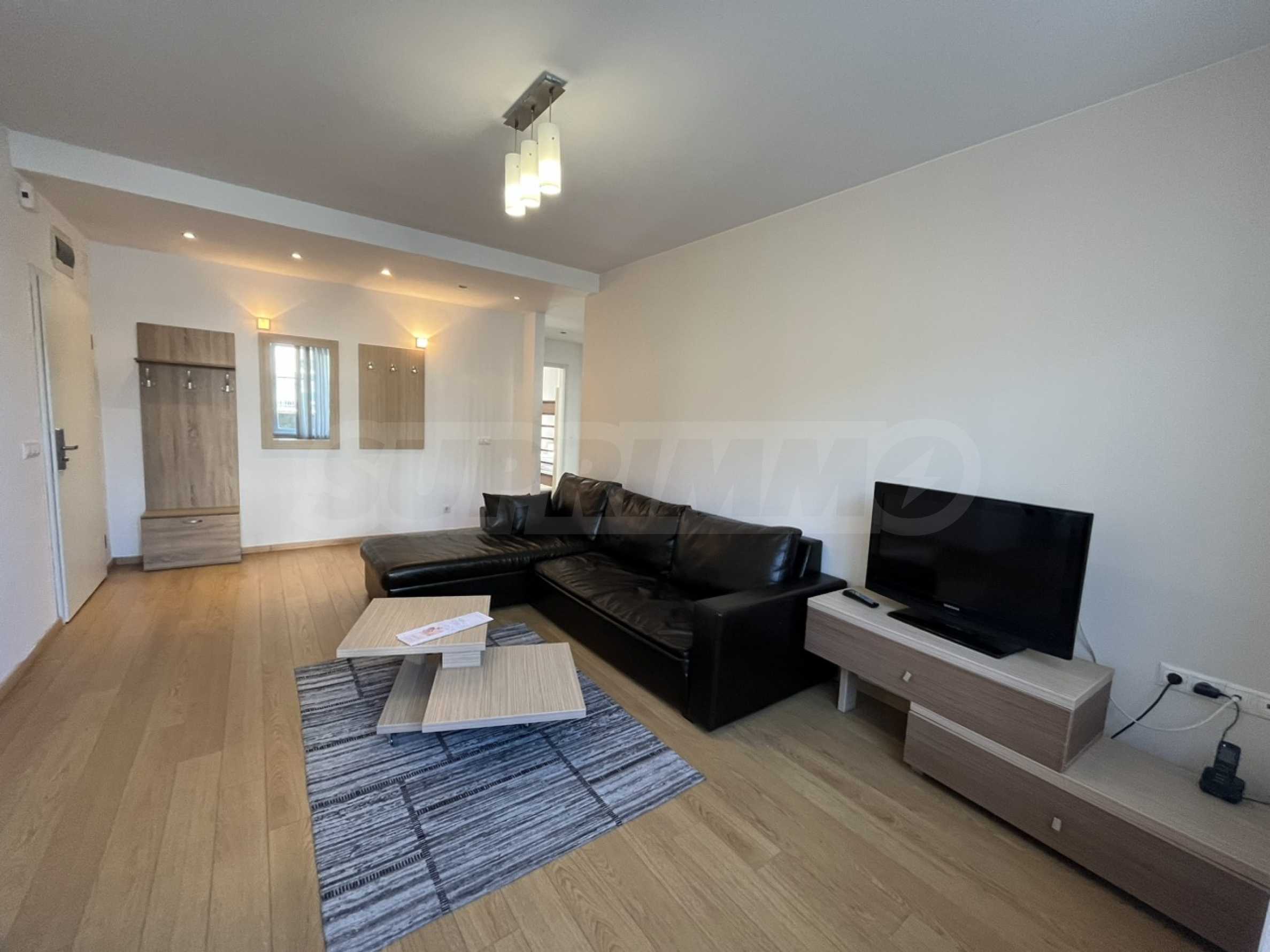 Жилището е с индивидуален дизайн, с голямо внимание към детайлите. В декорацията са използвани само най-висококачествените и естествени материали. Просторната всекидневна разполага с мека мебел и бяла кухня, която е напълно оборудвана с висок клас техника: фурна, котлони и хладилник.