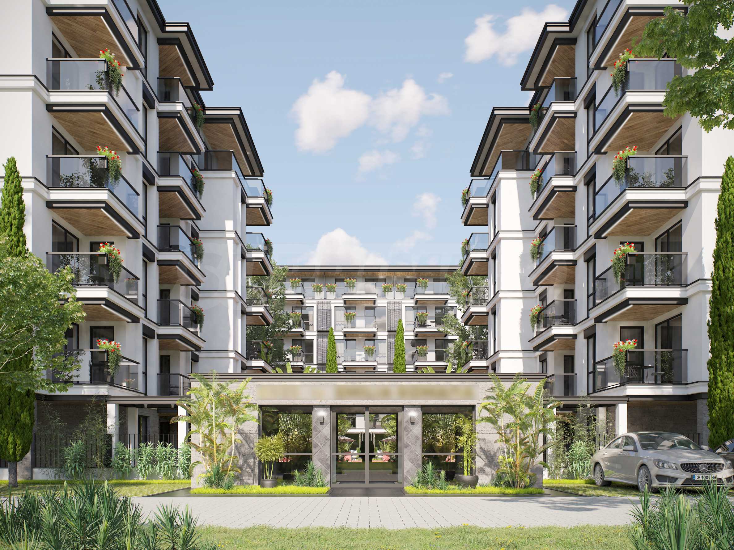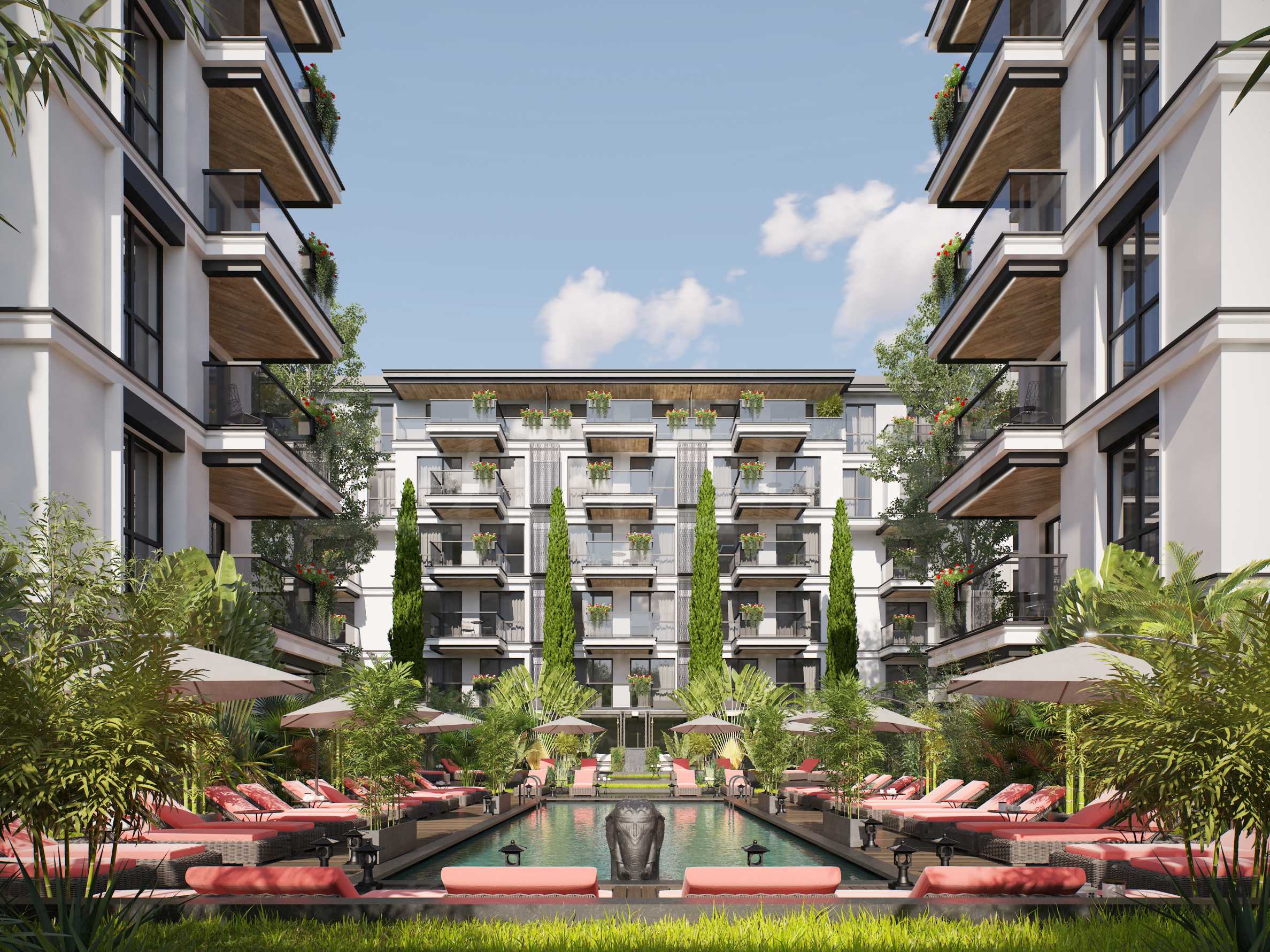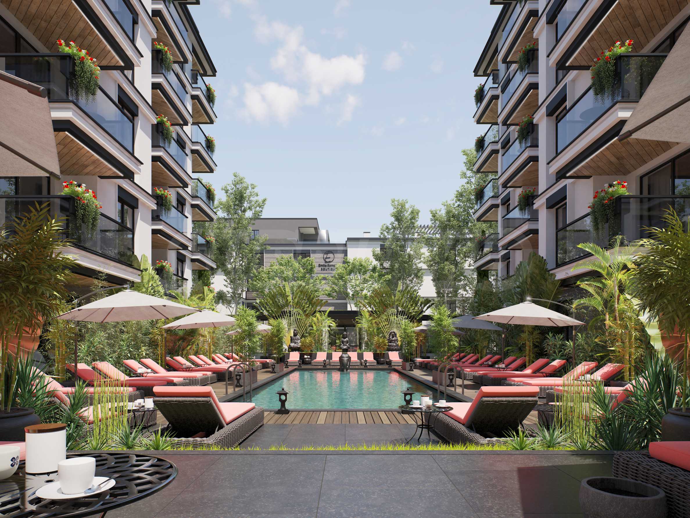 Външната рецепция ще свързва Сгради 2 и 3 и ще обслужва менажирането на комплекса и отдаване на апартаментите под наем за клиентите, които са избрали да закупят имота си с инвестиционна цел. Всяка от двете сгради ще се състои от 31 бр. апартаменти, разпределени на 6 етажа. В централната част на комплекса ще бъде разположен басейн за възрастни в азиатски стил, заобиколен от екзотични растения, създаващи усещането за спокойствие в райско кътче!