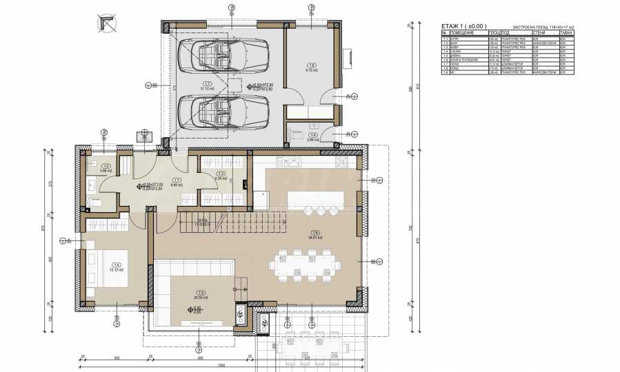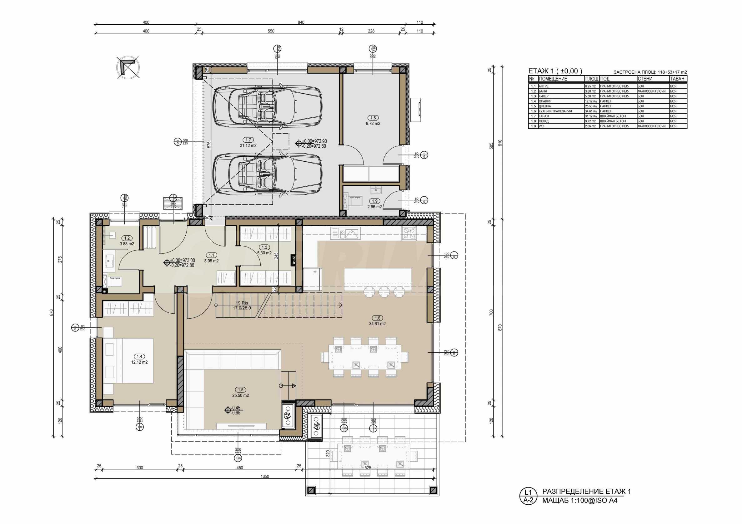 - На първо ниво е разположено антре, дневна с трапезария и кухня, склад, санитарно помещение, спалня/кабинет и гараж със склад към него.