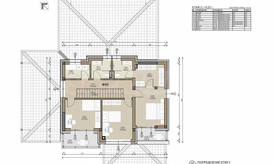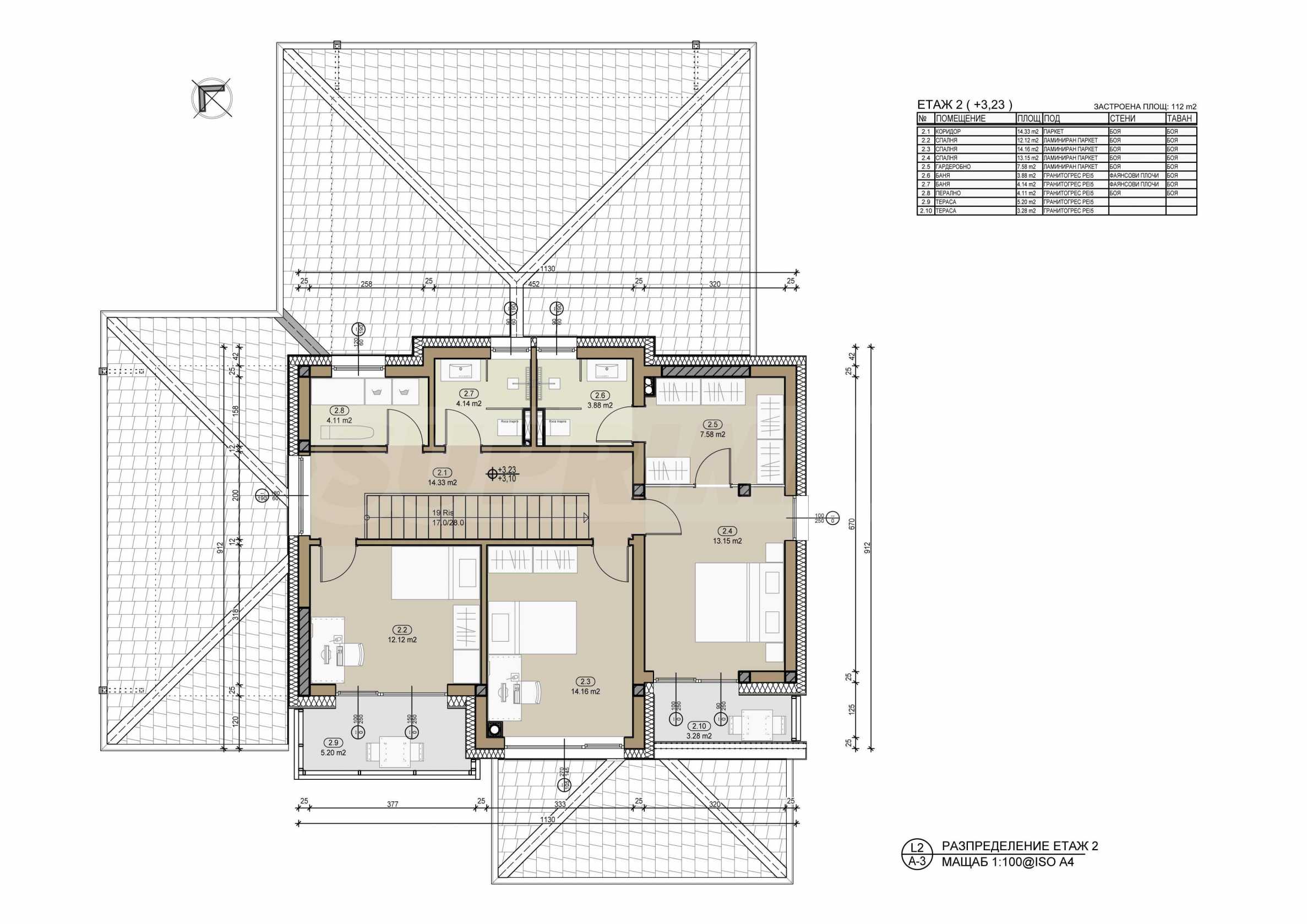 - На второ ниво се намират родителска спалня със самостоятелна баня с тоалетна, дрешник и тераса към нея, още две спални с обща баня и тераса, мокро помещение и коридор.