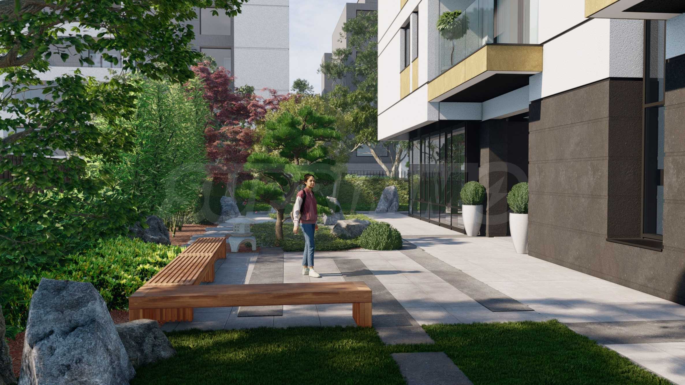 • Богато озеленяване с истинска Японска "дзен" градина, алеи за разходка с пейки и фитнес на открито.