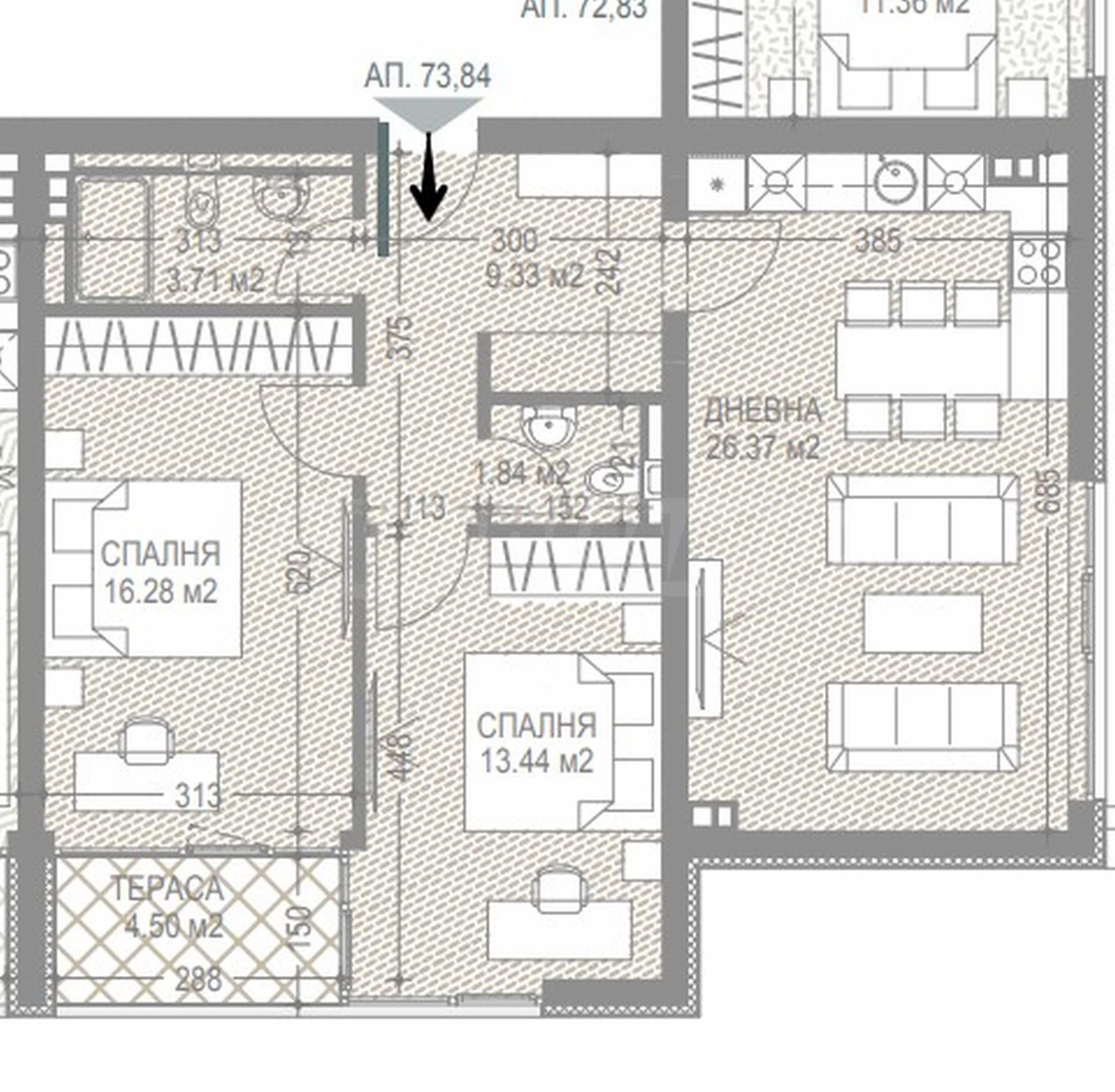 Апартамент №73 с обща площ 116.34 кв.м е разположен на 7-и етаж и се състои от антре/коридор, дневна с трапезария и кухня, две спални, тераса, баня с тоалетна и отделна тоалетна. В посочената цена и площ е включено мазе с чиста площ 3.09 кв.м.