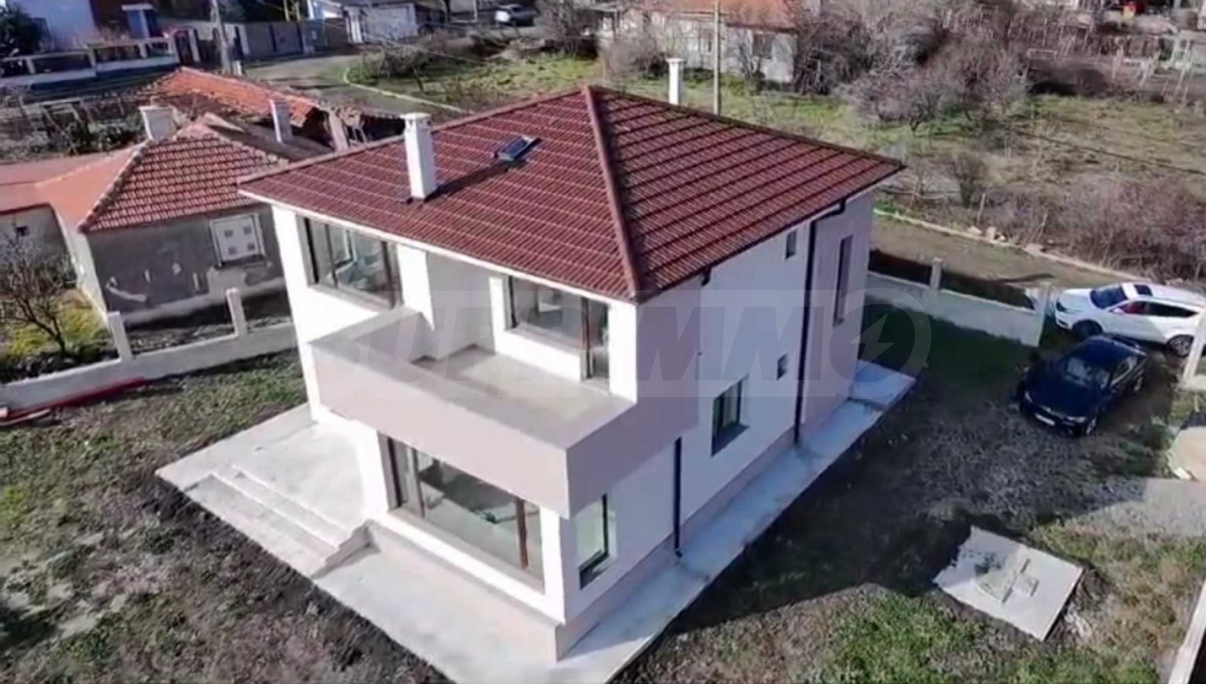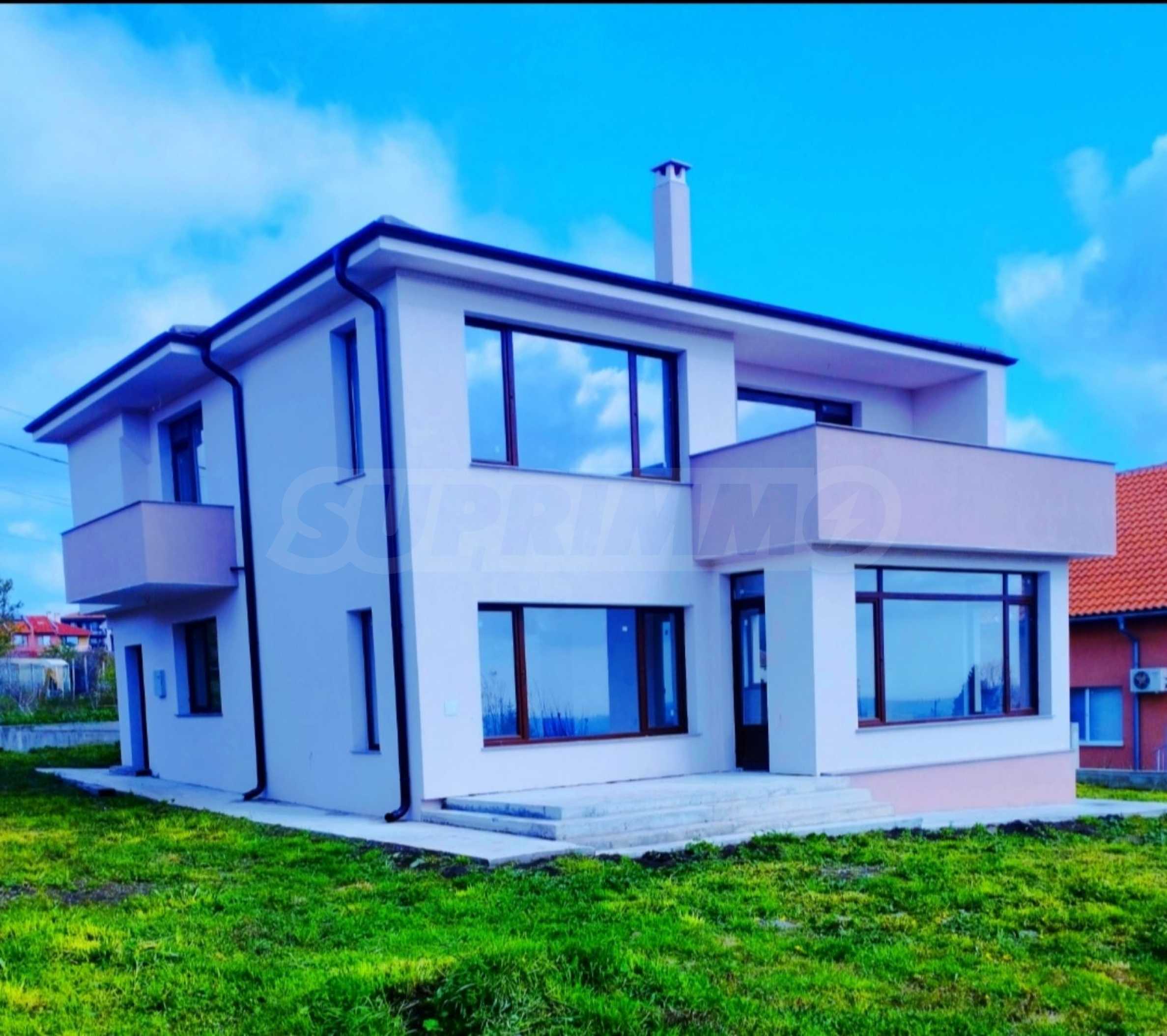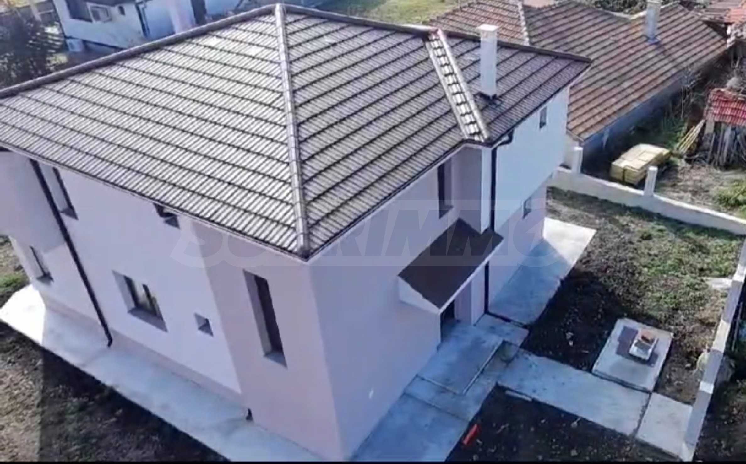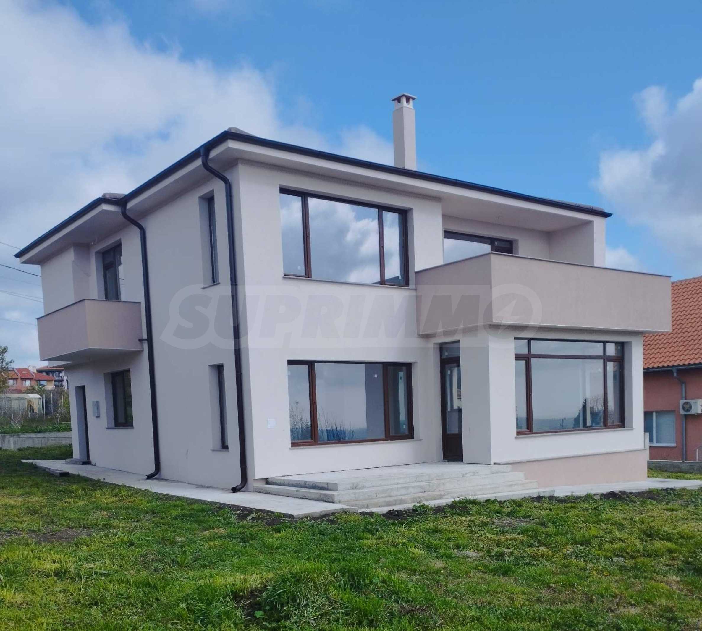 - Втори етаж: спалня с баня и тоалет, гардеробна, две детски спални, баня с тоалет, две панорамни тераси, падаща стълба към таванско помещение.