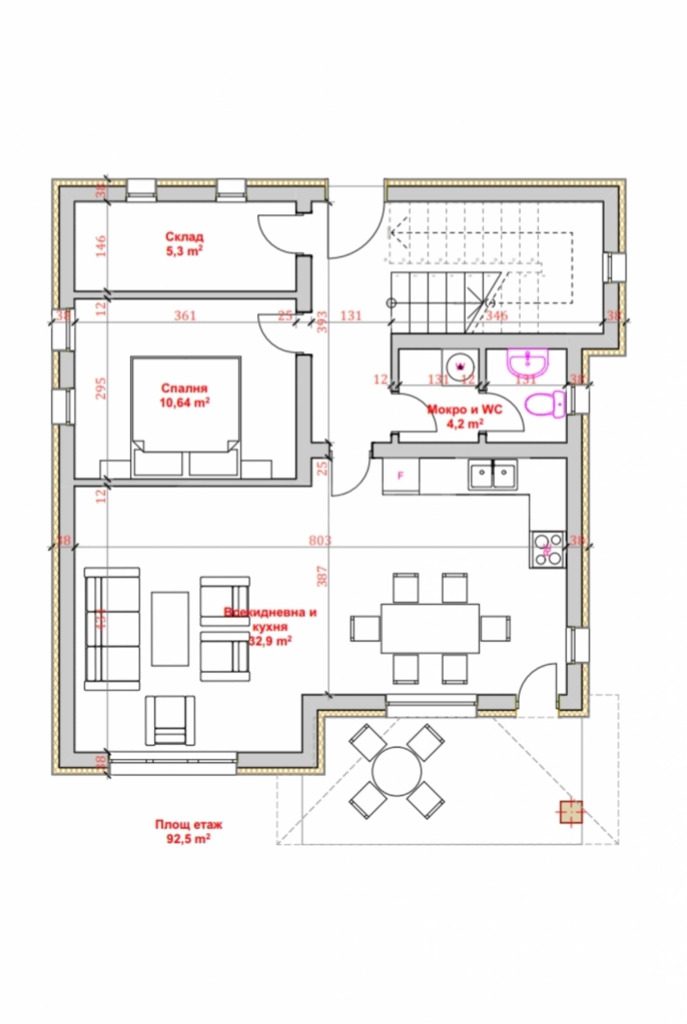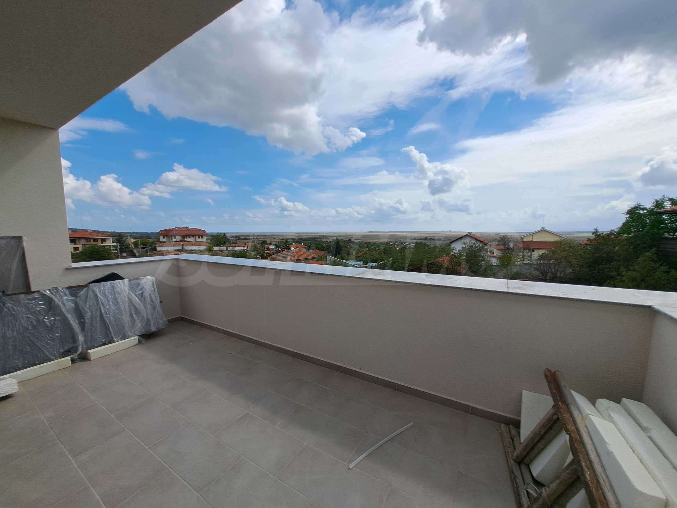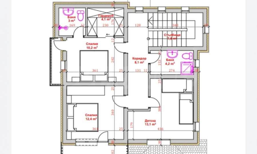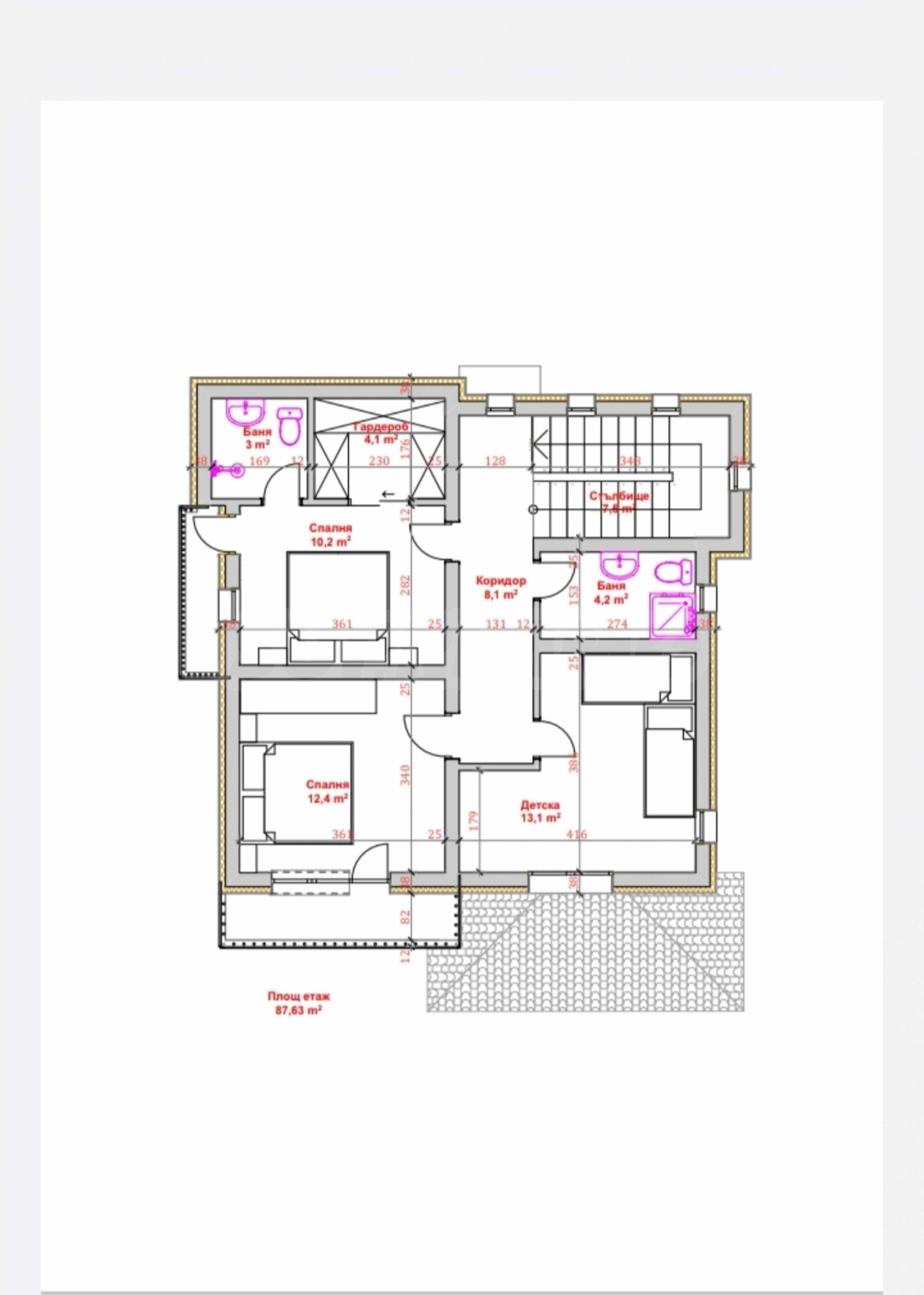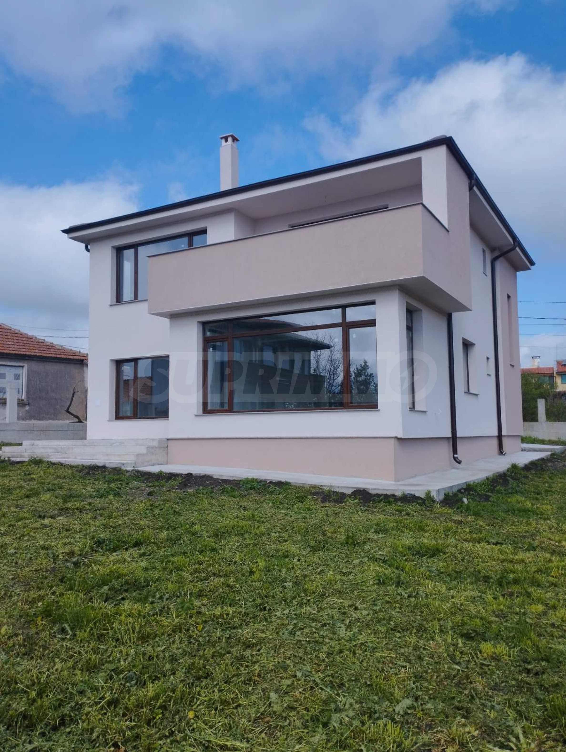 - Втори етаж: спалня с баня и тоалет, гардеробна, две детски спални, баня с тоалет, две панорамни тераси, падаща стълба към таванско помещение.