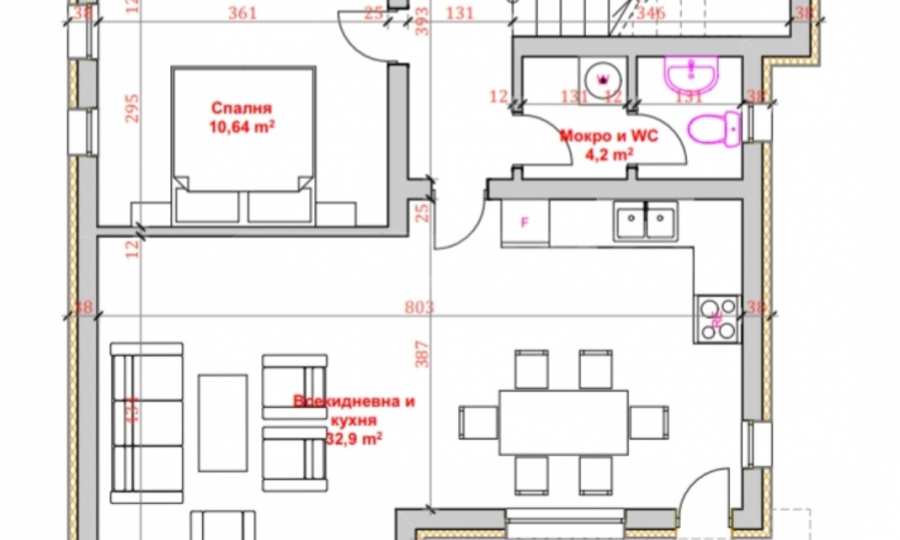 - Първи етаж: коридор, всекидневна с кухня, спалня, баня с тоалетна, мокро помещение, котелно с прекарани тръби за парно, вътрешно стълбище с подстълбищно пространство;