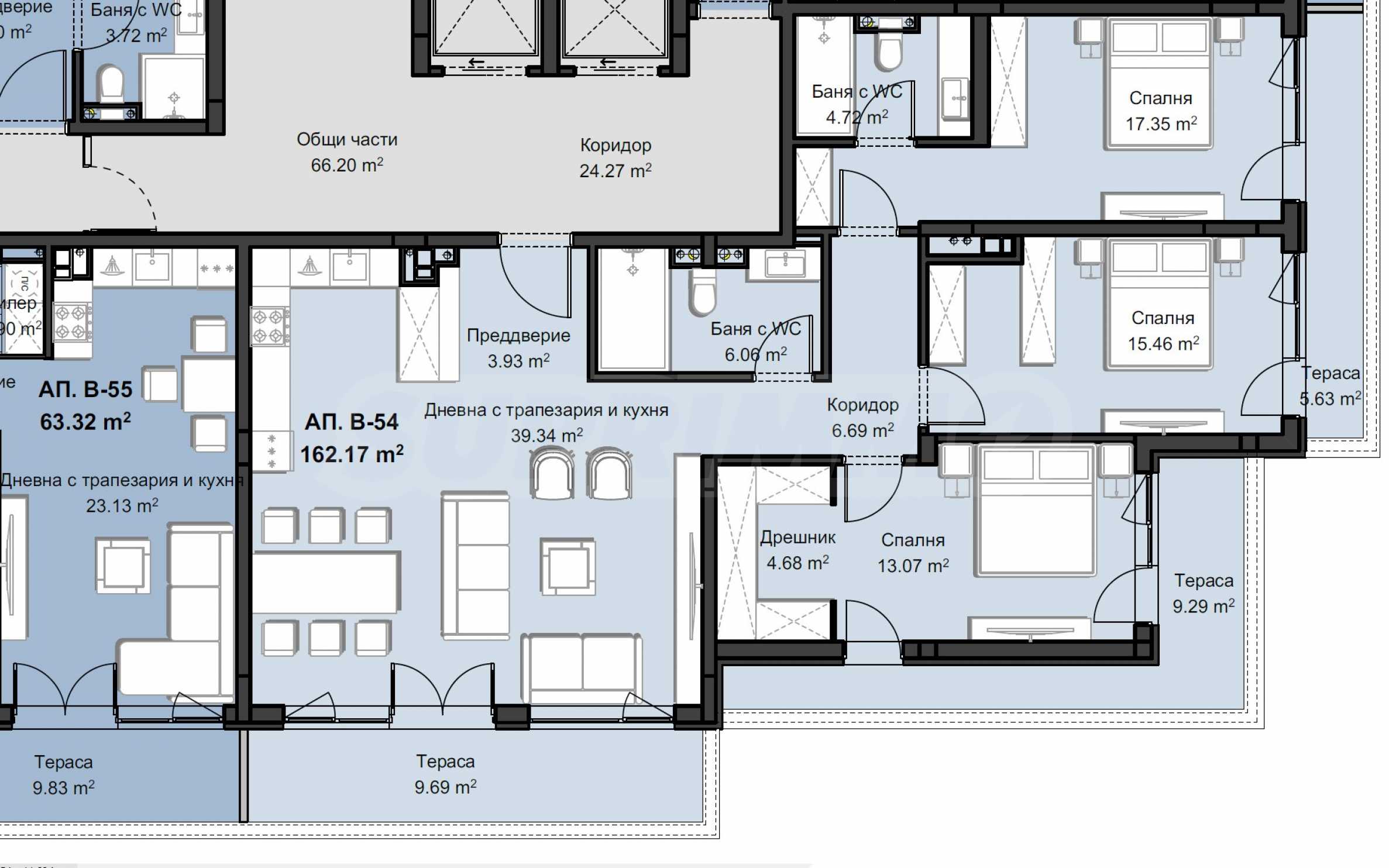 Имотът с обща площ от 199,24 кв.м е разположен на 8-и етаж от 8.
