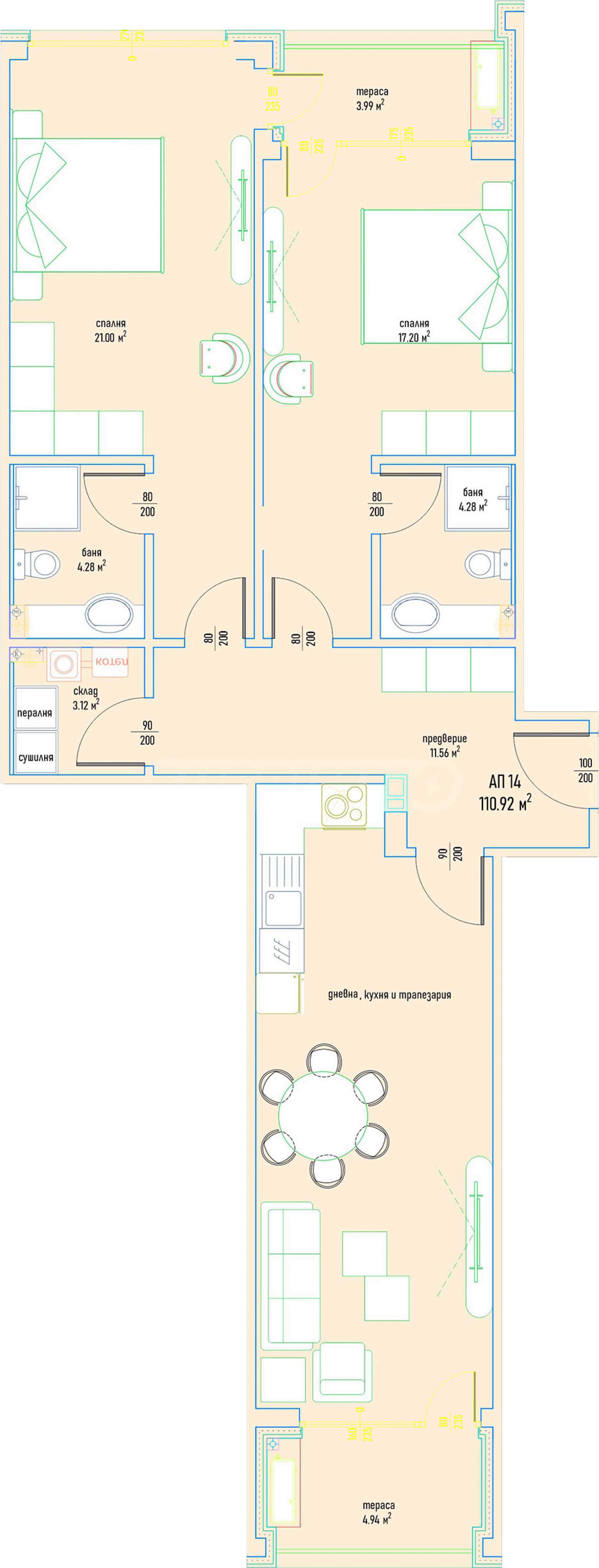 Имотът е разположен на трети етаж с обща площ 131.05 кв.м, (нетна площ 110.92 кв.м и общи части 20.13 кв.м), разпределена в антре, всекидневна с кухня и трапезария, две спални, две бани с тоалетни, склад и две тераси.