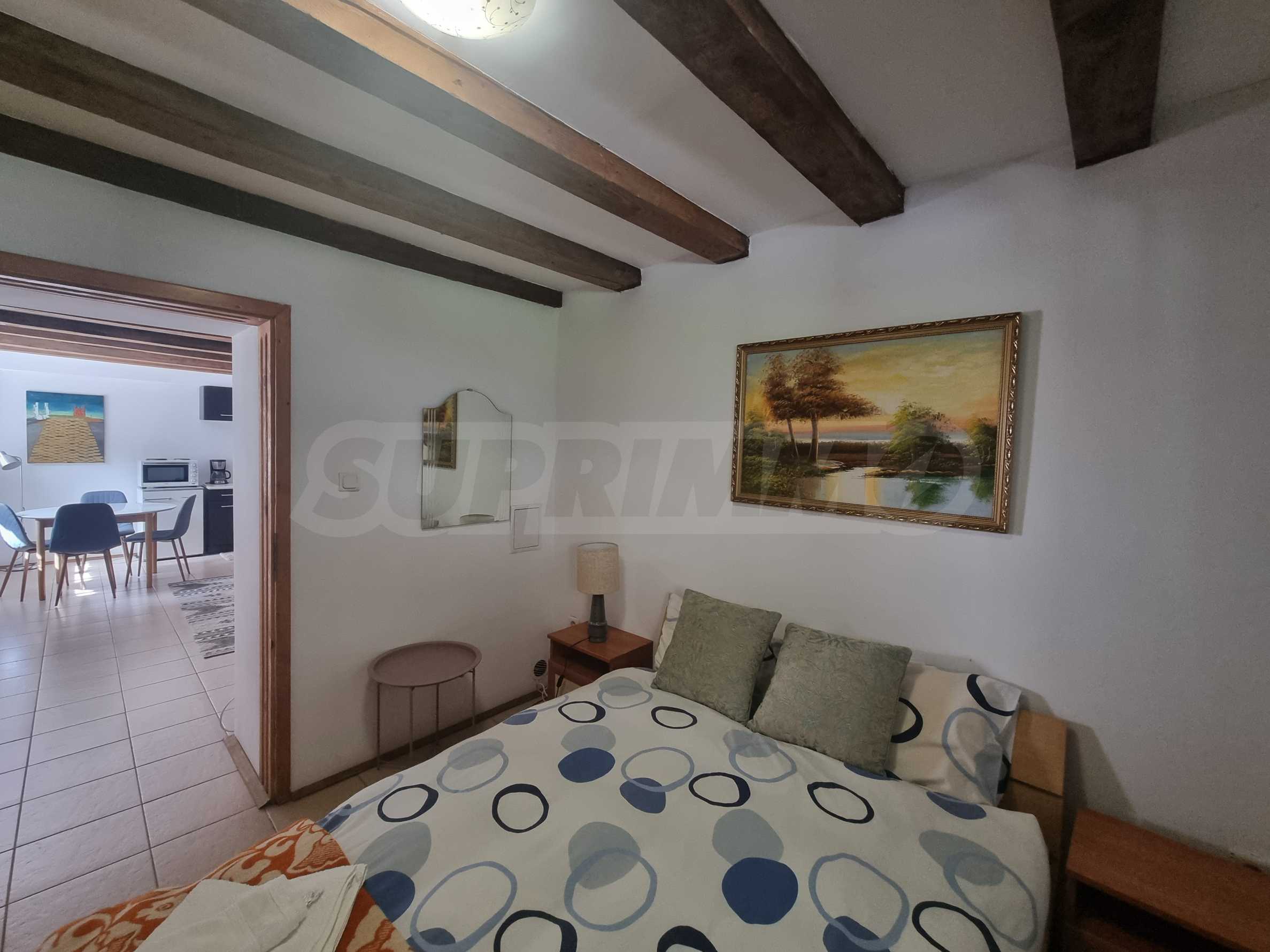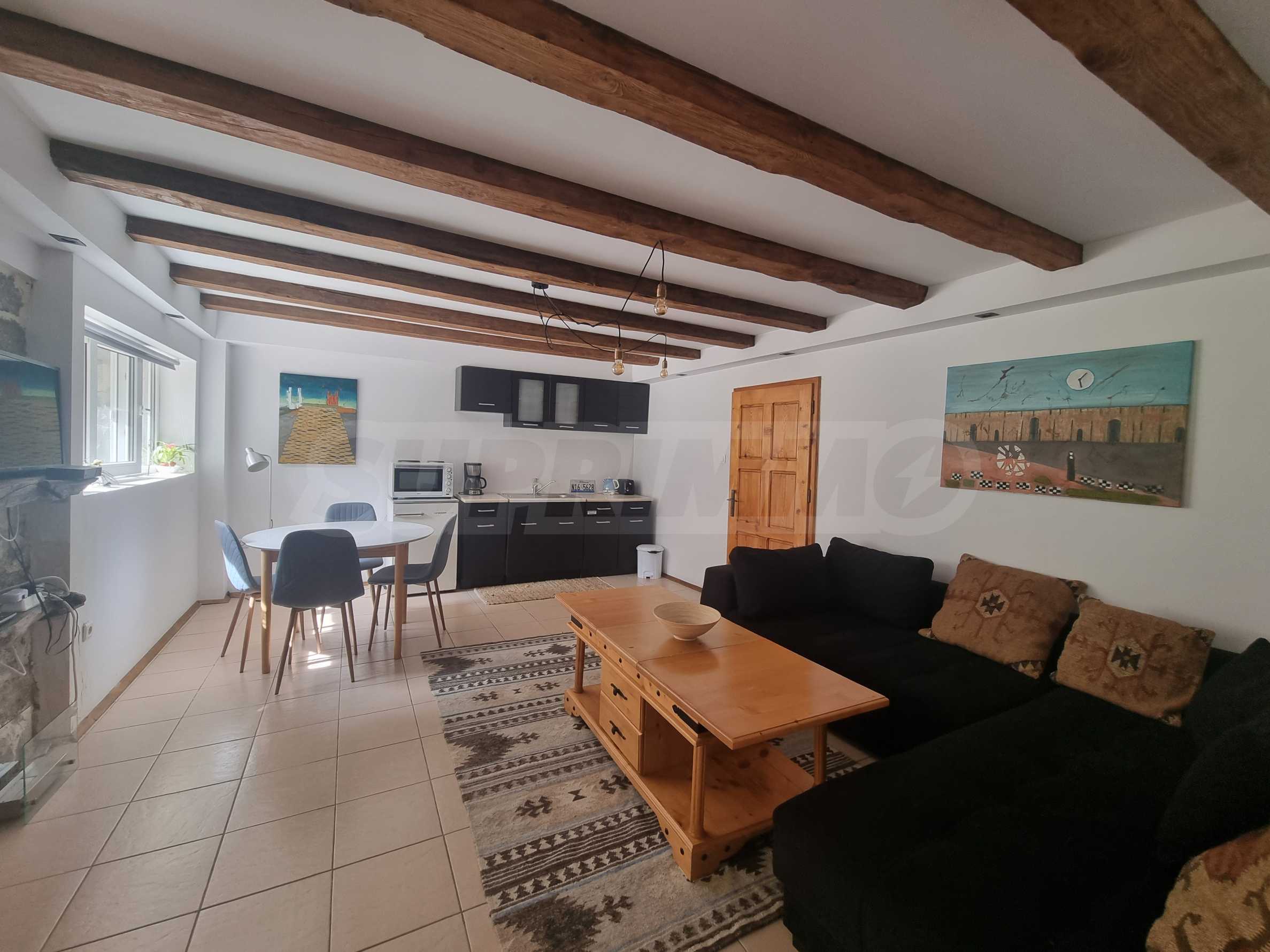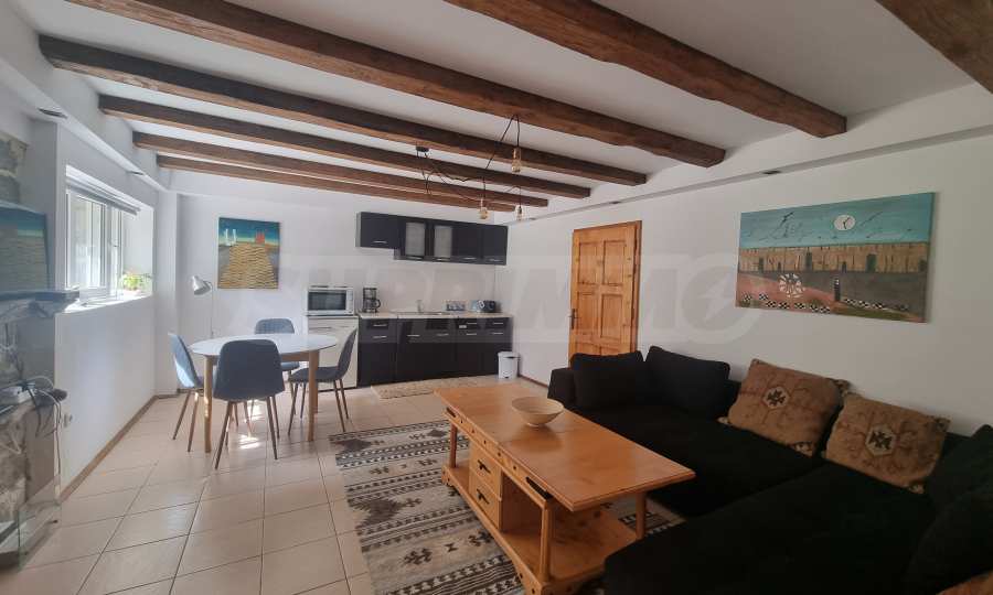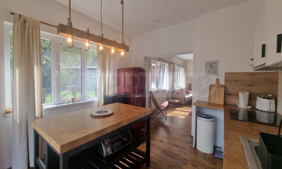 Първи етаж - дневна с кухня и трапезария, излаз към голяма веранда, спалня с баня с тоалетна и вана;