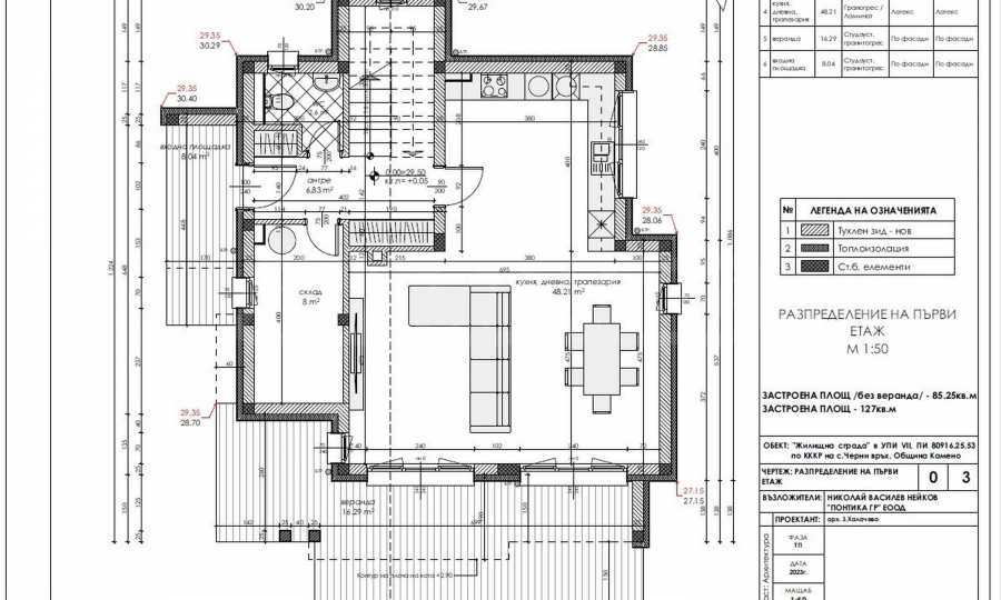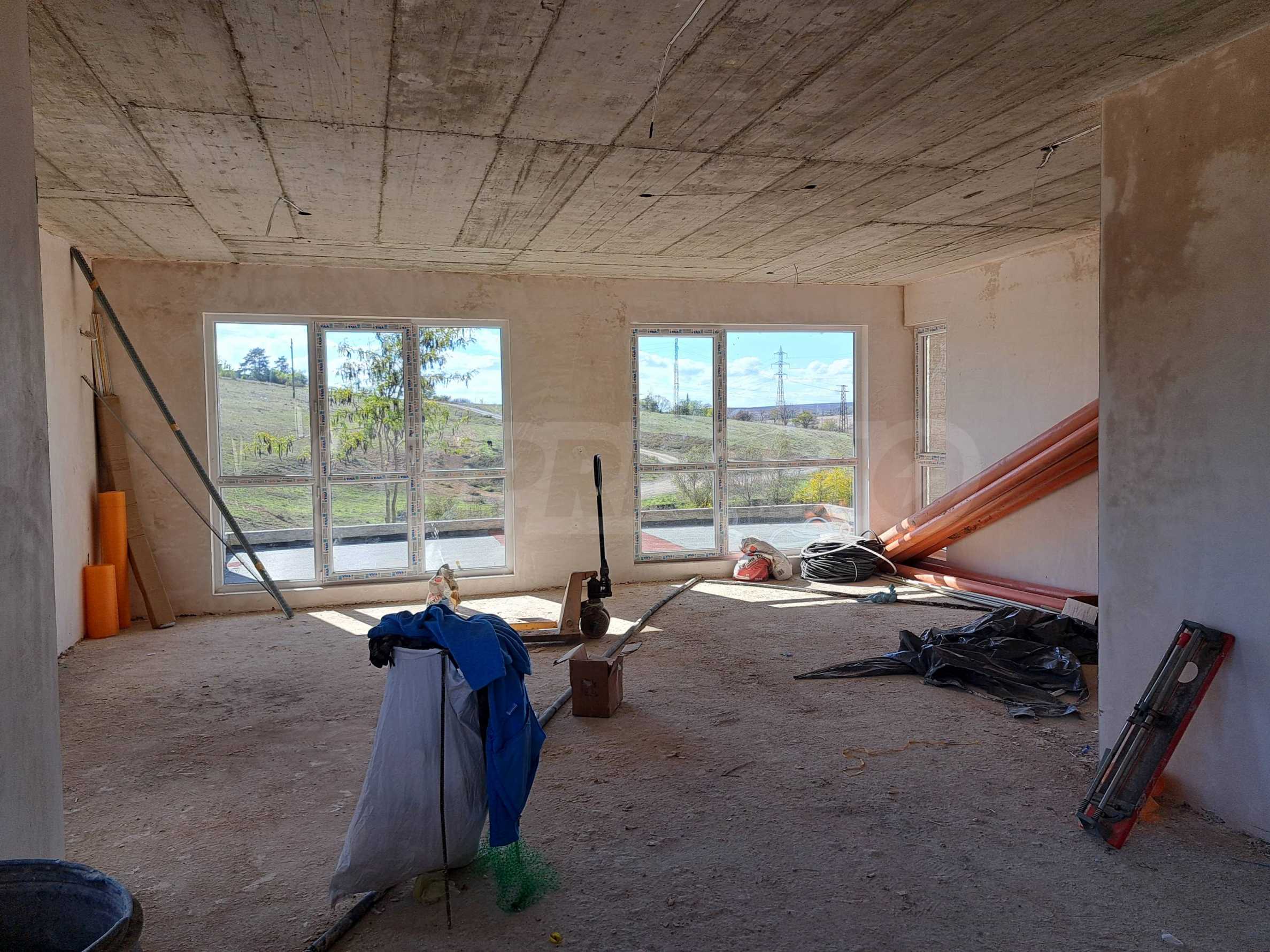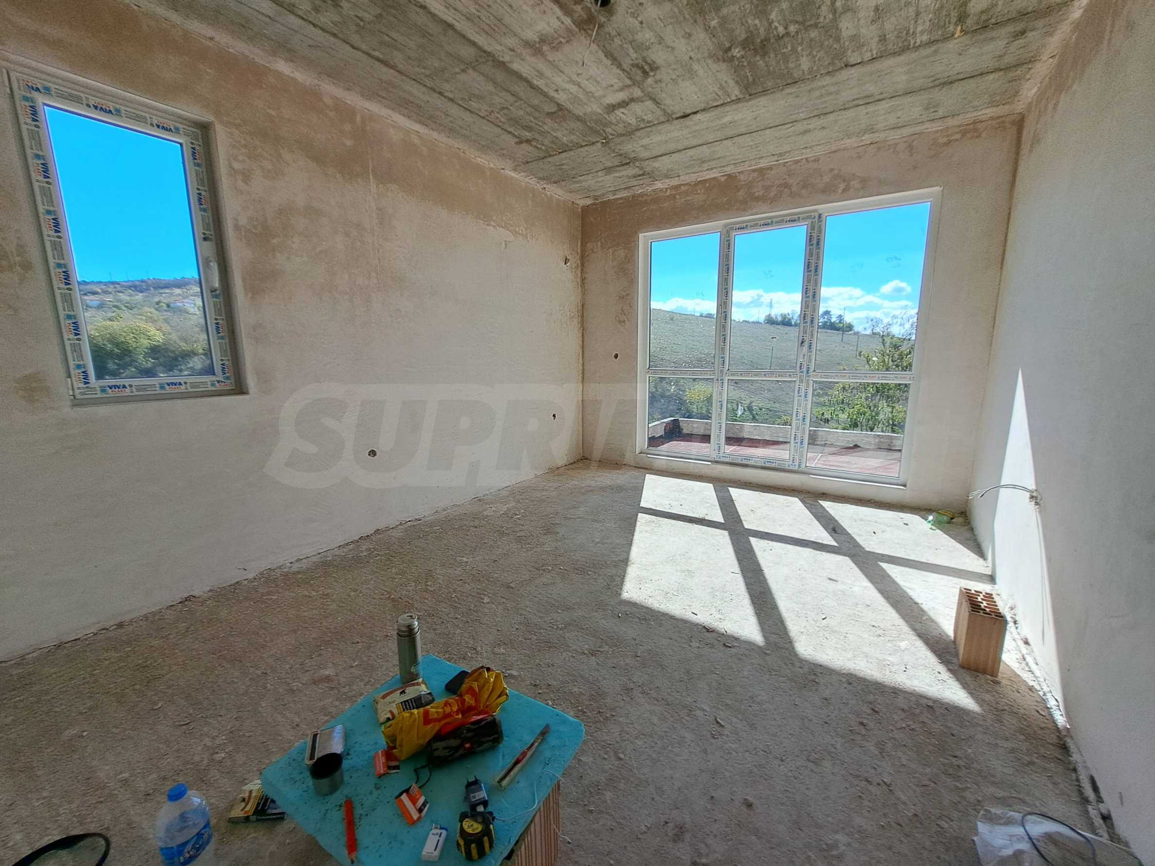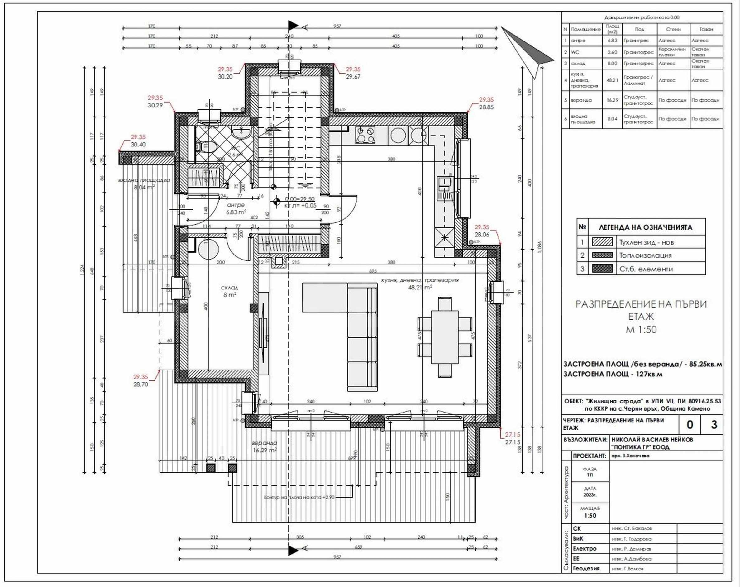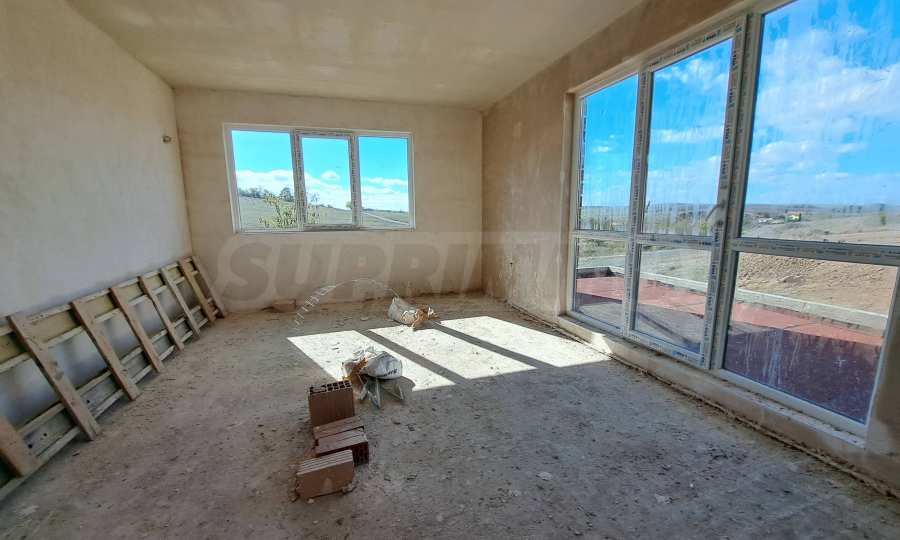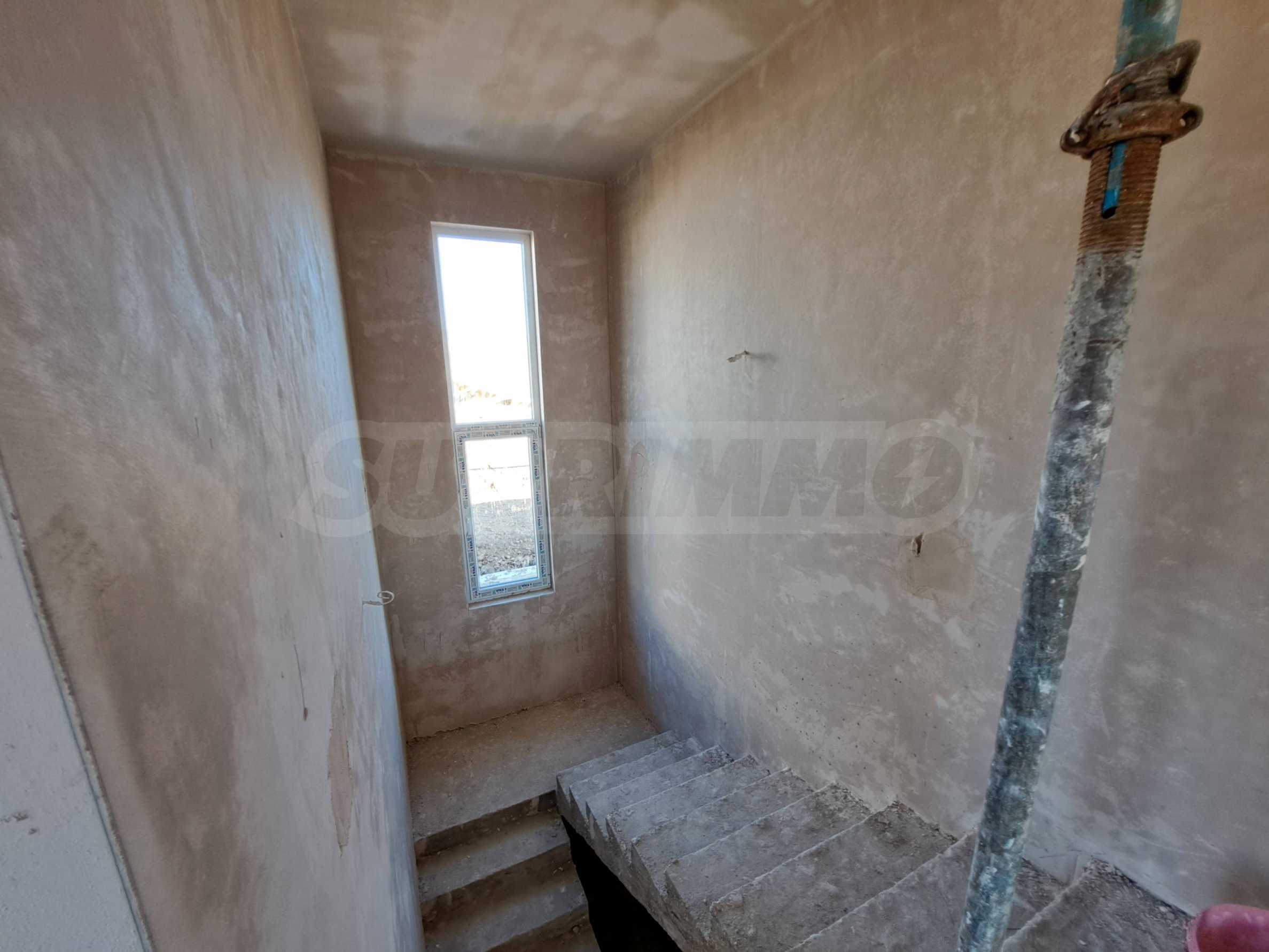 - Етаж 1: входно антре, просторна дневна с кухня и излаз на голяма южна веранда, кабинет/склад, тоалетна, стълбище;