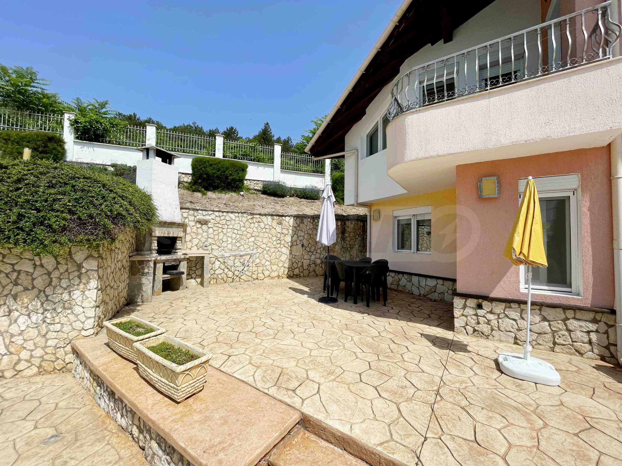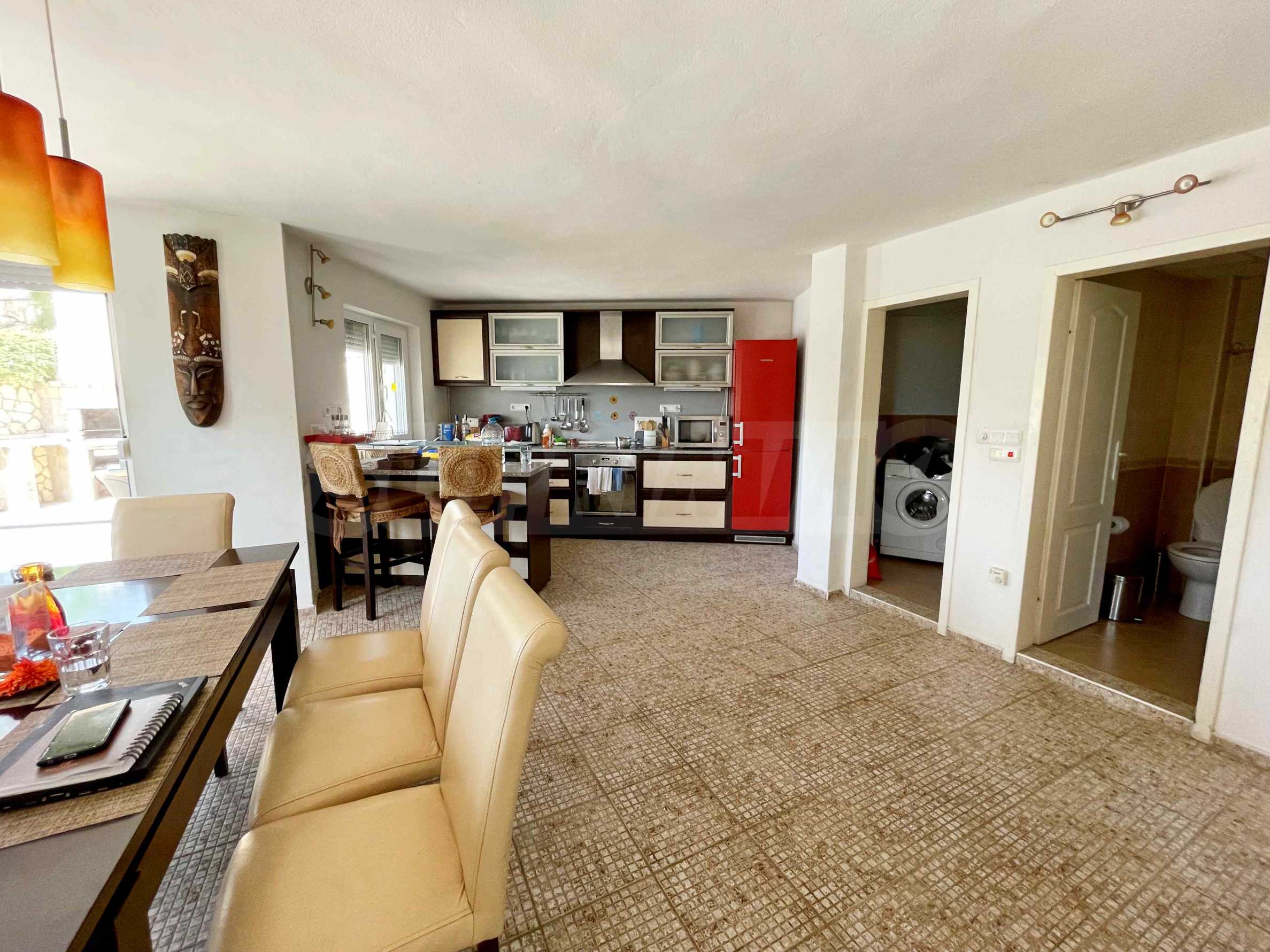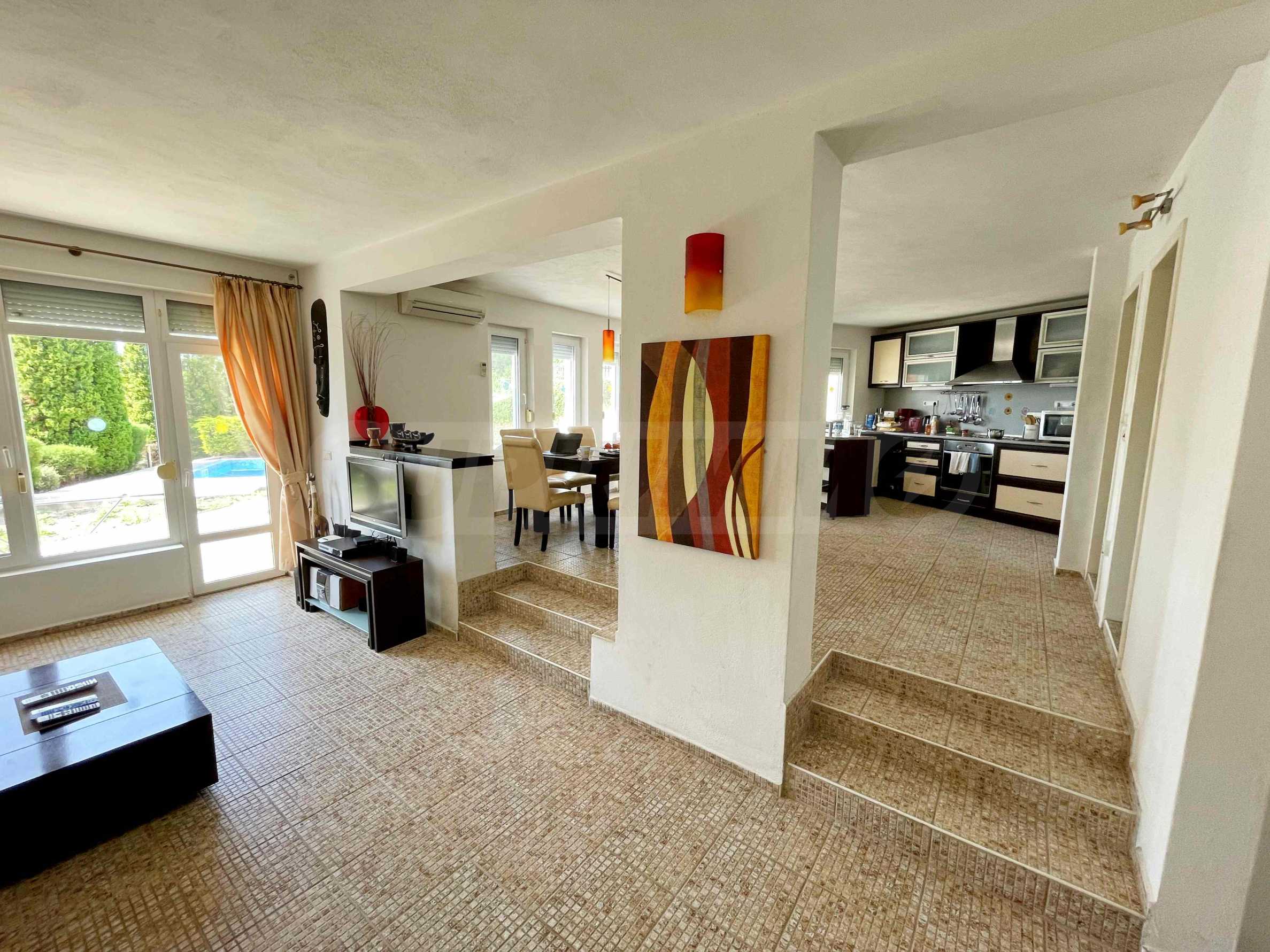 - първи етаж - просторна и слънчева дневна с отворен план към кухненска част, баня с тоалетна и килер/перално помещение, допълнителна стая, аранжирана като малка дневна. От дневната се излиза на прекрасна веранда, която води към басейна и градината;