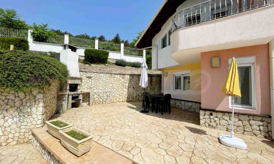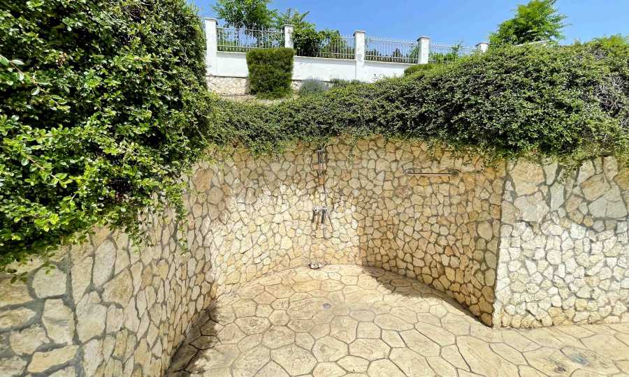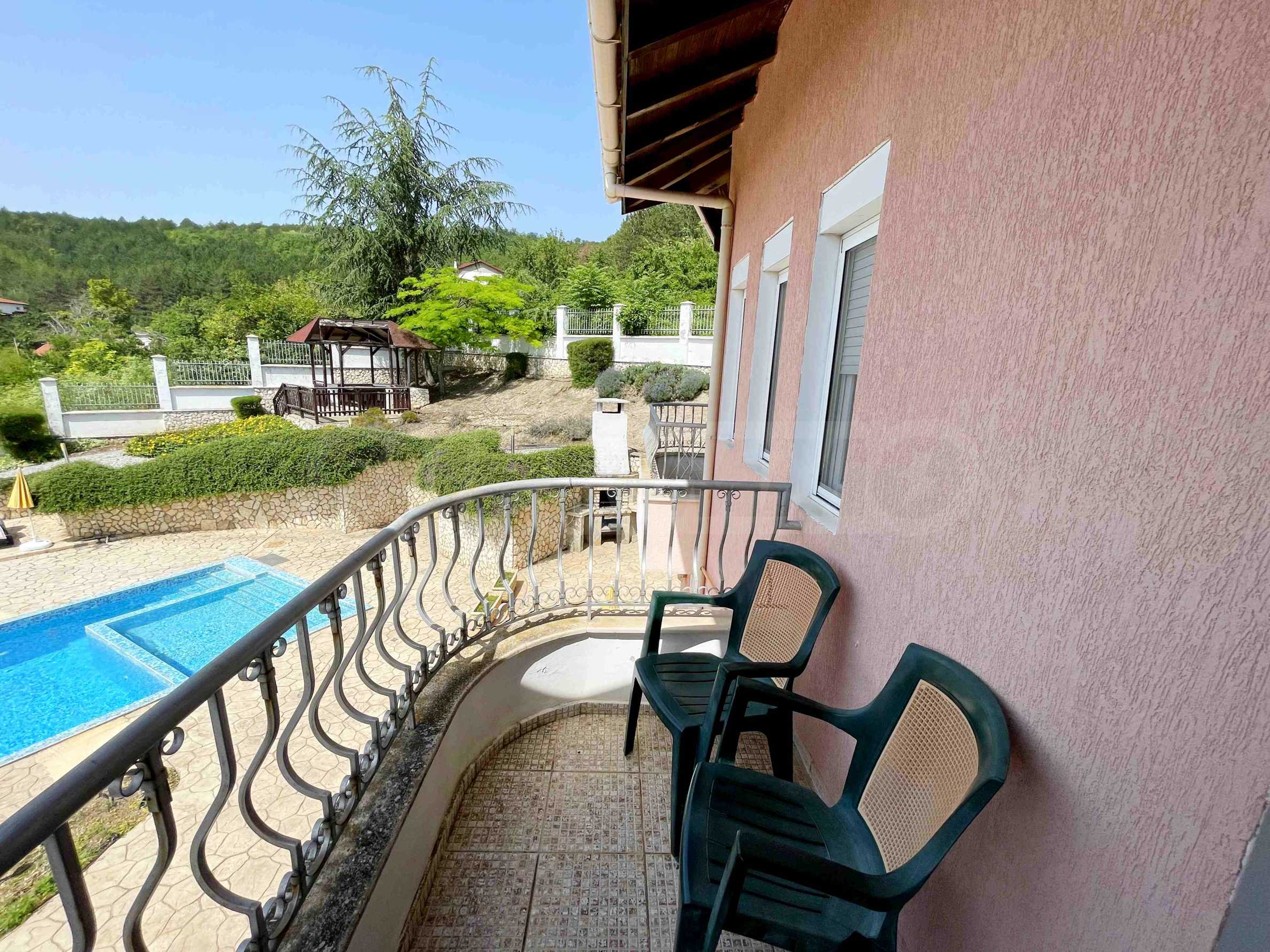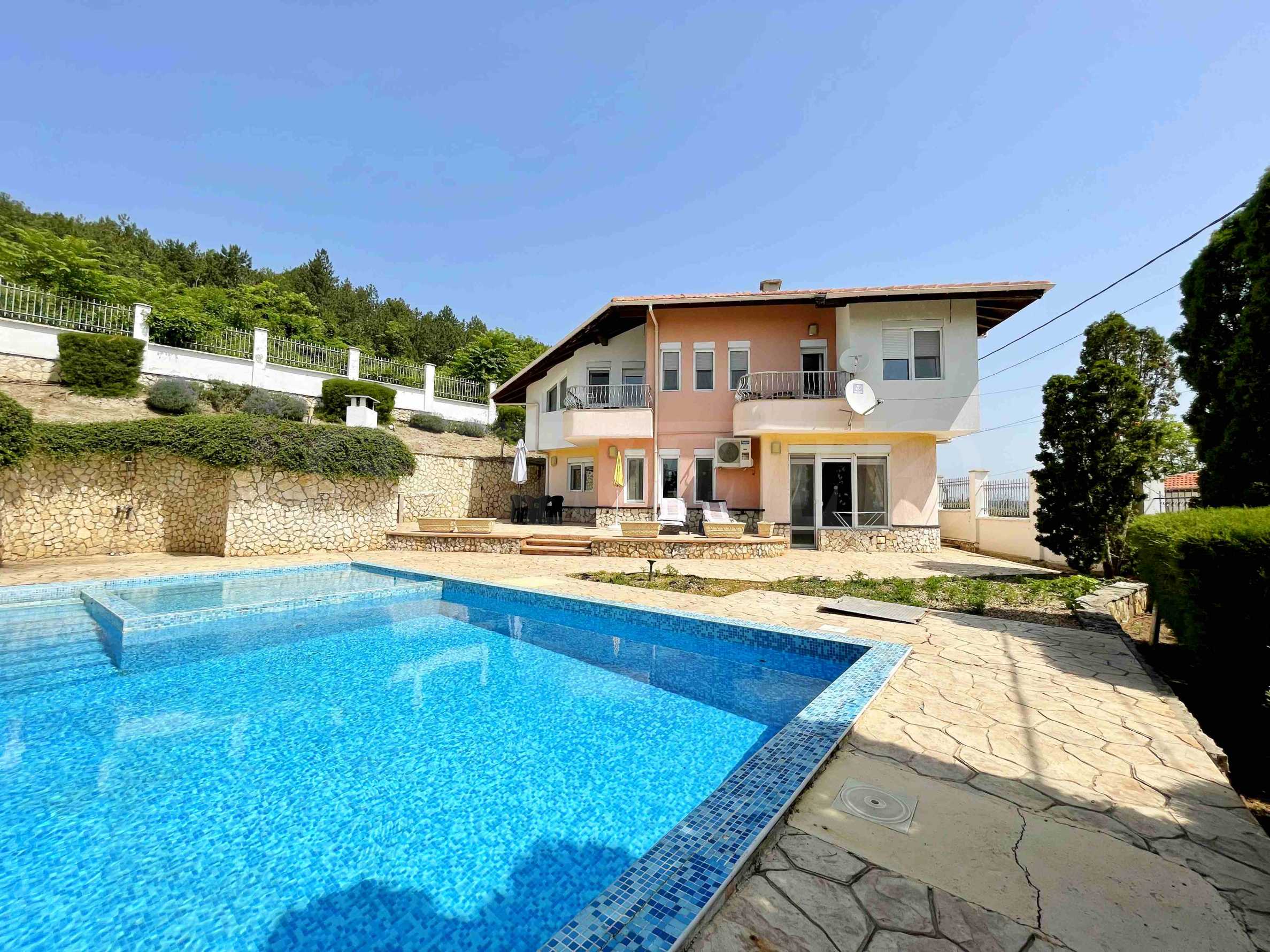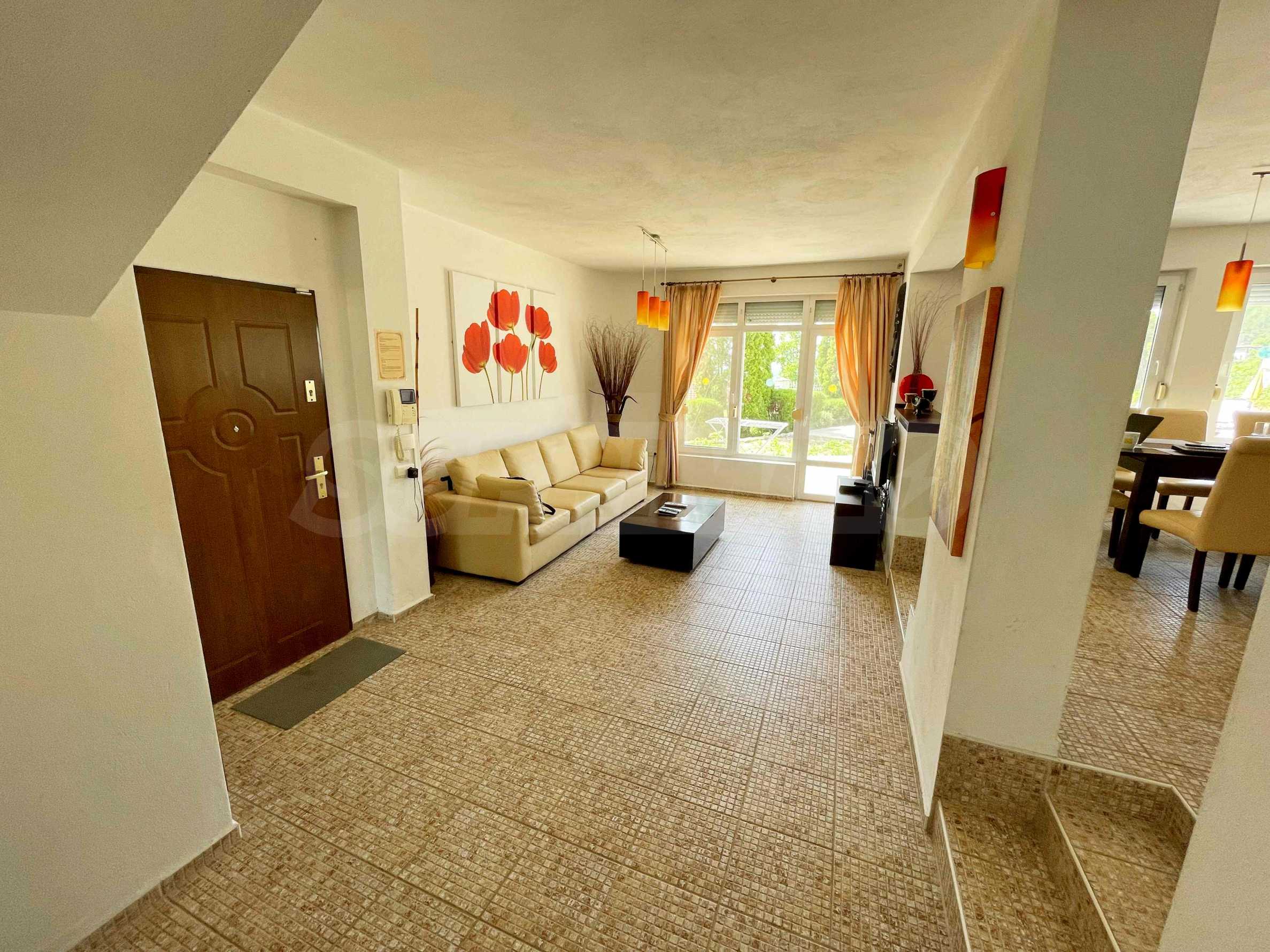 - първи етаж - просторна и слънчева дневна с отворен план към кухненска част, баня с тоалетна и килер/перално помещение, допълнителна стая, аранжирана като малка дневна. От дневната се излиза на прекрасна веранда, която води към басейна и градината;