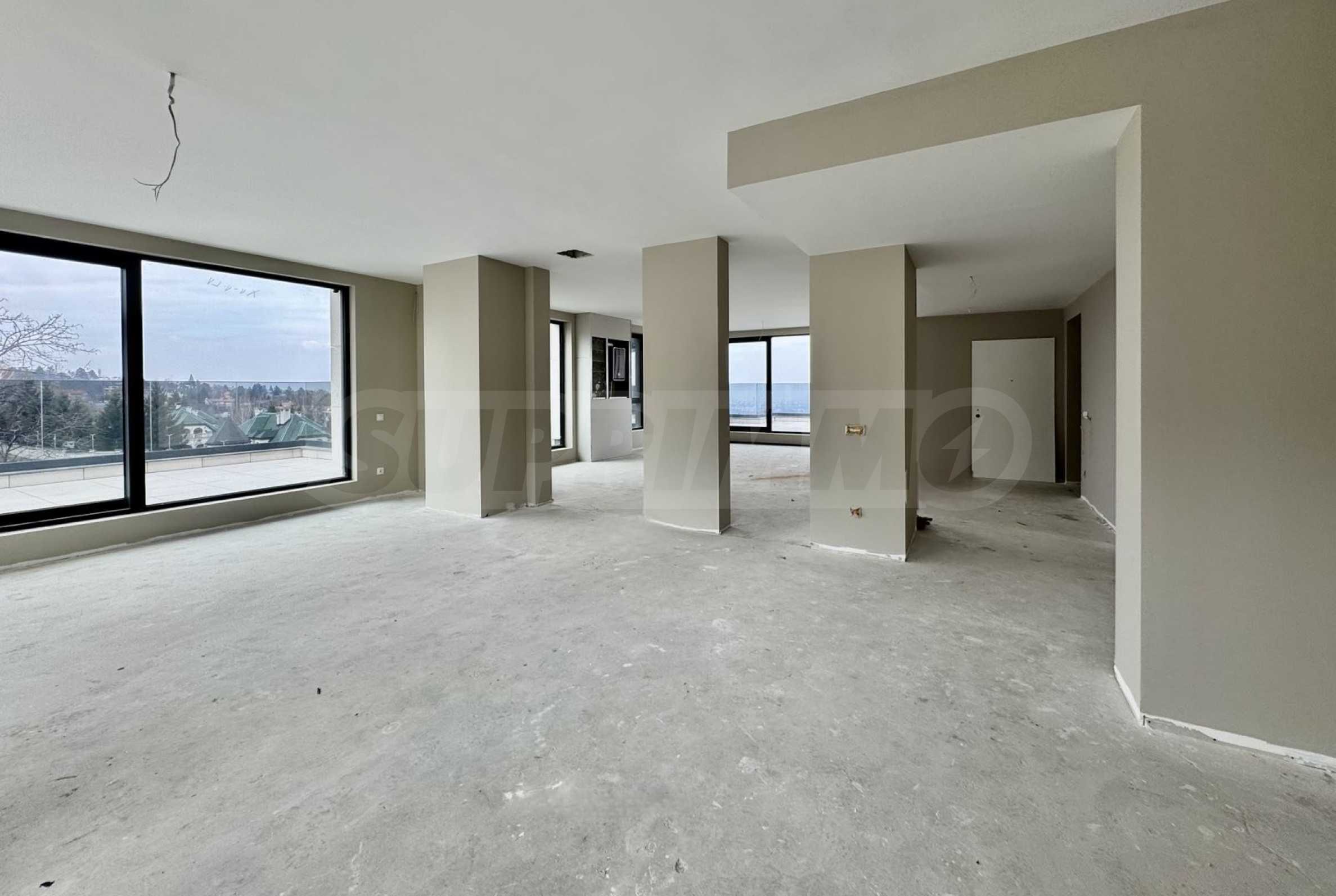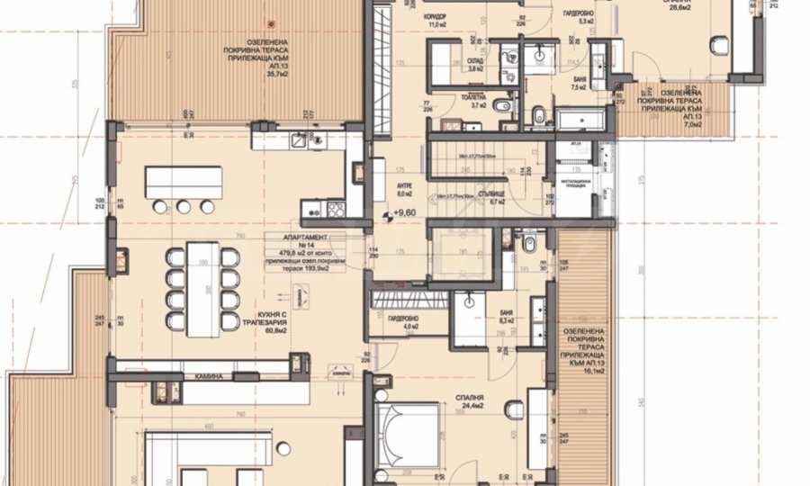 Апартаментът е с обща площ от 562.75 кв.м, от които прилежащи покривни тераси 193,90 кв.м и има следното разпределение: