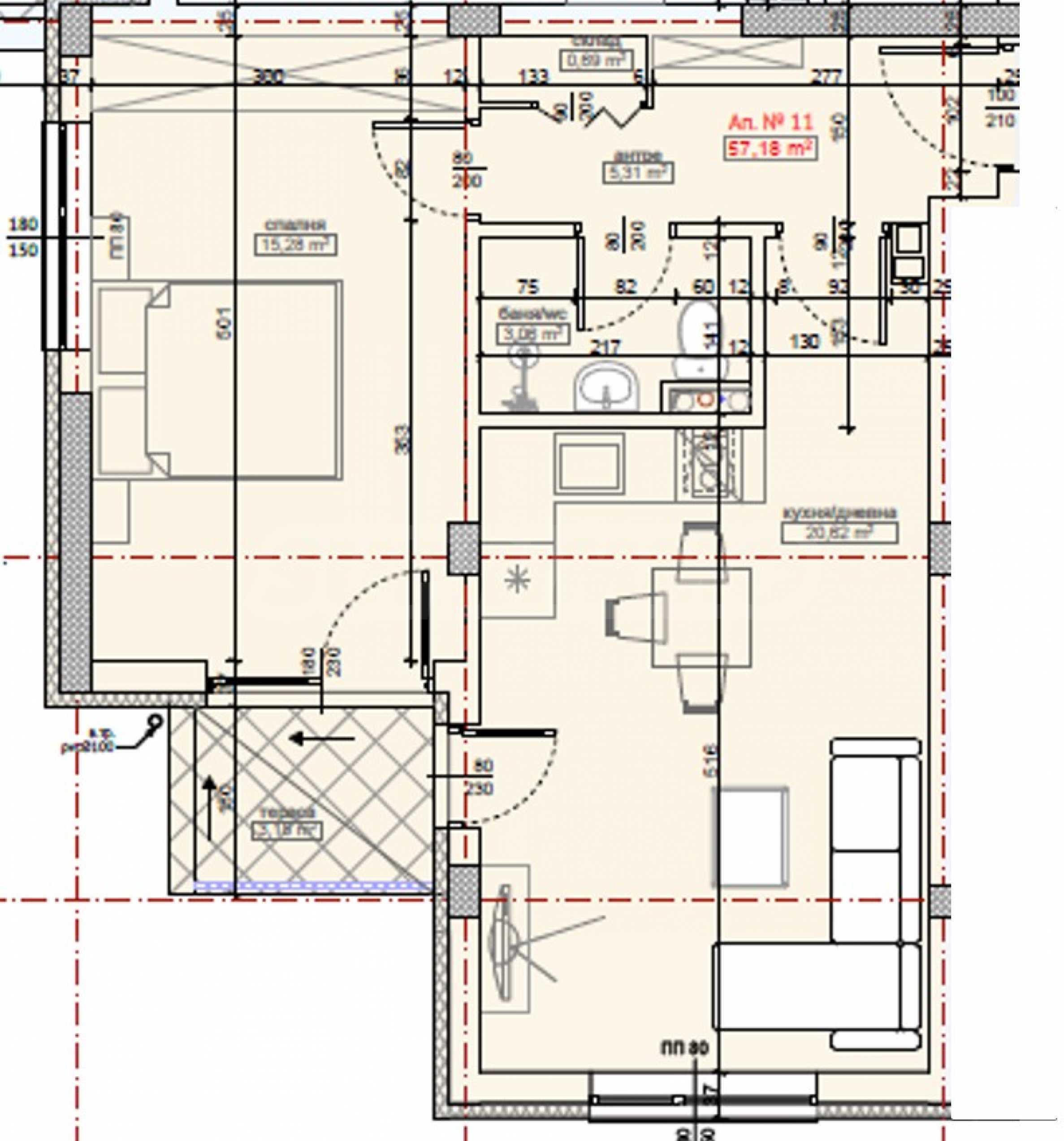 Имотът е с обща площ от 69,54 кв.м, разположен на 4-ти етаж и се състои от антре, дневна с кухня, спалня, склад, баня с тоалет и тераса.