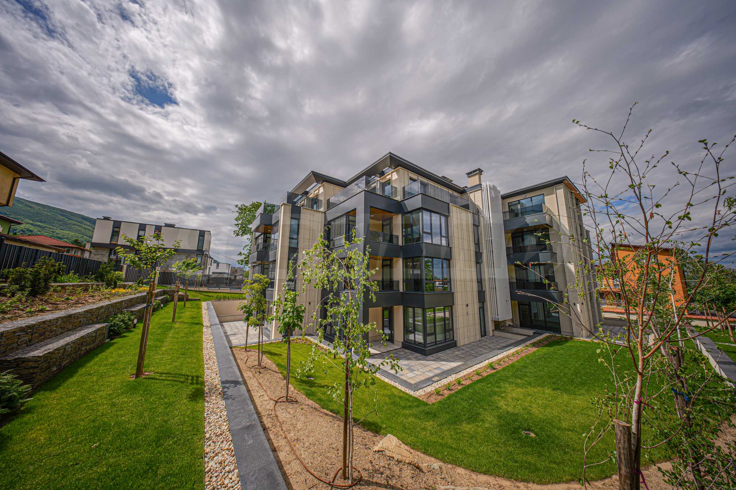 - вертикална планировка в комплекса - специален ландшафтен проект; наподобяващ паркова среда, алпинеуми.