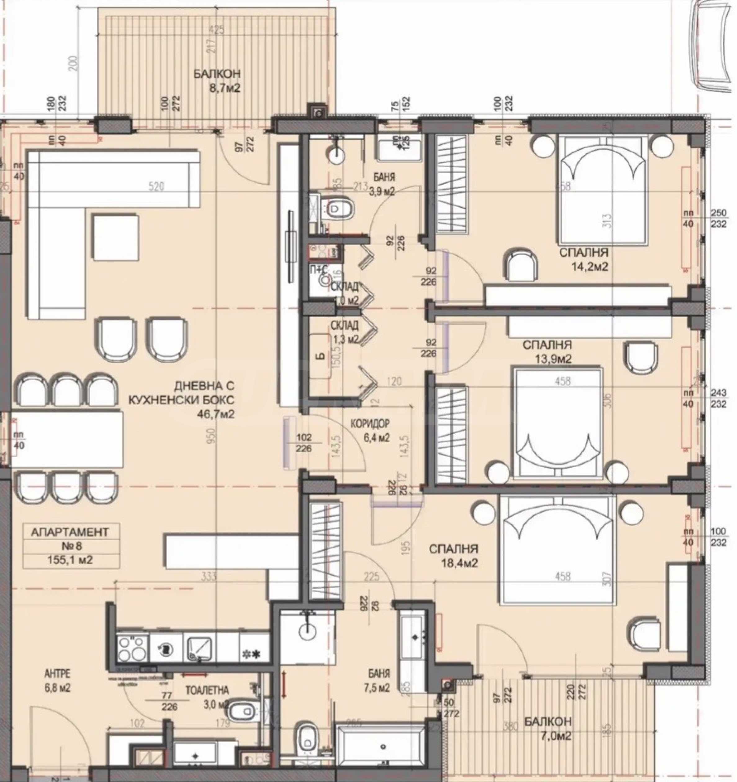 Апартаментът е с площ от 200.10 кв.м и има следното разпределение:
