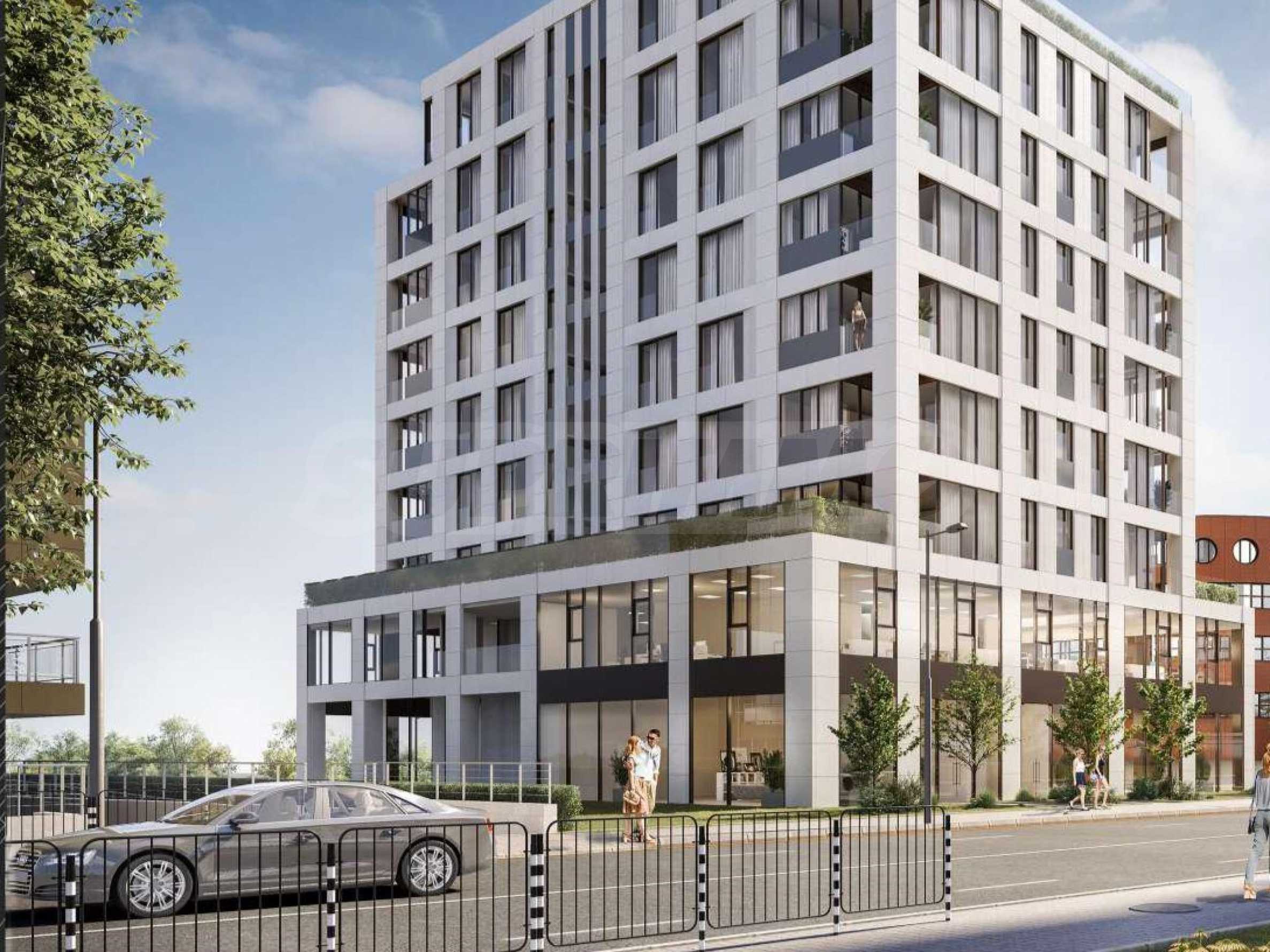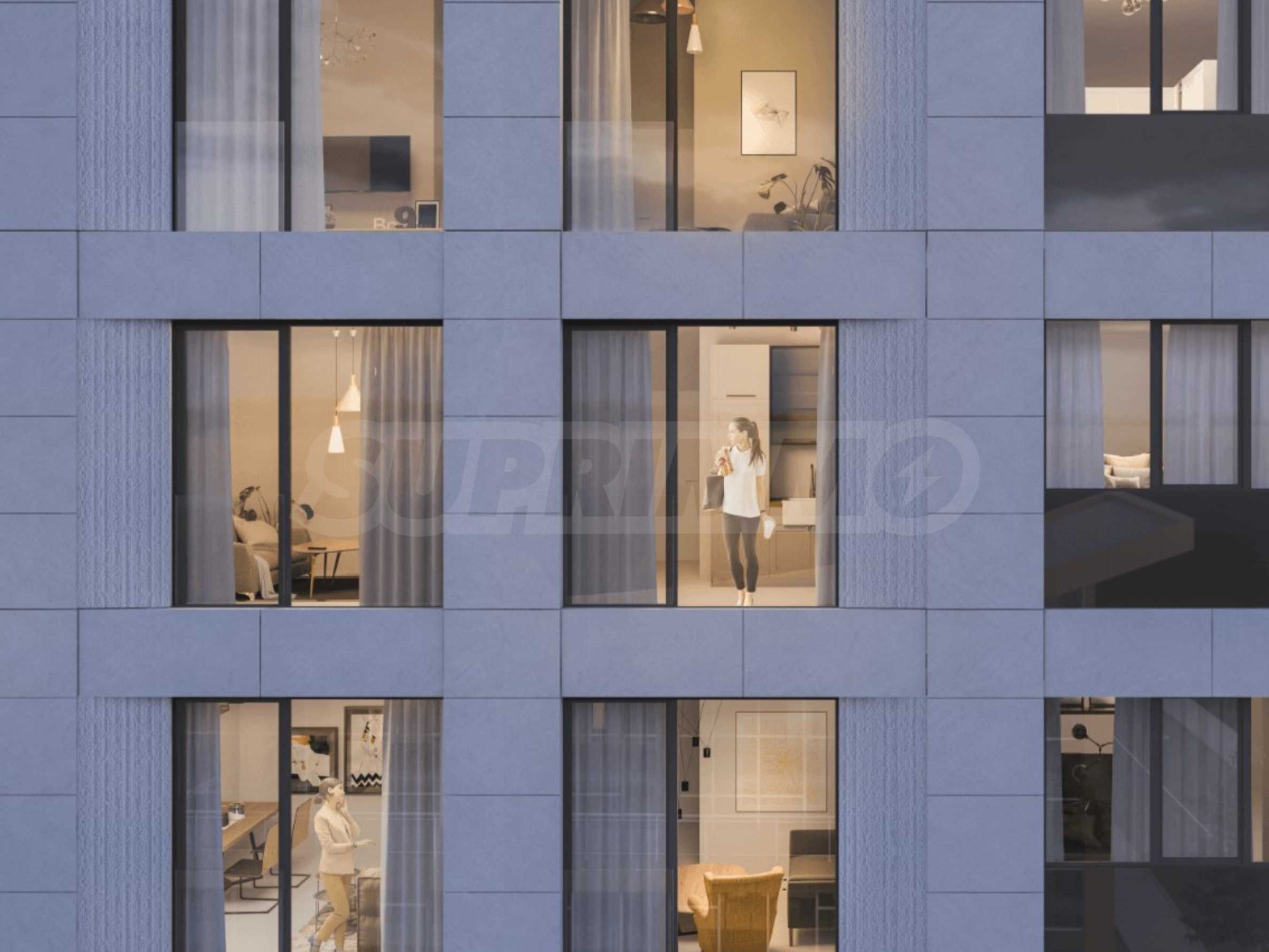 Модерната сградата предлага комфортни жилища на 7 етажа, партер с търговски имоти и два сутерена с 87 бр. паркоместа.