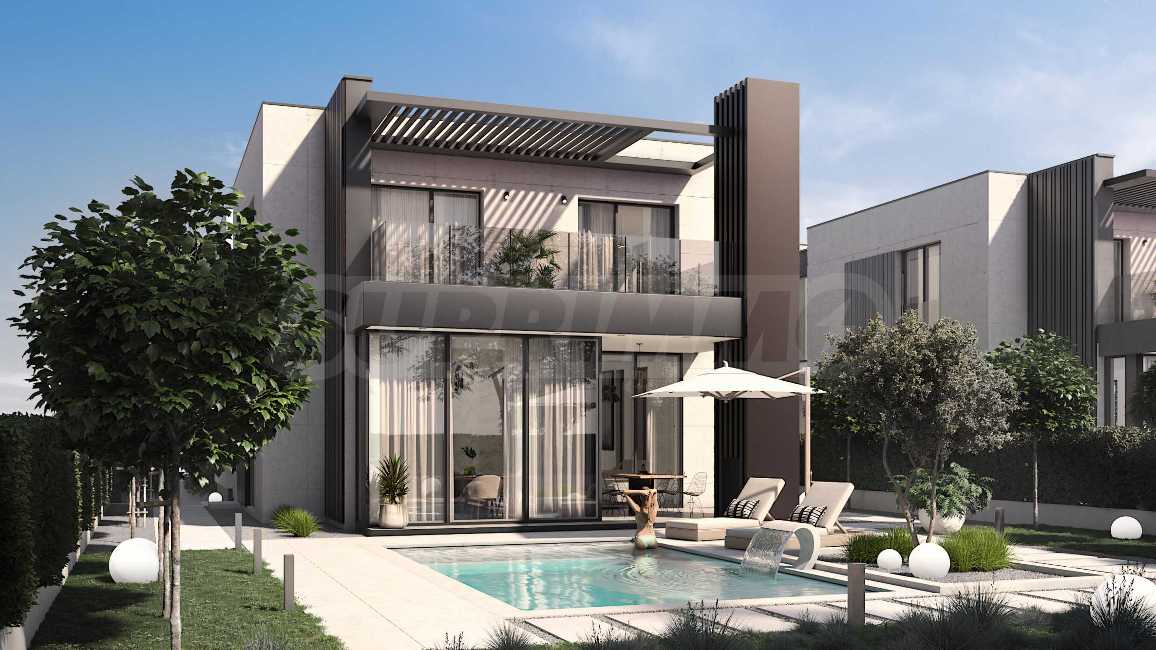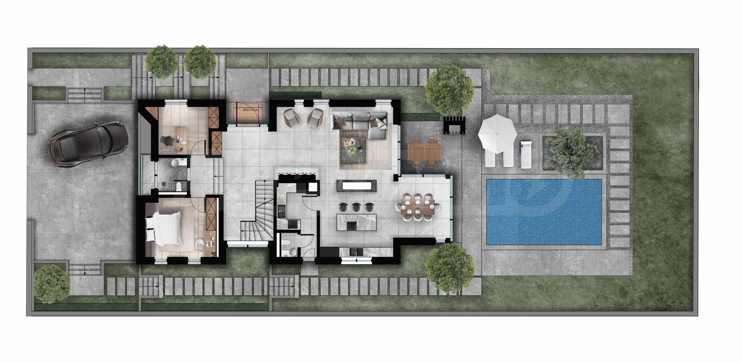 - Етаж 1 - 182.48 м², състоящ се от просторно фоайе, от коeто се отварят красиви гледки в двете посоки на градината, просторна дневна с кухненски бокс и трапезария с излаз на двора, обслужваща кухня с директен достъп от градината. На същия етаж, на различно ниво, е разположено отделно крило за гости, както и допълнително пространство, подходящо за домашен офис или домашна фитнес зала.