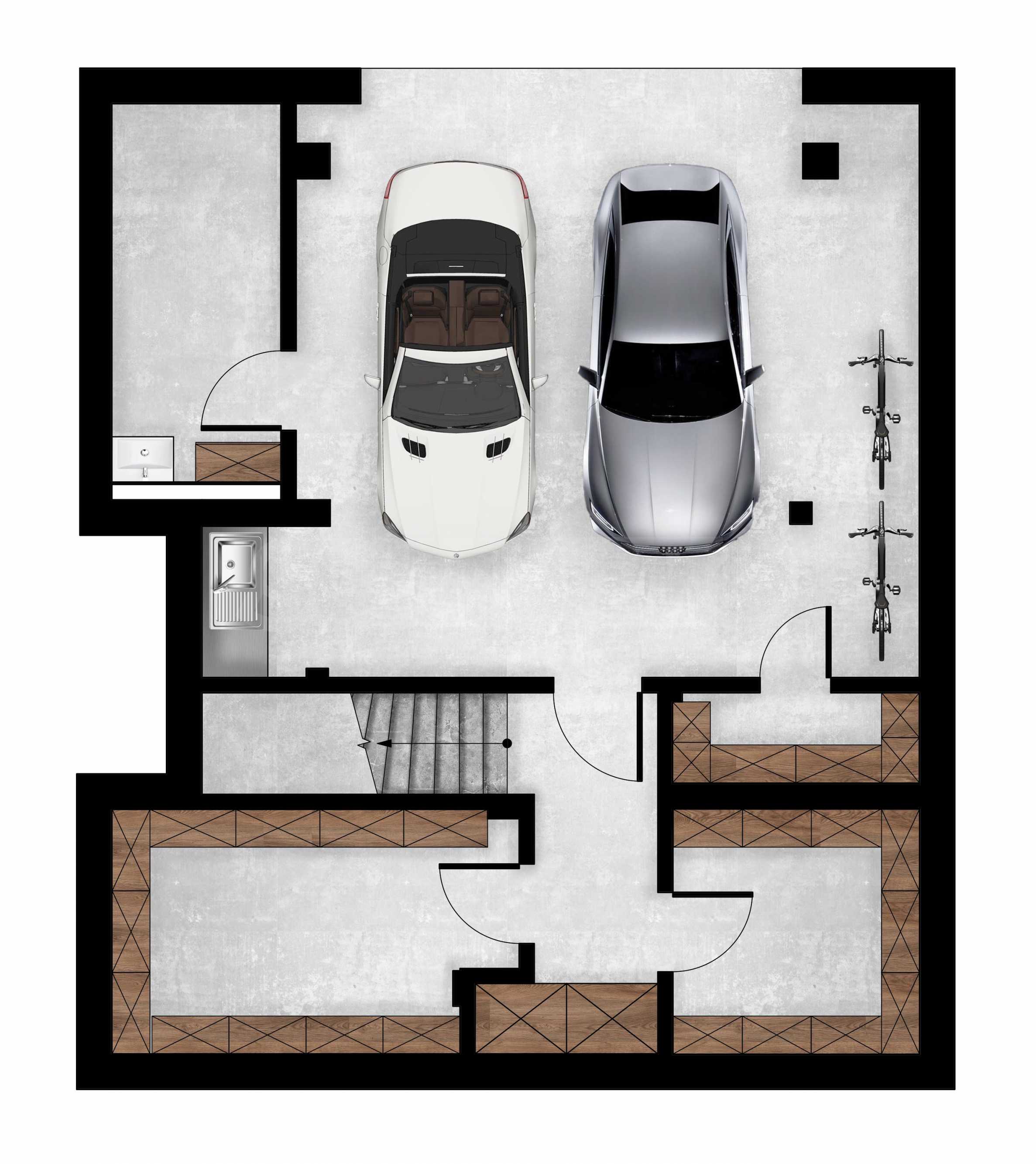 - Сутерен- 111.95 м², състоящ се от гараж за два автомобила, техническо помещение и три склада;