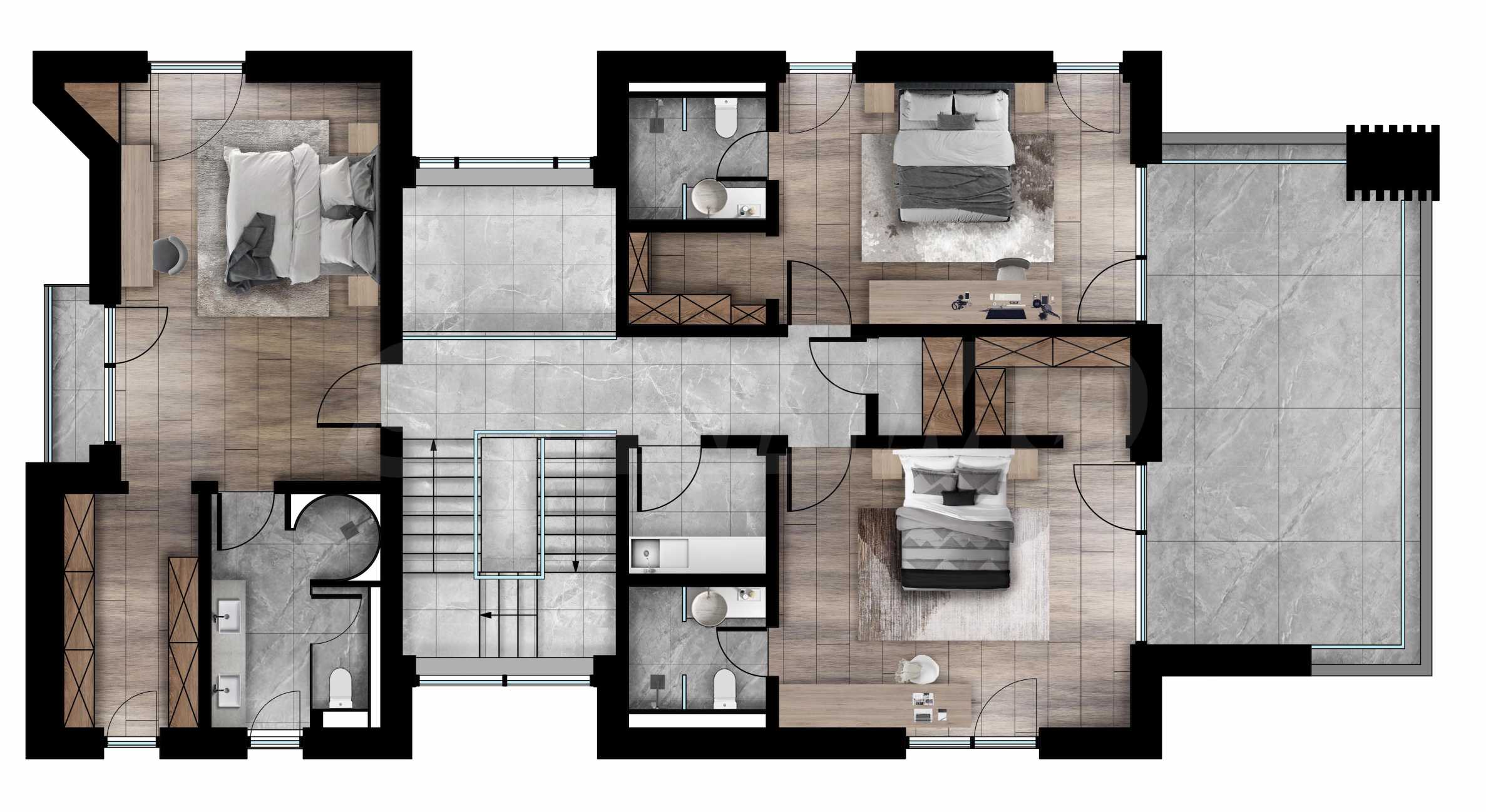 - Етаж 2 - 174.50 м², състоящ се от три спални, перално и складово помещение. Основната спалня е в отделно крило, със собствена баня и гардеробна. Във второто крило има още две спални, всяка със собствена баня, гардеробна и споделена тераса.