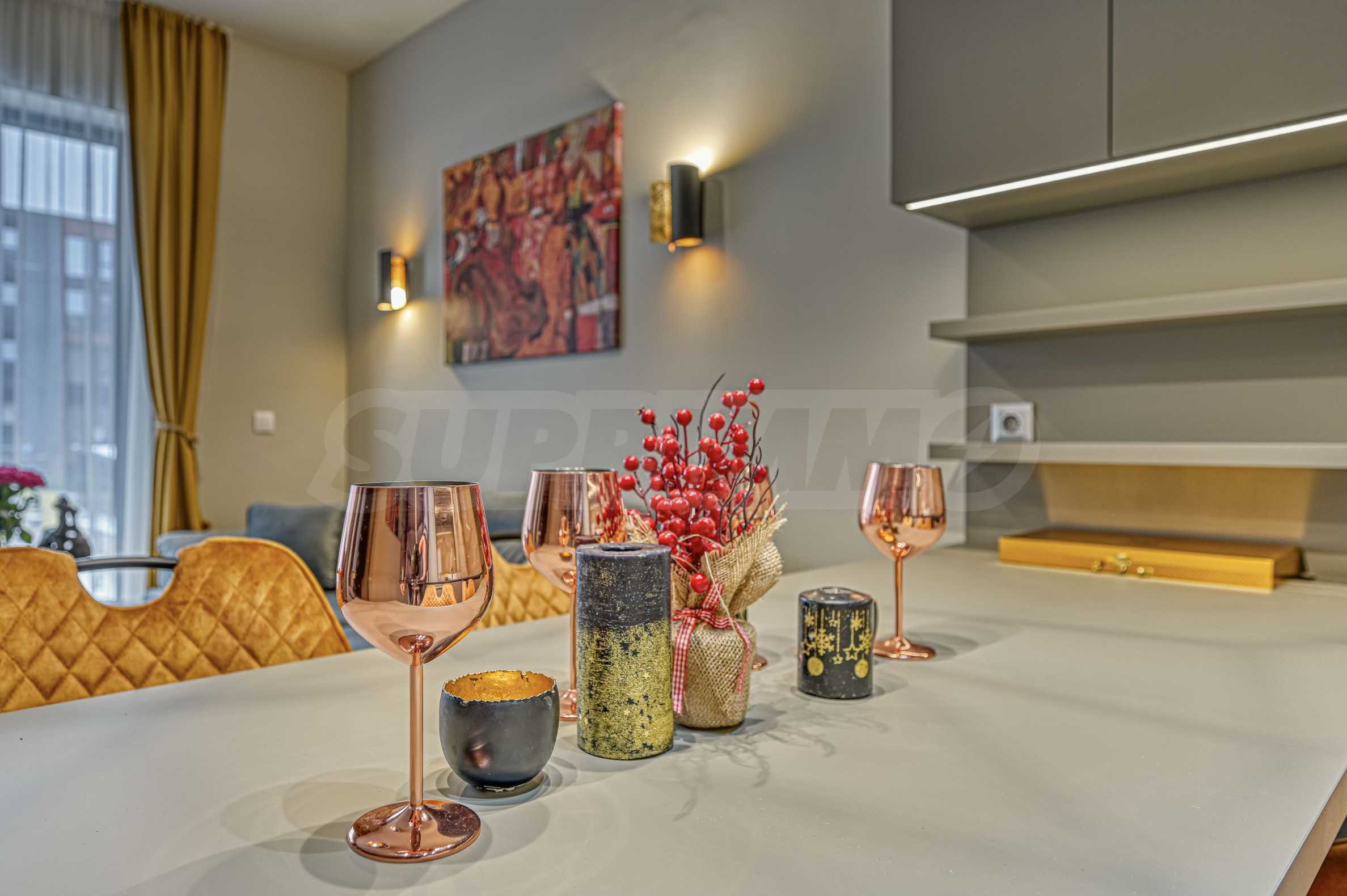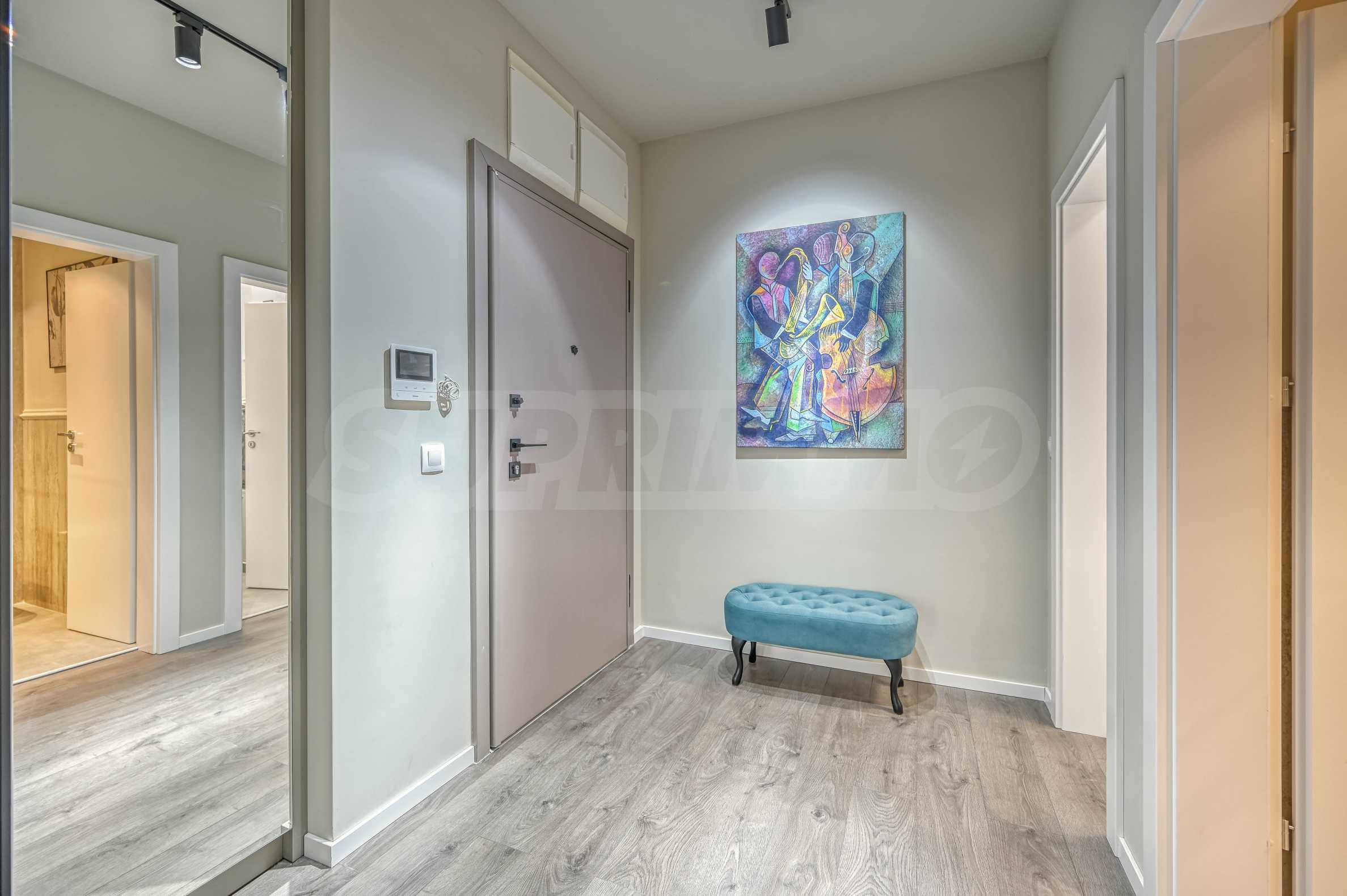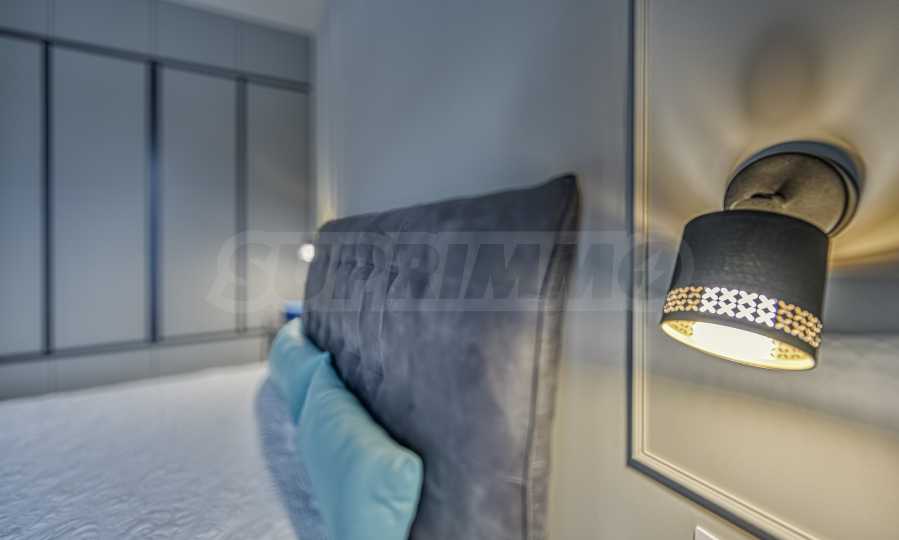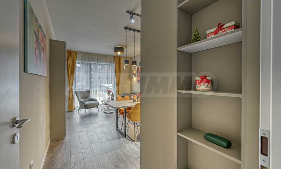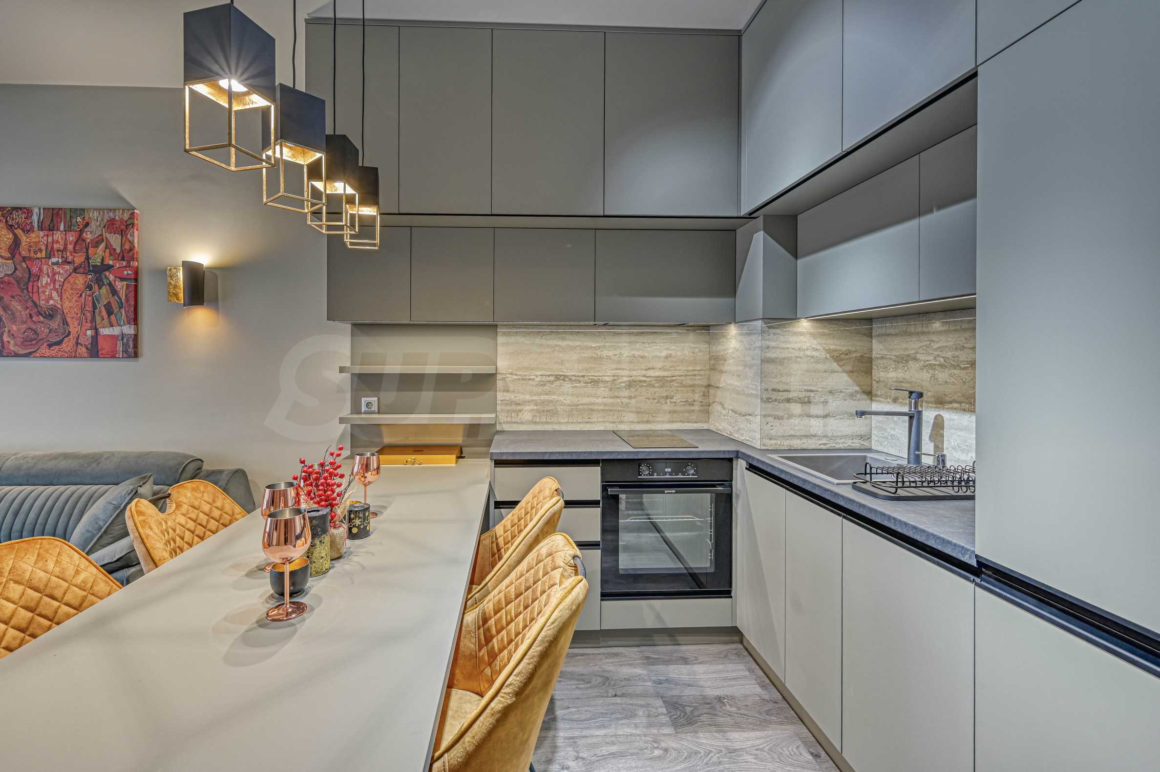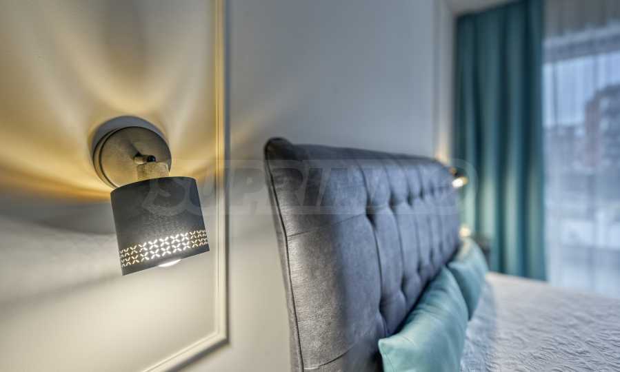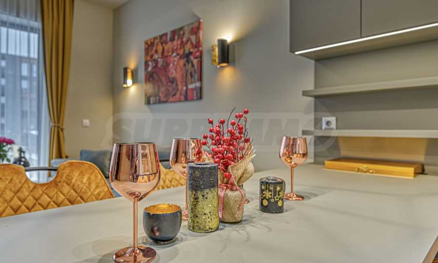 Апартаментът е обзаведен с изискан вкус по индивидуален дизайнерски проект. Всички мебели и електроуреди са от висок клас, нови и подбрани с внимание към всеки детайл. Жилището предлага уютна и модерна атмосфера, подходяща за хора, търсещи комфорт и стил.