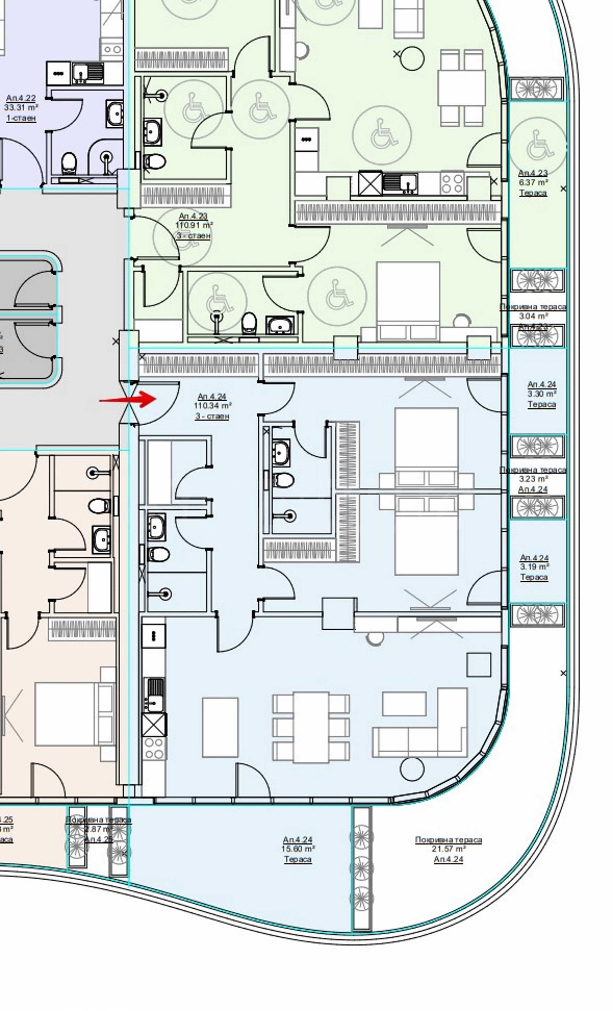 Апартаментът е ситуиран на 4-ти етаж от общо 15 и предлага 169.23 кв.м обща площ (нетна площ 132.43 кв.м + общи части 31.05 кв.м), с покривни тераси с площ от 24.80 кв.м и мазе от 5.75 кв.м.