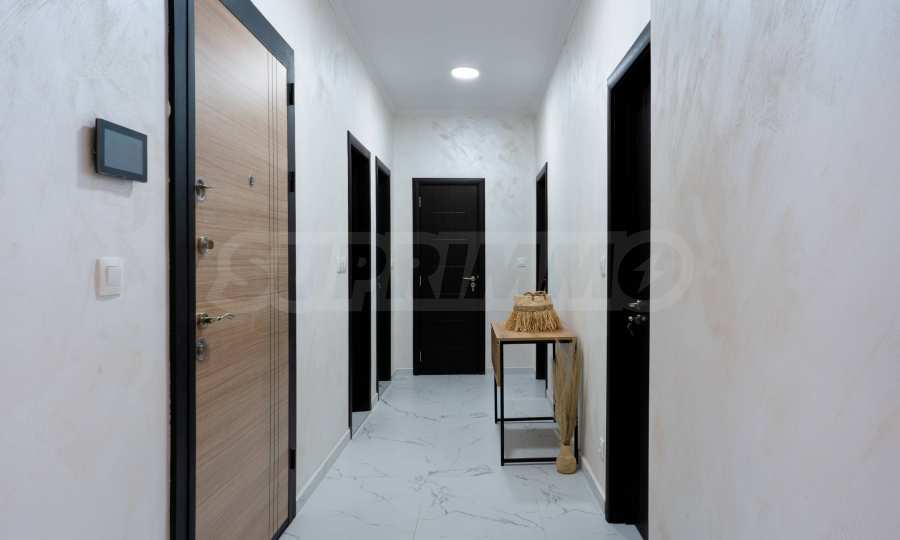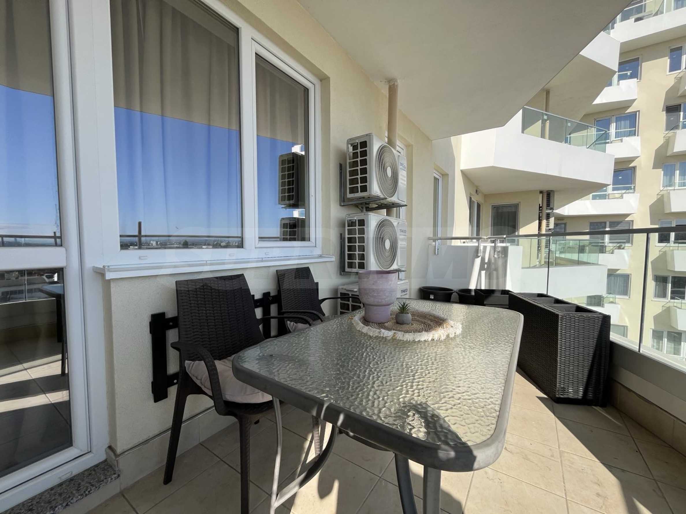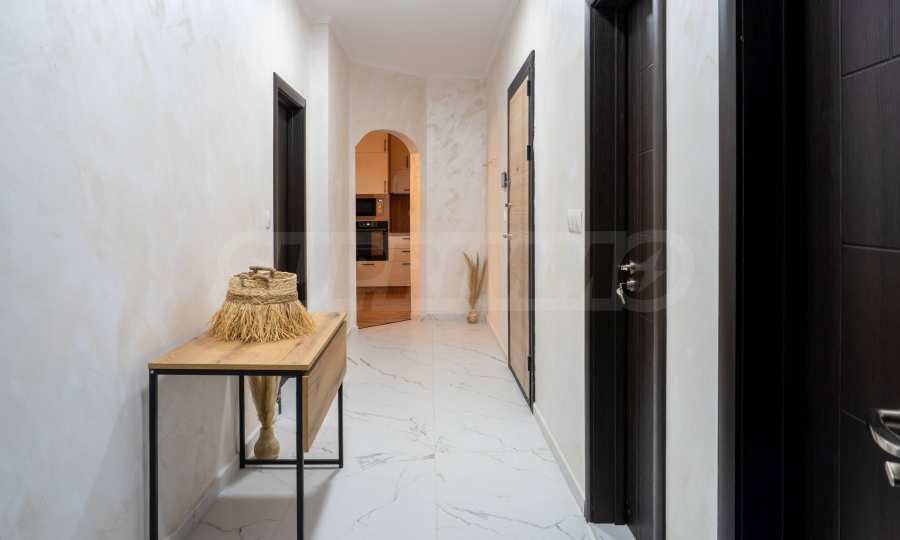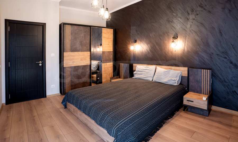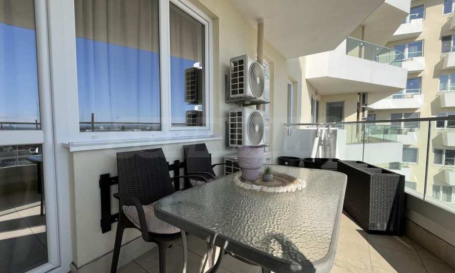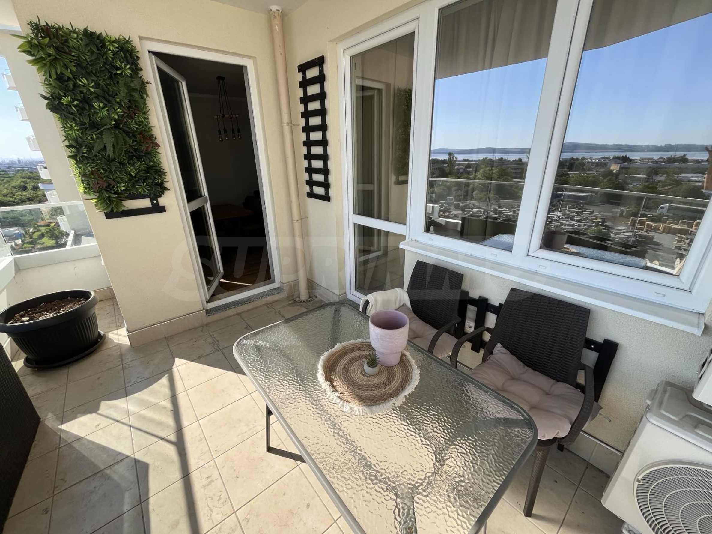 Имотът е просторен и уютен с обща площ от 118 кв.м, разположен на 5-и етаж с изложение юг и гледка към езерото Вая.
