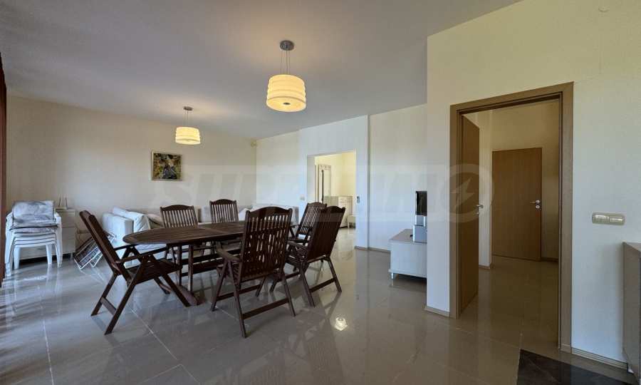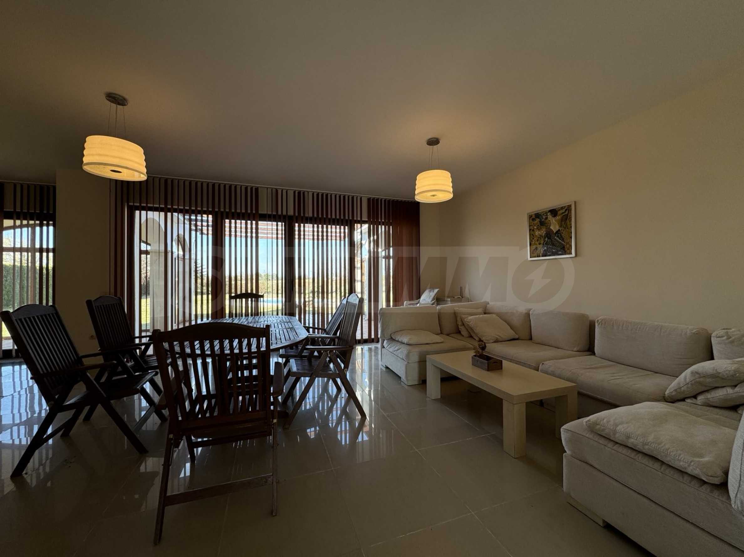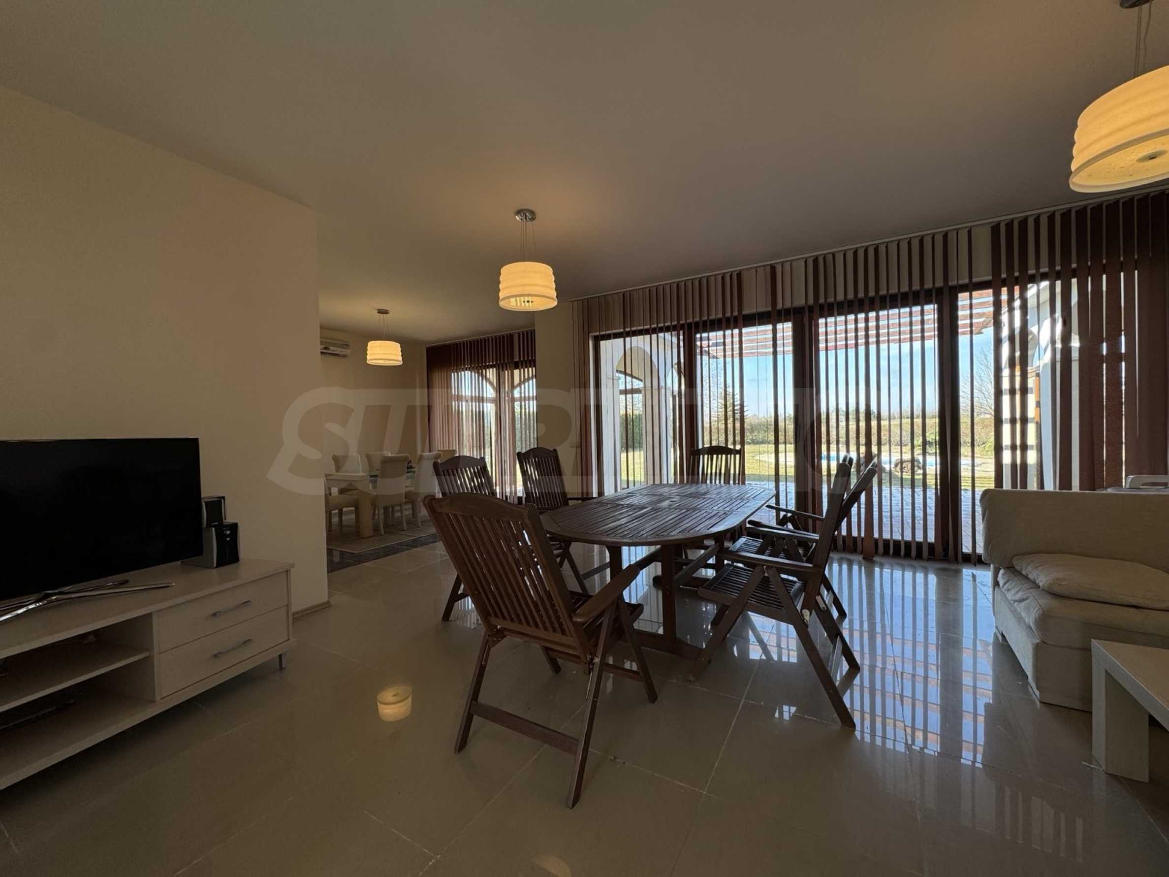 - голяма всекидневна с трапезария, излаз и гледка към басейна;