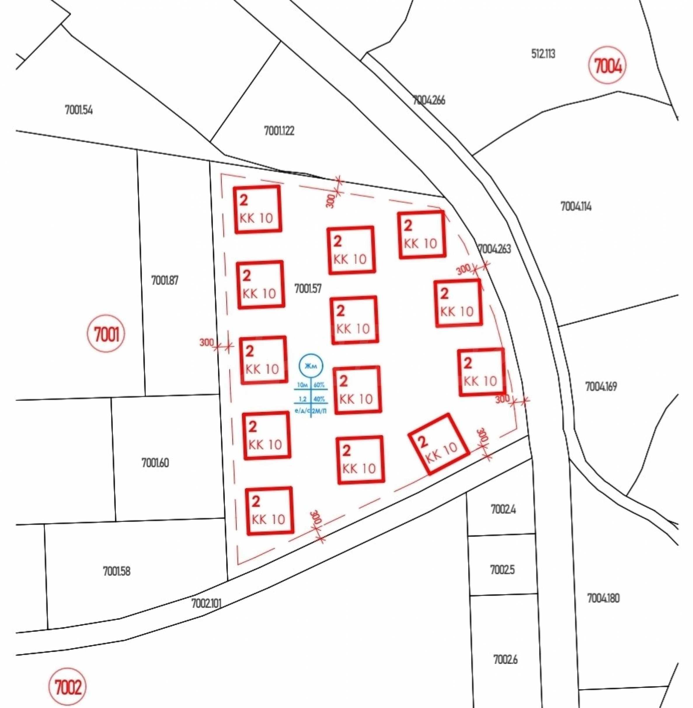 Имотът попада изцяло в зона с малкоетажно застрояване, с ограничителни параметри, която предвижда застрояване на къщи или сгради със следните параметри: