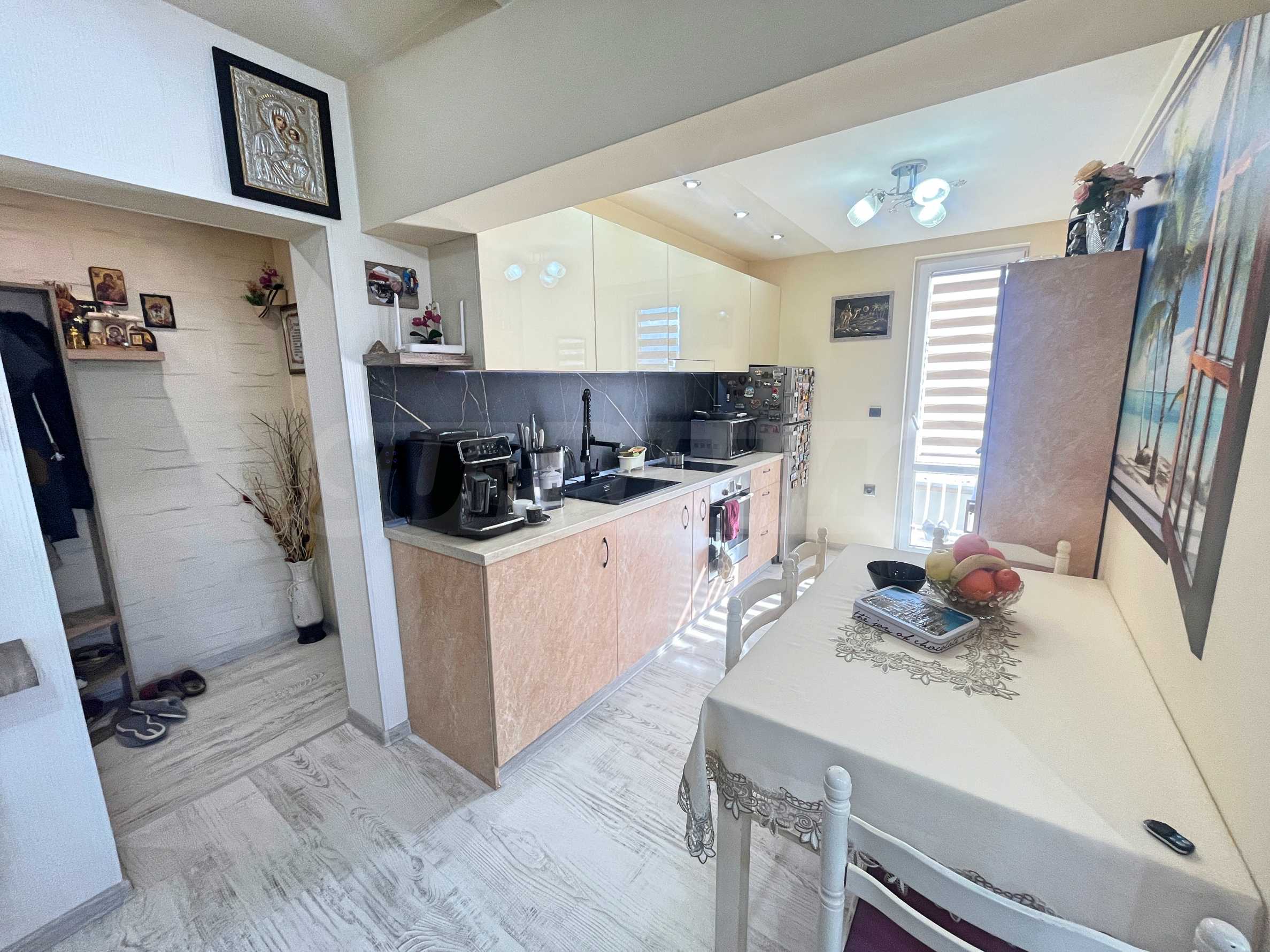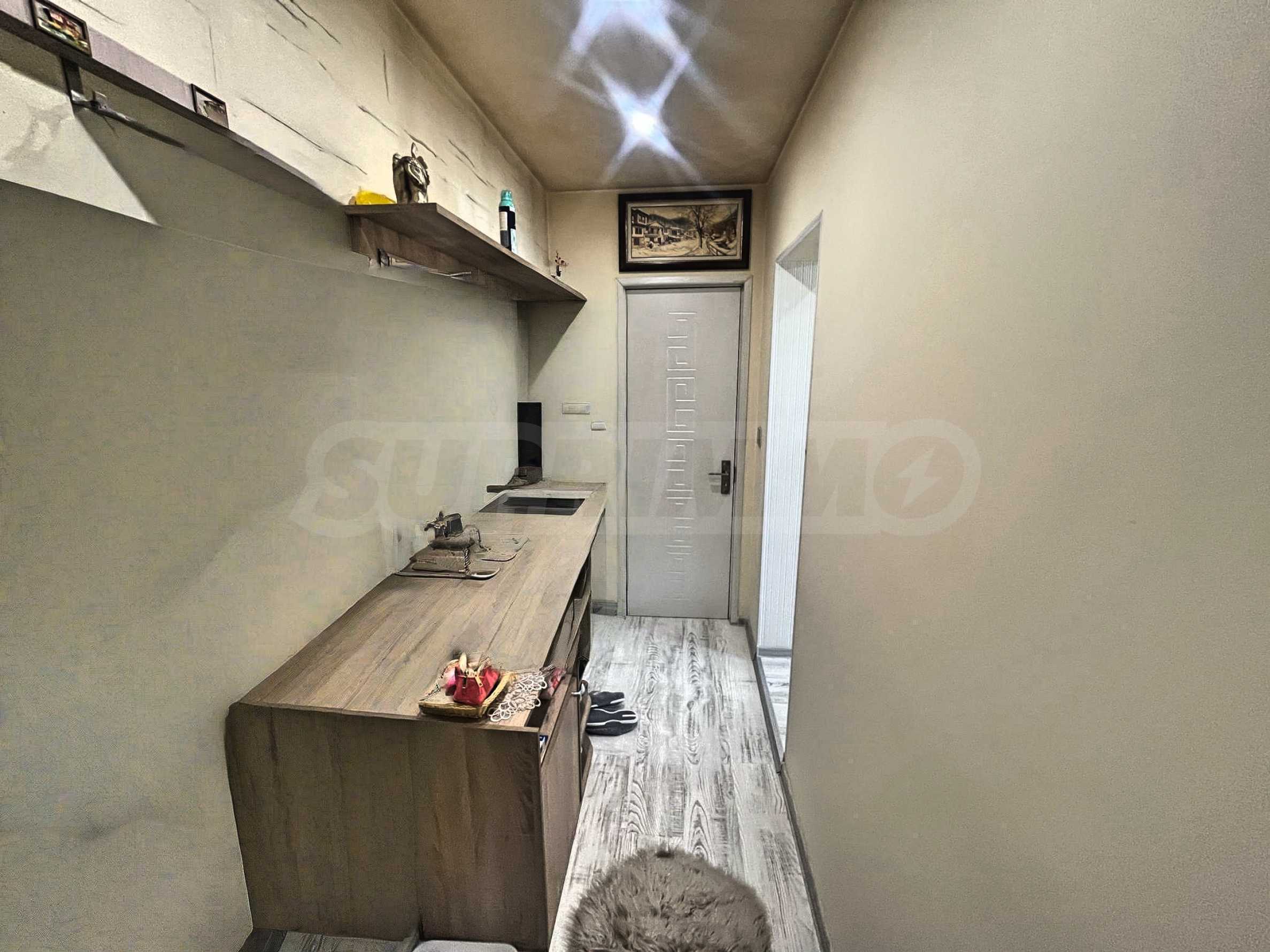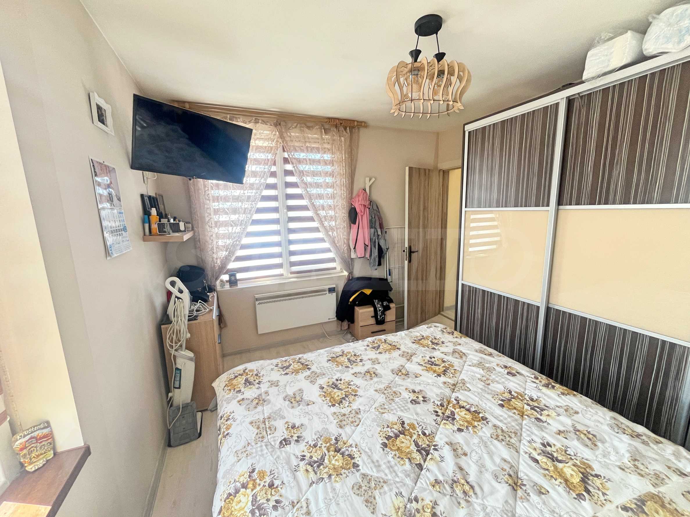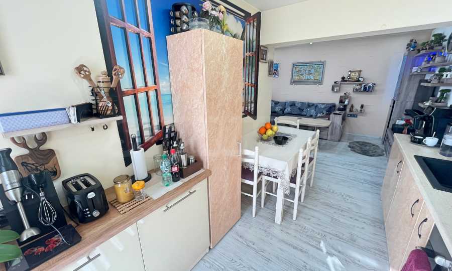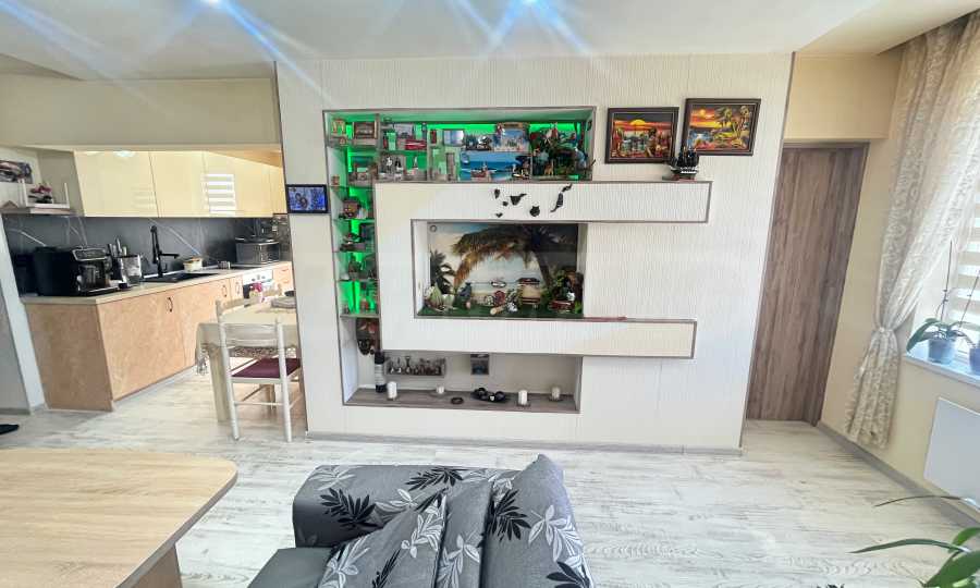 Апартаментът се продава с всички мебели и електроуреди, които виждате на снимките. Включително: пералня, хладилник, фурна, телевизор, гардероби, спалня, маси, столове, диван и портманто.