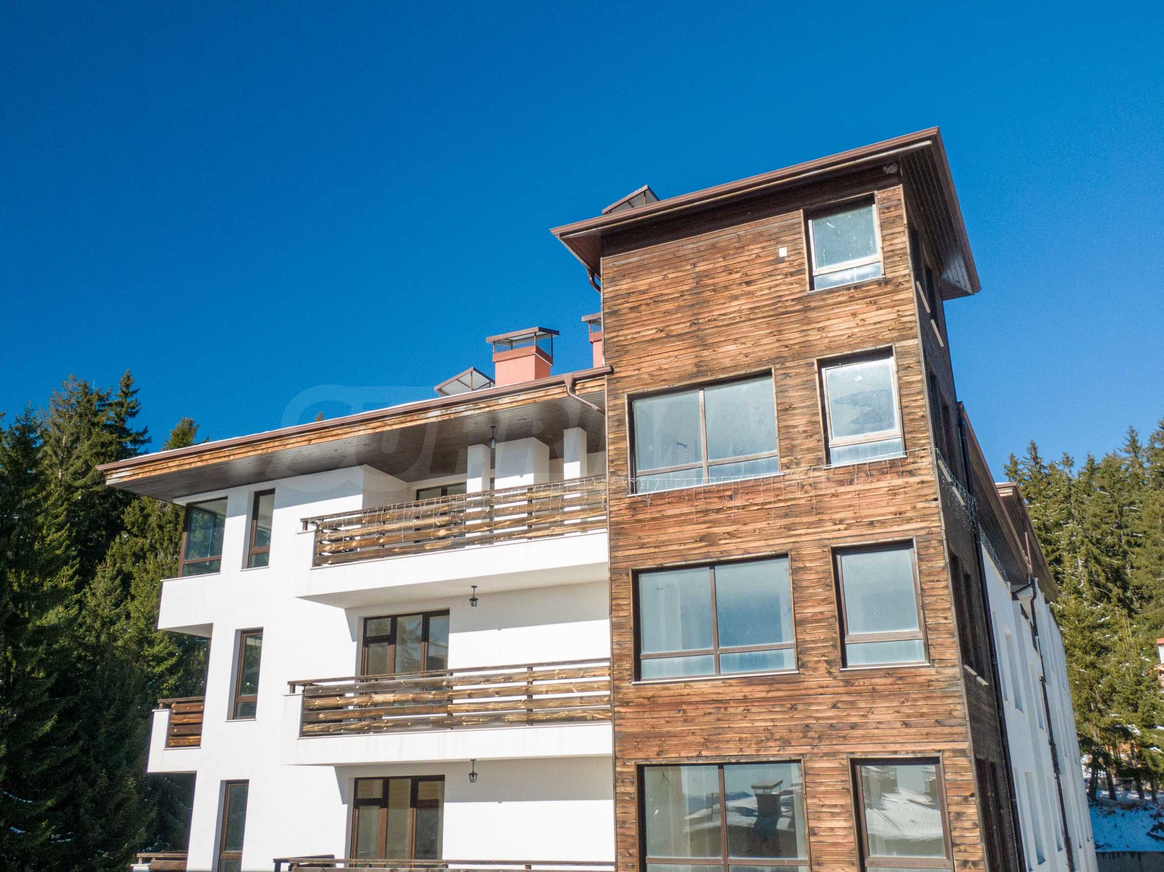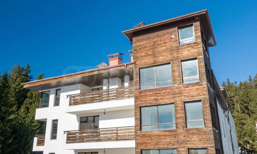 Построени в характерен за района архитектурен стил, сградите са с дървена обшивка по фасада и каменна облицовка в ниската част. Всеки вход е с асансьор и стилно завършени общи части. Избрана е тъмна PVC дограма с високо топлоизолационно качество, в дървен тон в хармония с природата и в контраст с бялата фасада, покрита със силиконова структурна мазилка.