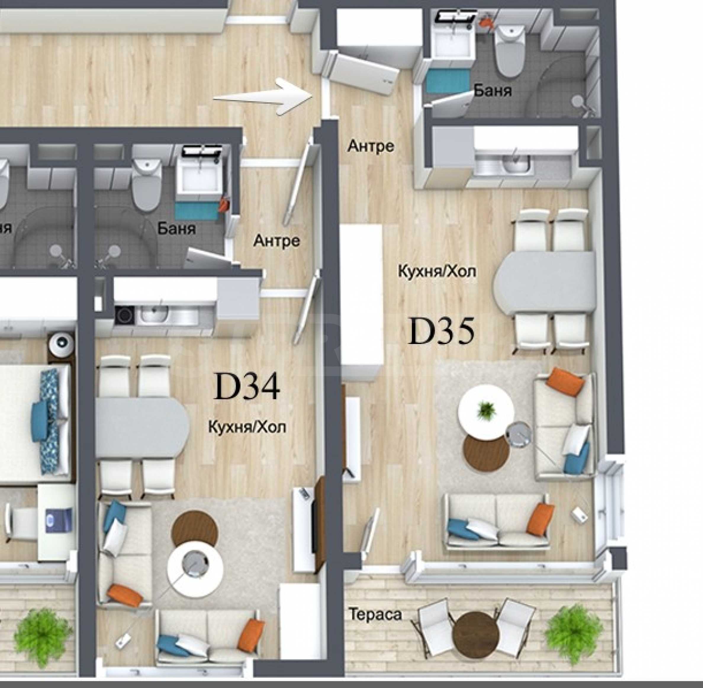 Апартаментите за продажба са от тип студиа, двустайни и тристайни жилища, завършени до "ключ", без мебели. Баните са с висок клас италиански плочки, смесители, структури за вграждане на Grohe. Има опция имотите да бъдат напълно обзаведени. Повечето апартаменти са с югозападно изложение.