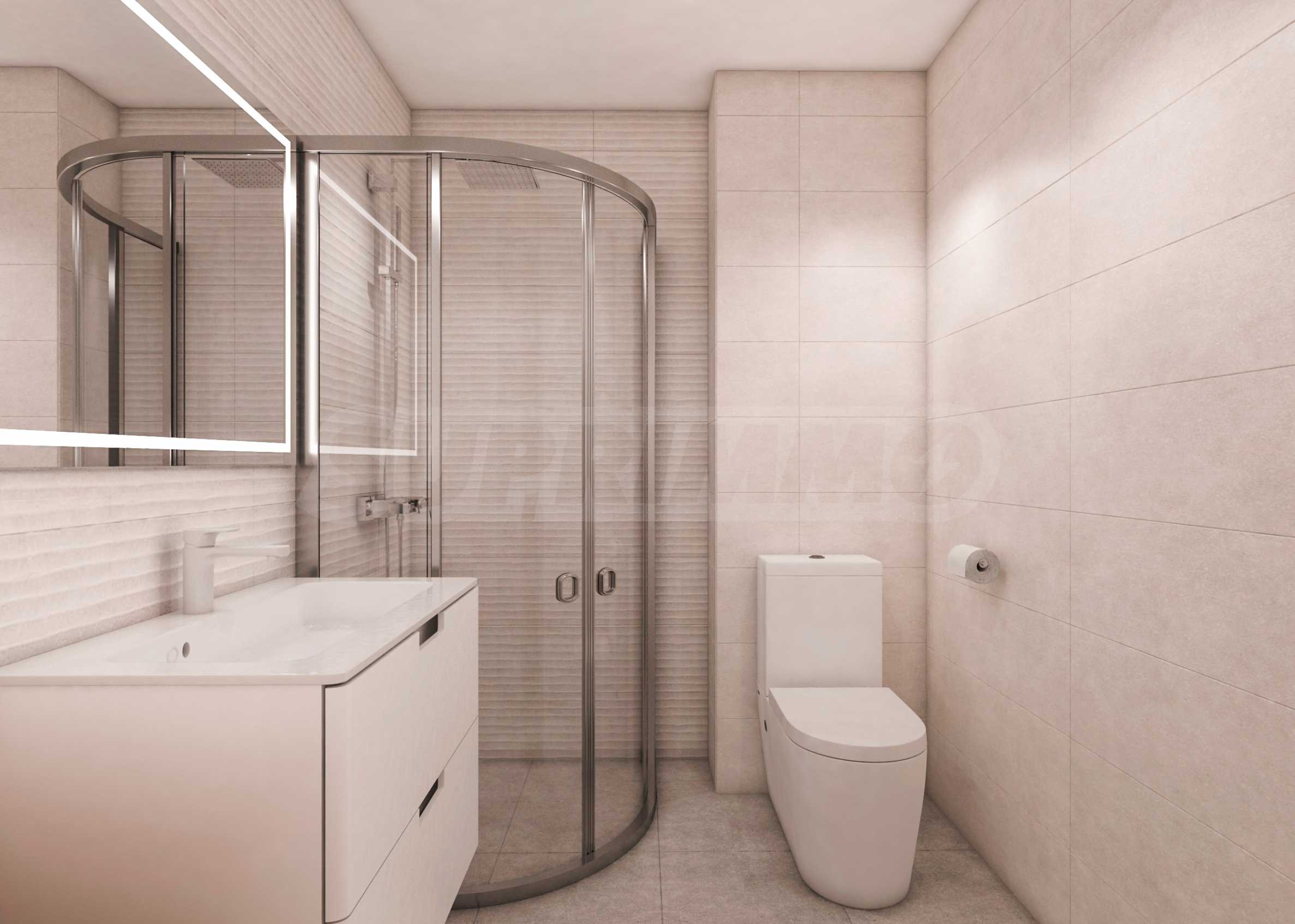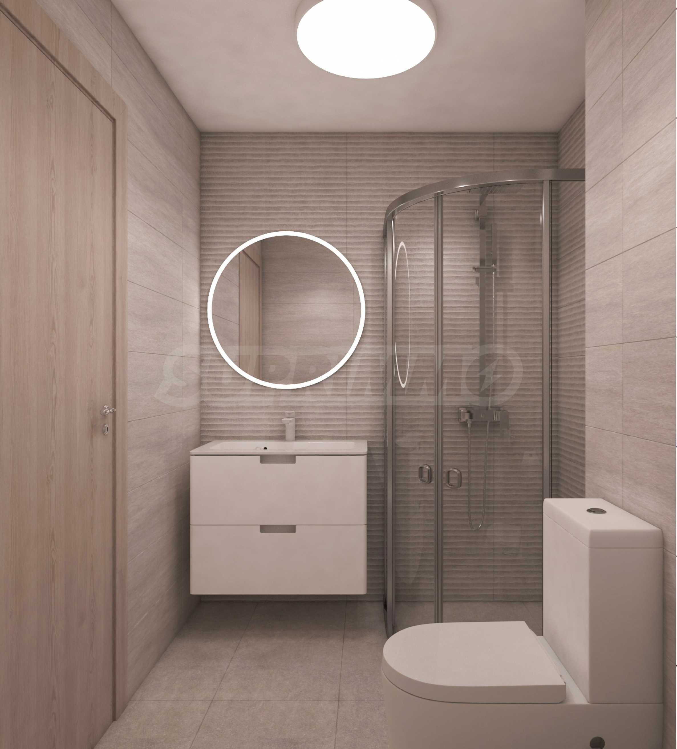 - Баня с тоалетна – под с гранитогрес, стени с фаянс, монтиран ключ, контакти и стенни фасунги, тоалетен моноблок, сифон, шкаф с мивка със смесителна батерия и огледало над мивката, смесител батерия за душ кабина, душ кабина Huppe, бойлер.