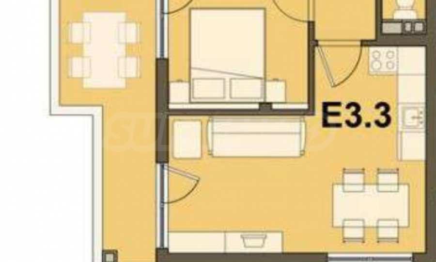 Имотът е разположен на 3-ти етаж с изложение юг/запад и предлага 72,18 кв.м обща площ. Състои се от всекидневна, спалня, баня с тоалетна и тераса. Предлага се завършен "до ключ", обзаведен.