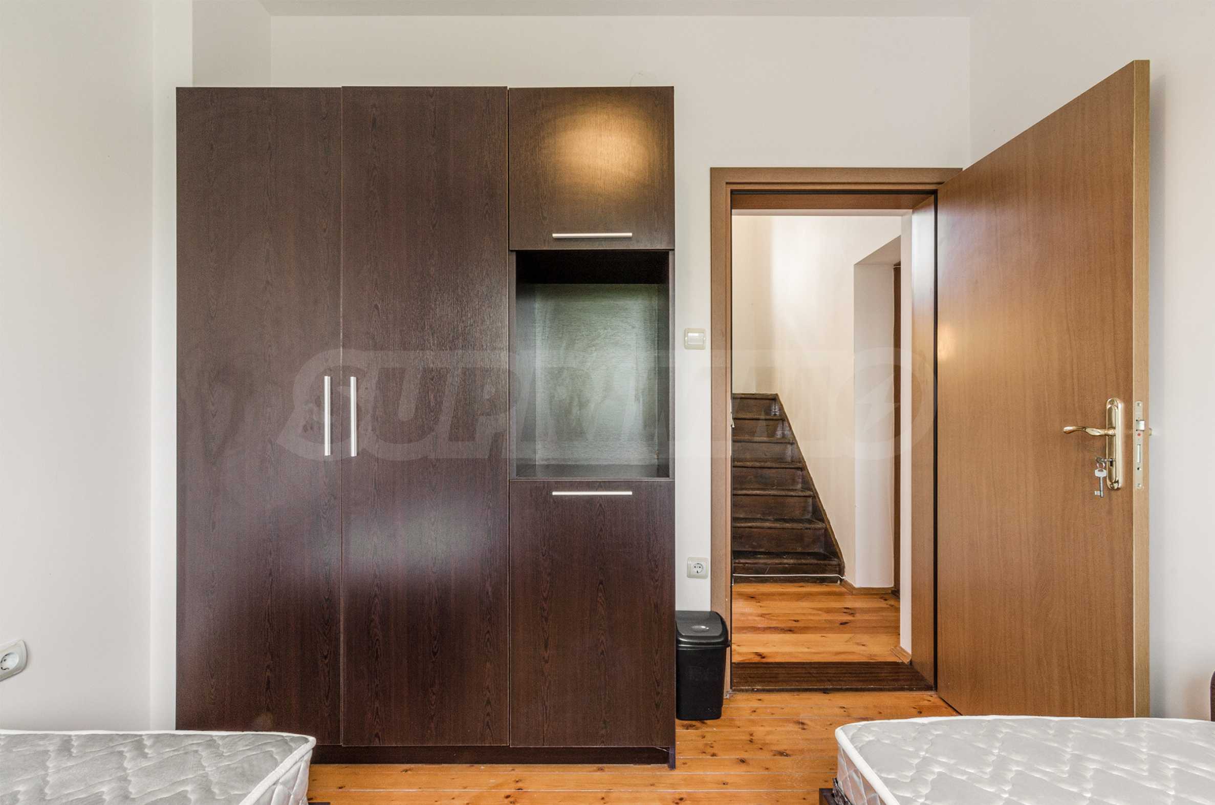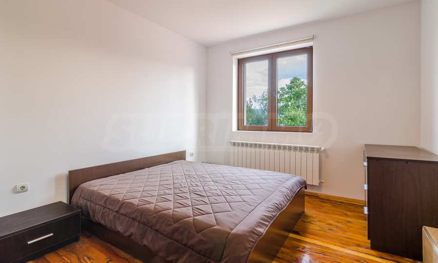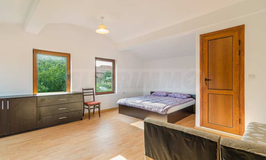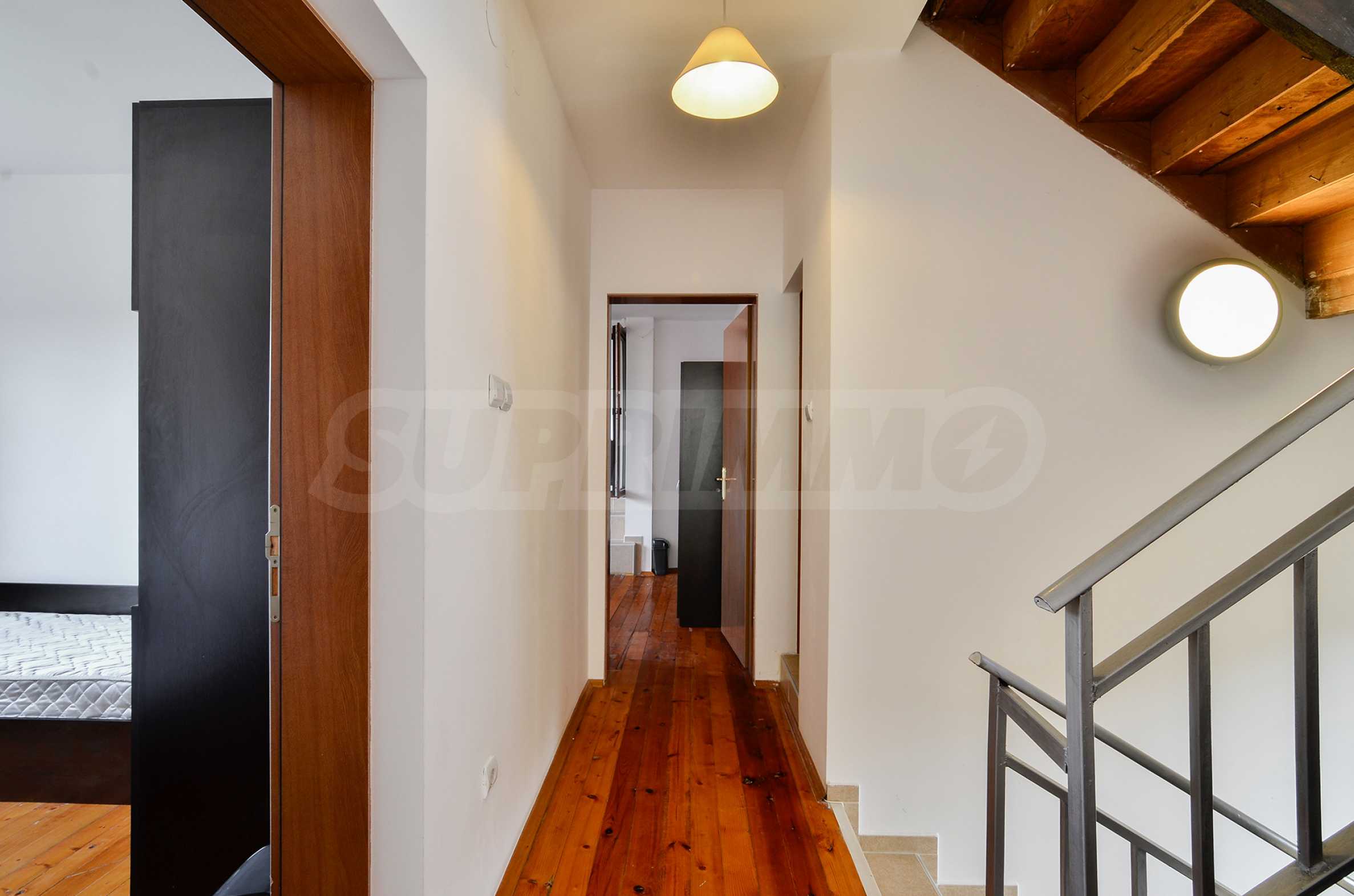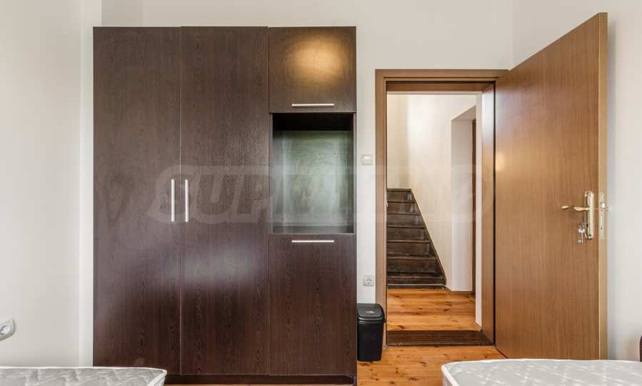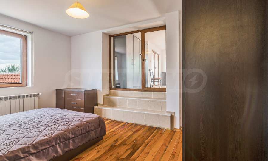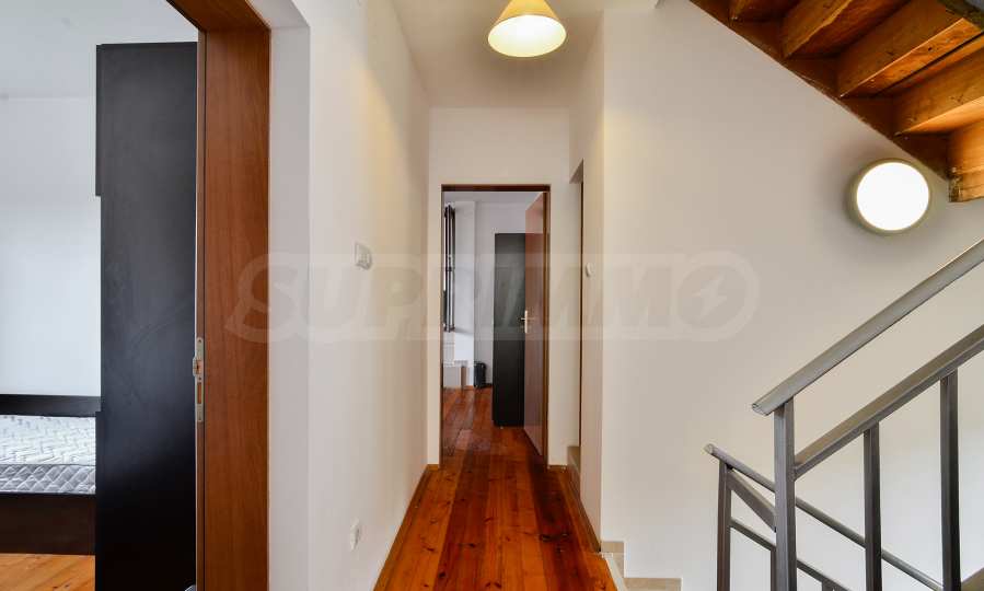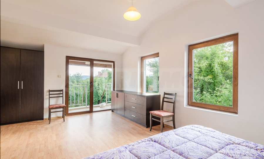 На приземния етаж ще откриете просторна кухня, трапезария, хол и една спалня. Освен това, има и самостоятелен апартамент с една спалня, който разполага с отделен вход от градината. На същото ниво се намират две бани. Горният етаж включва четири спални и три бани, като една от спалните има самостоятелен достъп през външно стълбище и тераса. В подпокривното пространство е обособен малък апартамент със собствена баня и тераса.