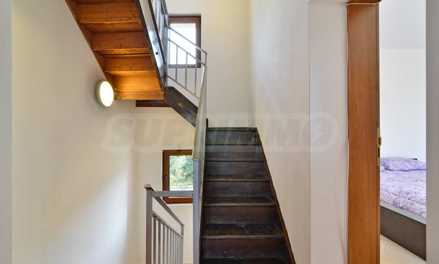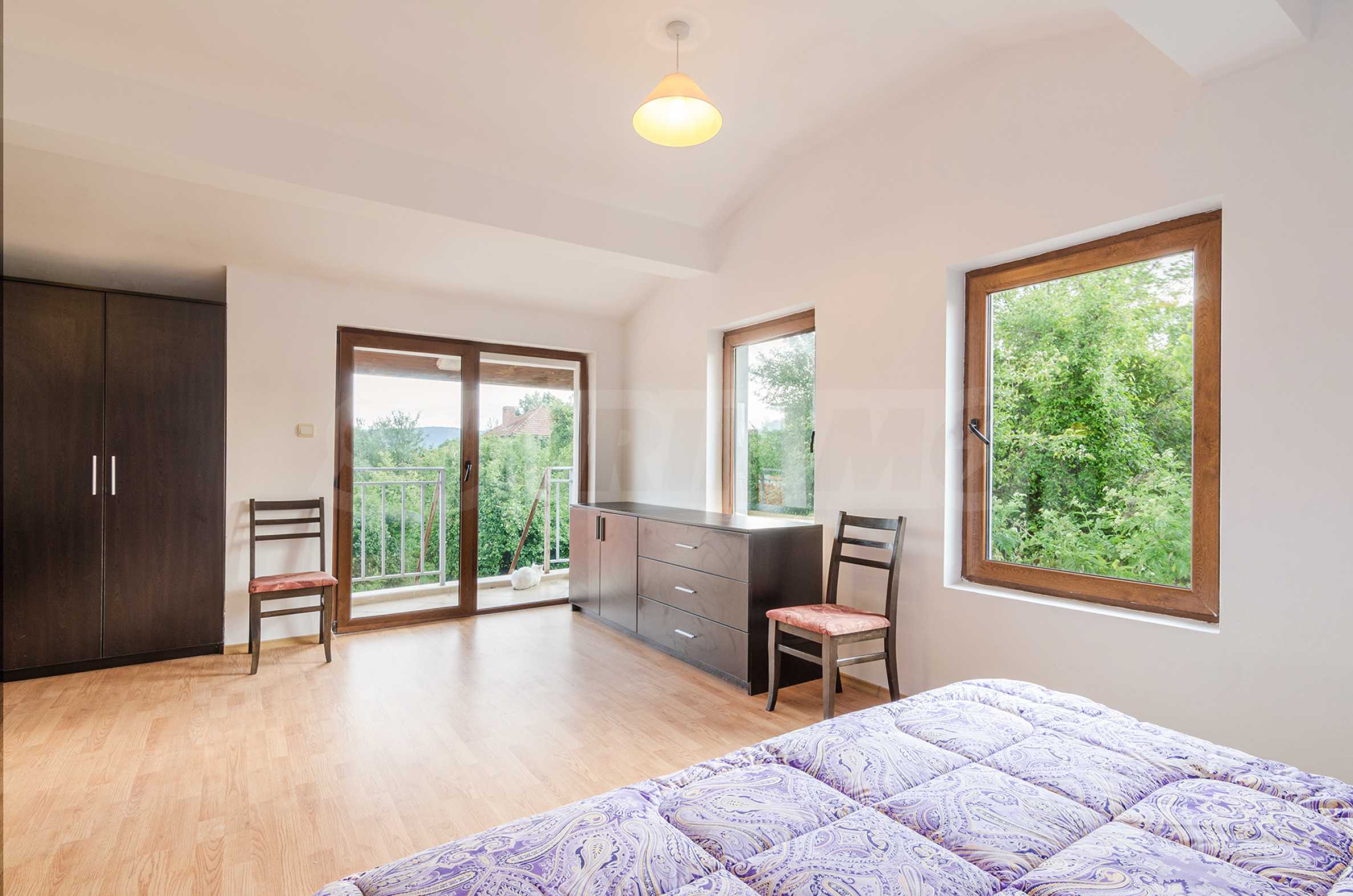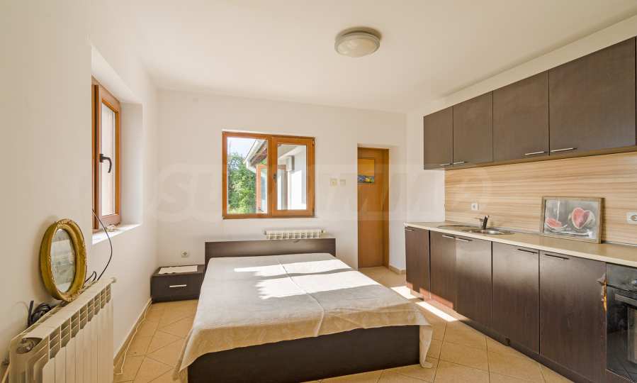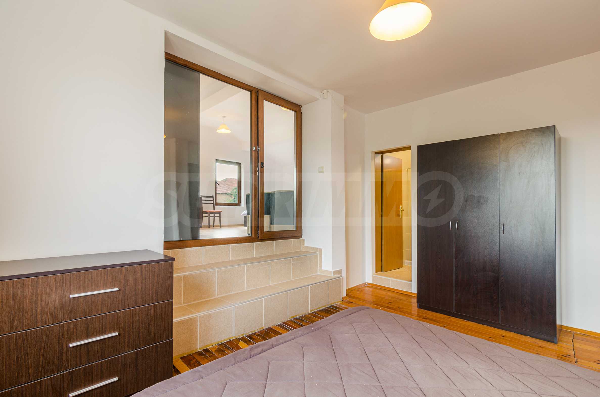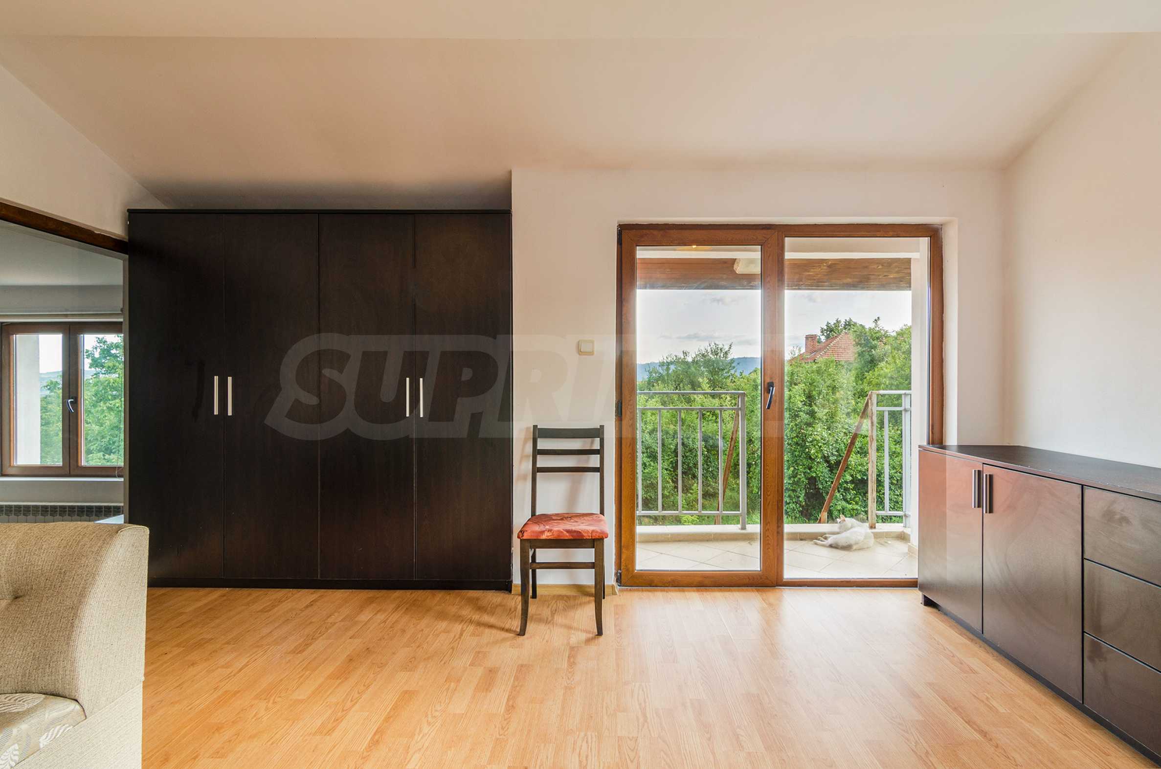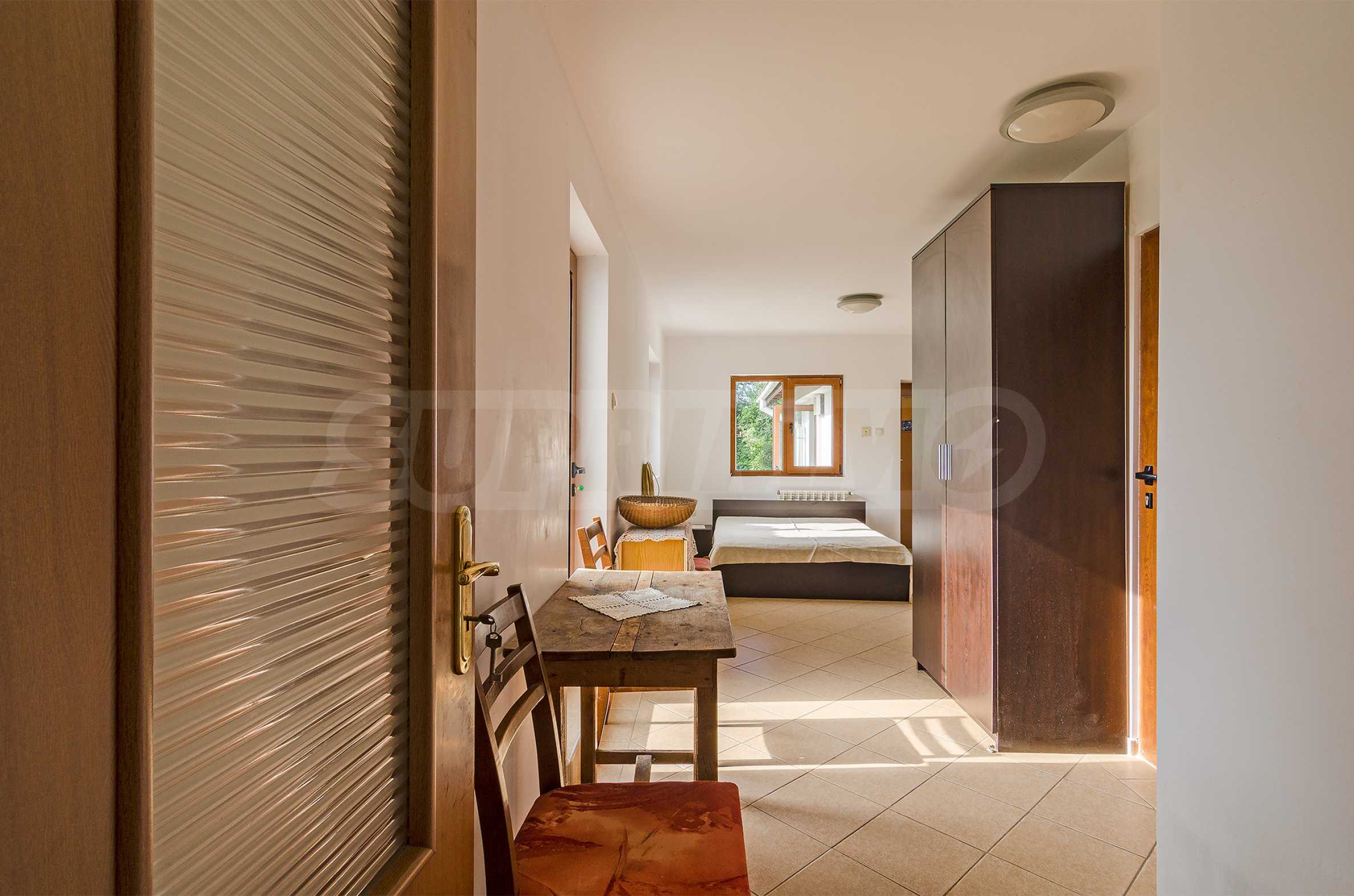 На приземния етаж ще откриете просторна кухня, трапезария, хол и една спалня. Освен това, има и самостоятелен апартамент с една спалня, който разполага с отделен вход от градината. На същото ниво се намират две бани. Горният етаж включва четири спални и три бани, като една от спалните има самостоятелен достъп през външно стълбище и тераса. В подпокривното пространство е обособен малък апартамент със собствена баня и тераса.