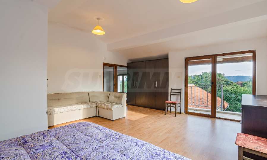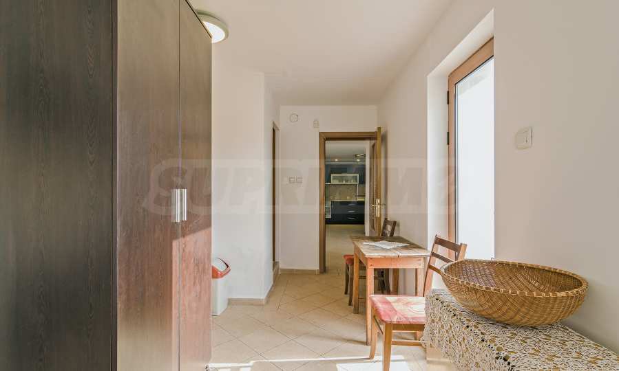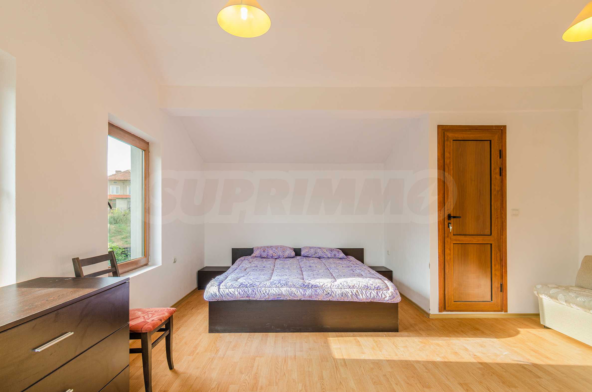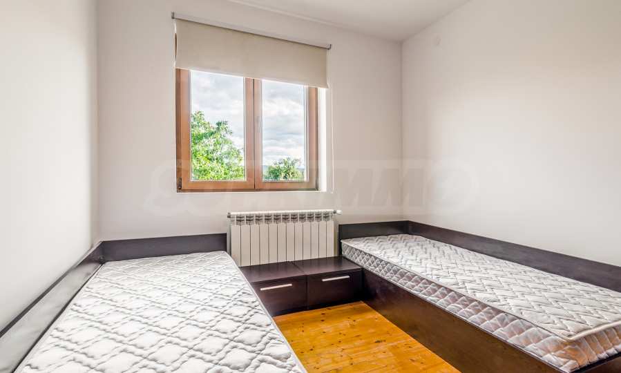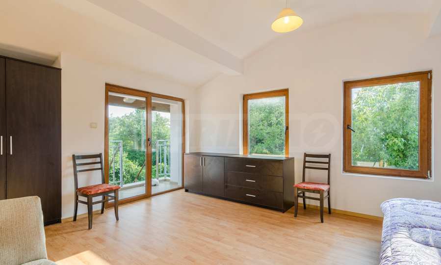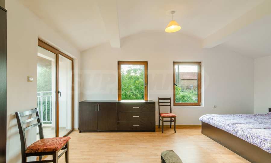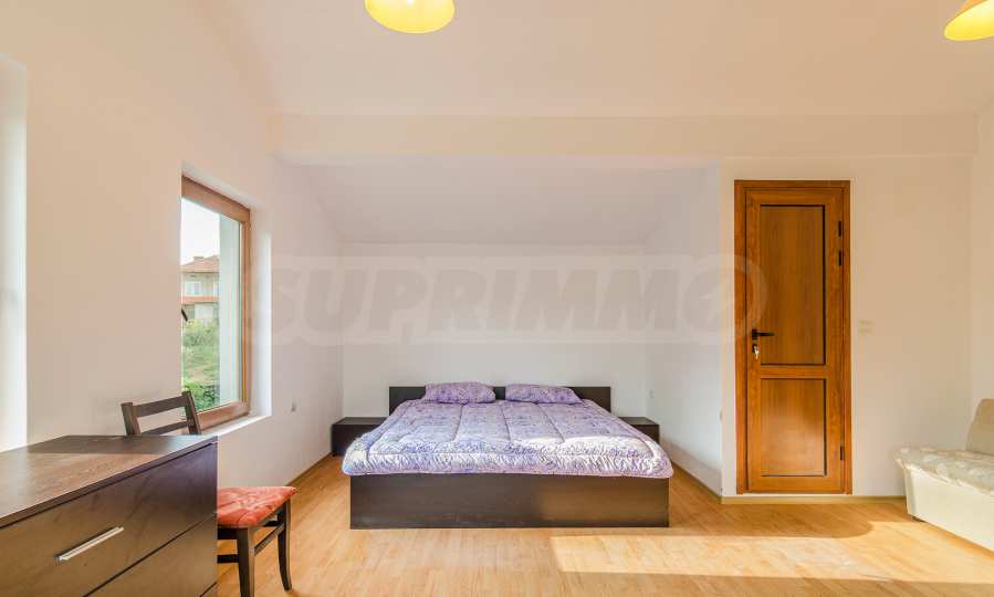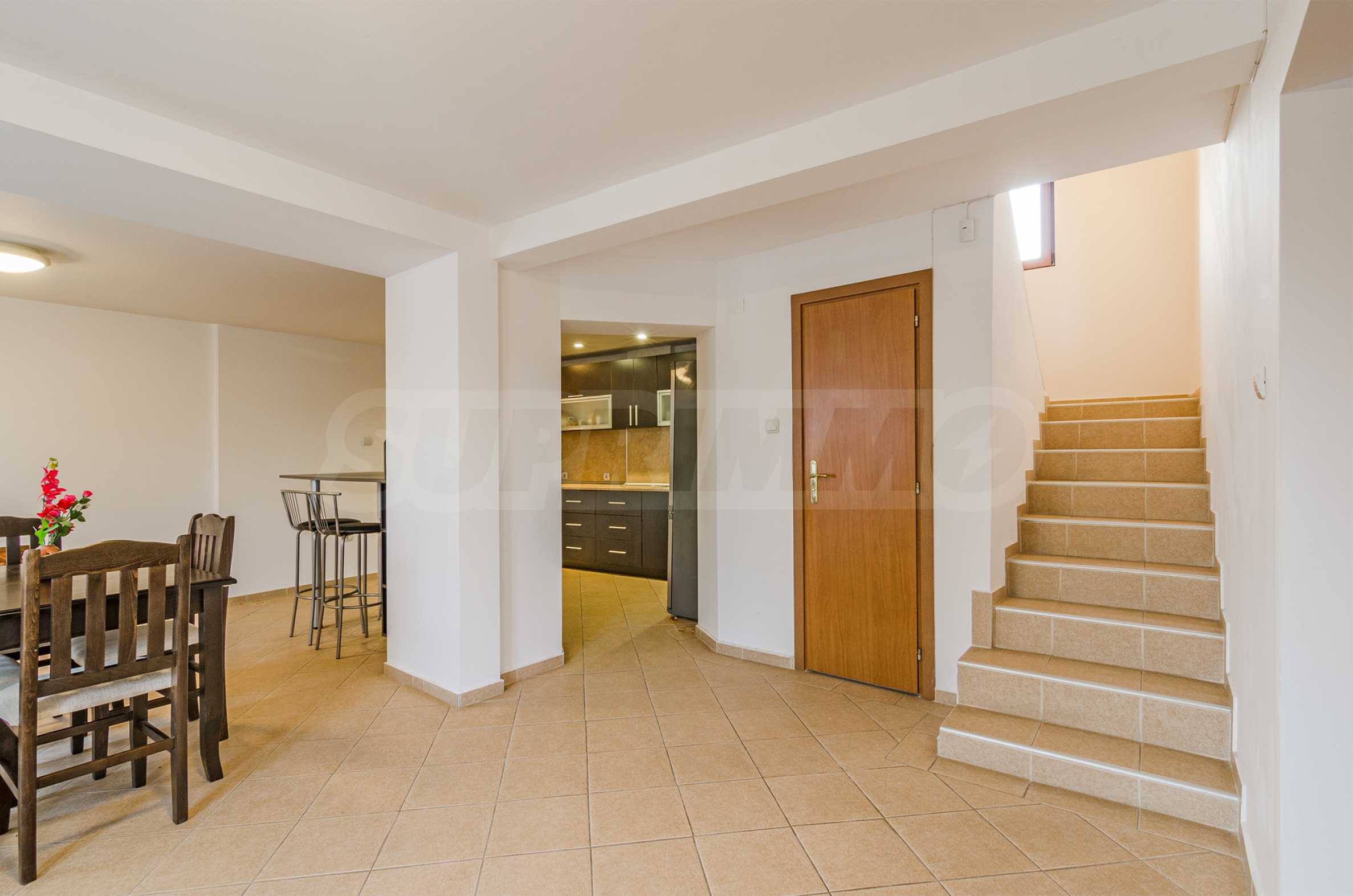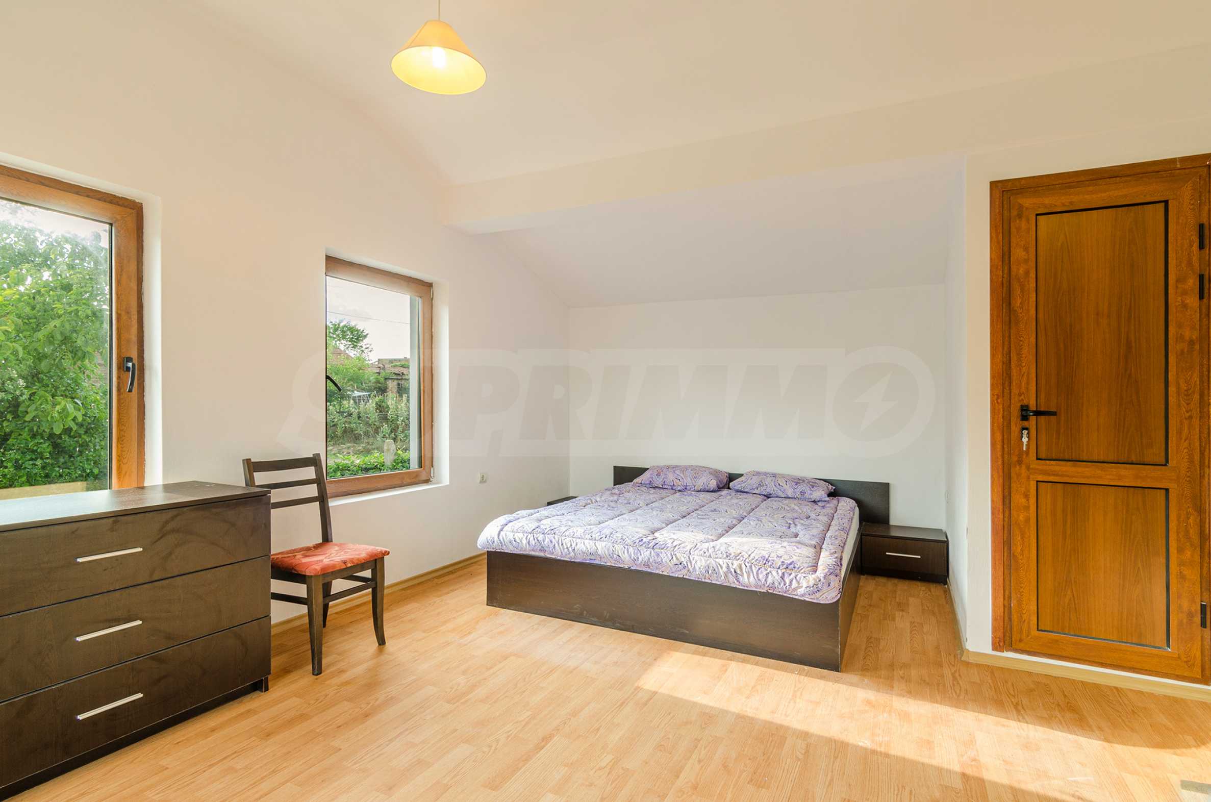 На приземния етаж ще откриете просторна кухня, трапезария, хол и една спалня. Освен това, има и самостоятелен апартамент с една спалня, който разполага с отделен вход от градината. На същото ниво се намират две бани. Горният етаж включва четири спални и три бани, като една от спалните има самостоятелен достъп през външно стълбище и тераса. В подпокривното пространство е обособен малък апартамент със собствена баня и тераса.