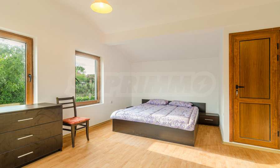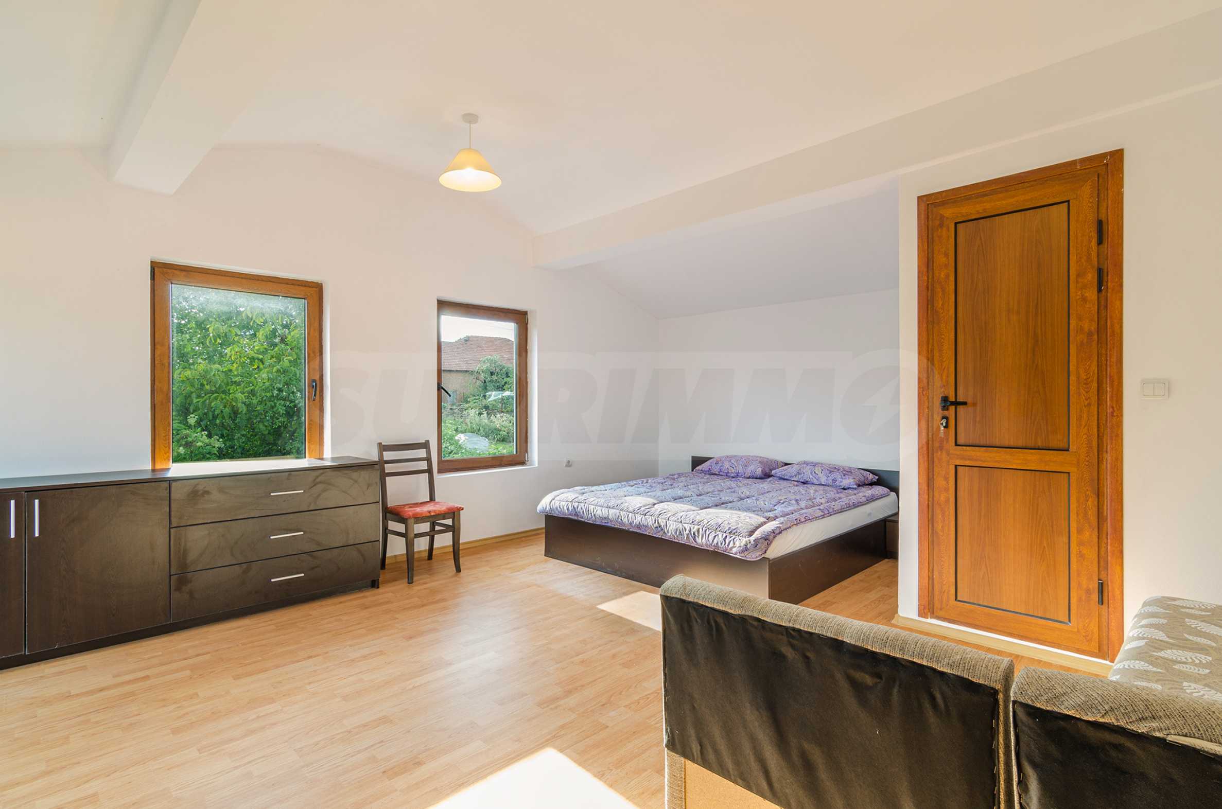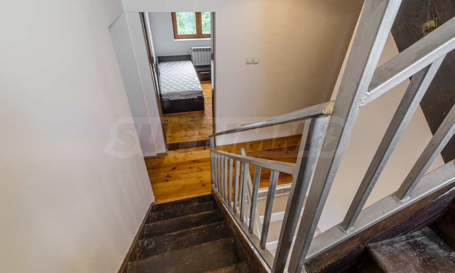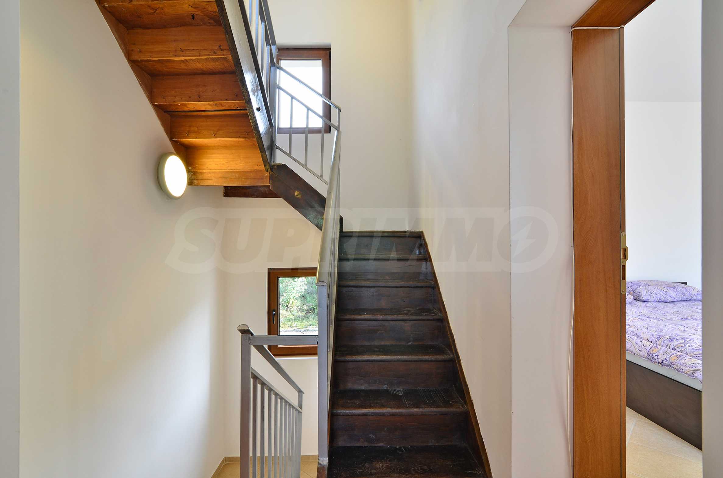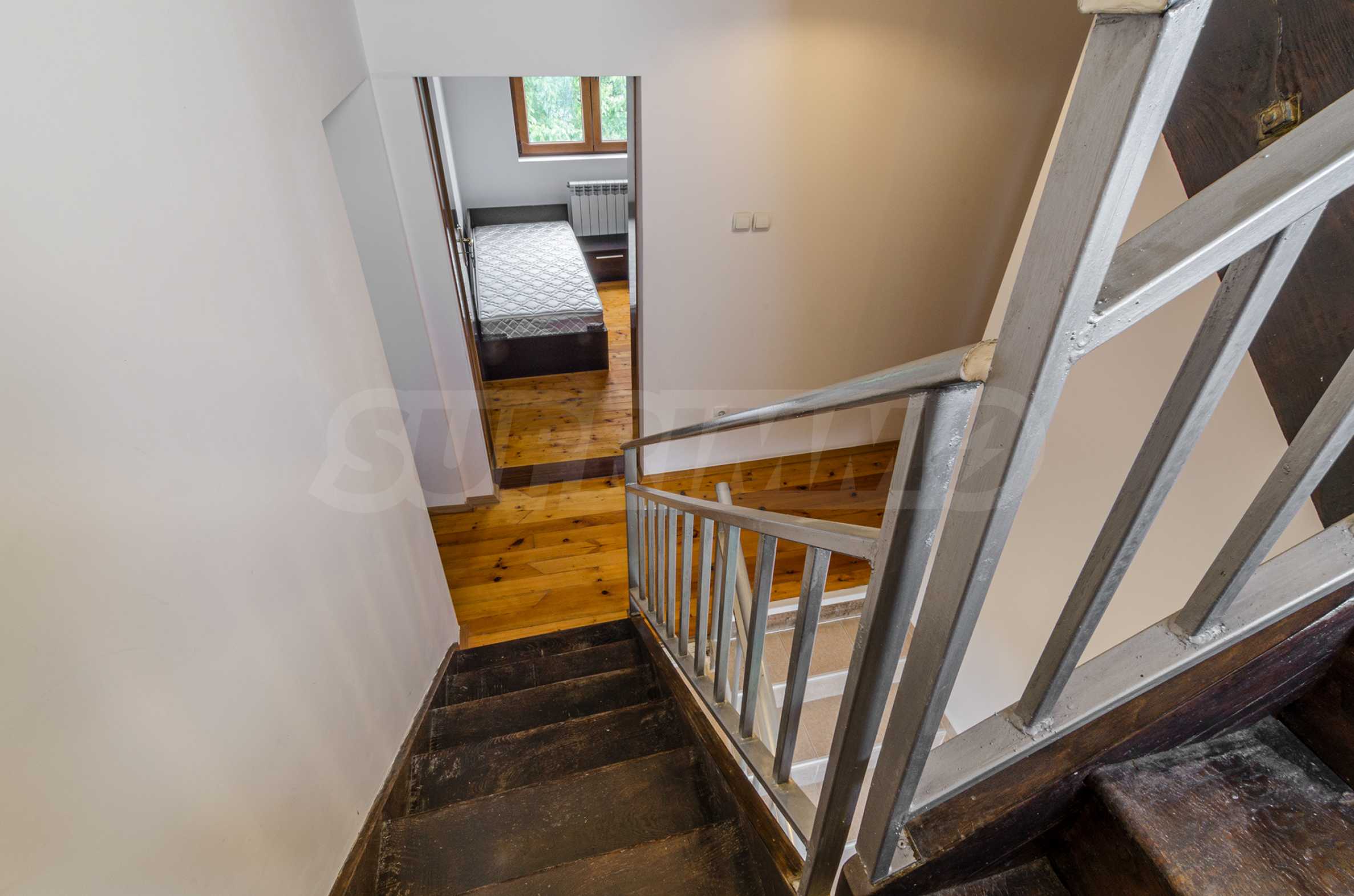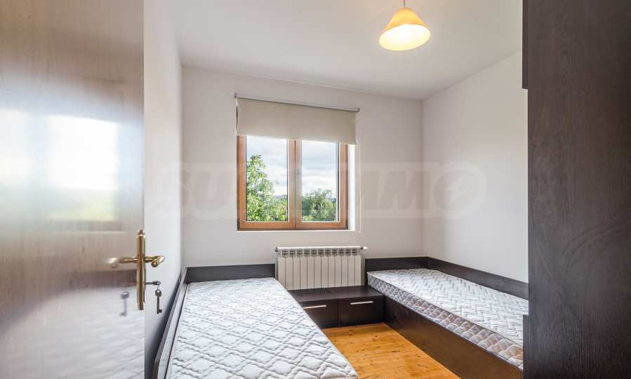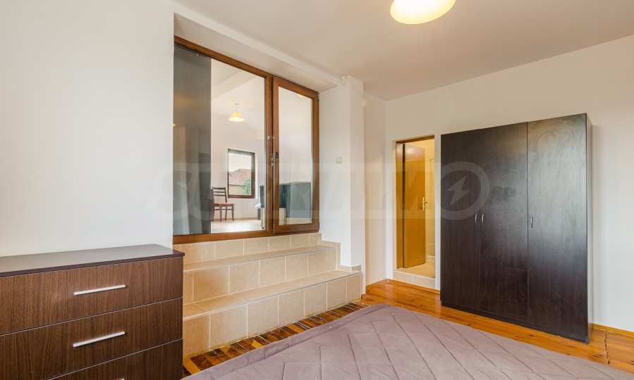 На приземния етаж ще откриете просторна кухня, трапезария, хол и една спалня. Освен това, има и самостоятелен апартамент с една спалня, който разполага с отделен вход от градината. На същото ниво се намират две бани. Горният етаж включва четири спални и три бани, като една от спалните има самостоятелен достъп през външно стълбище и тераса. В подпокривното пространство е обособен малък апартамент със собствена баня и тераса.