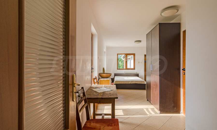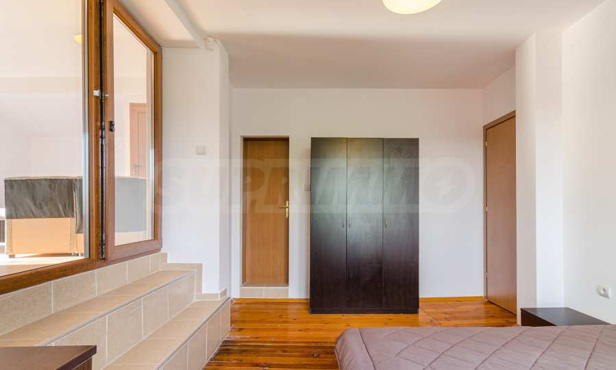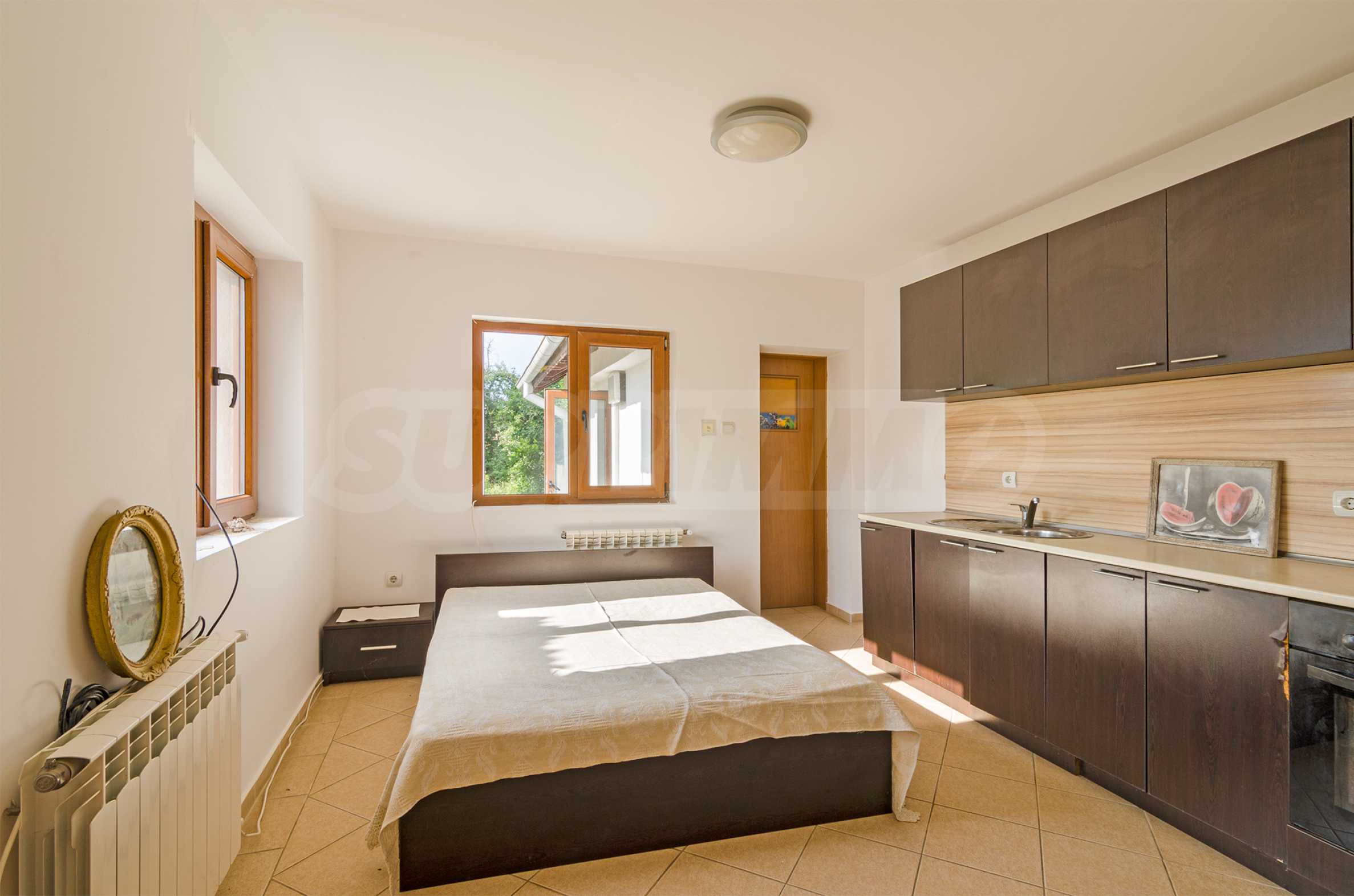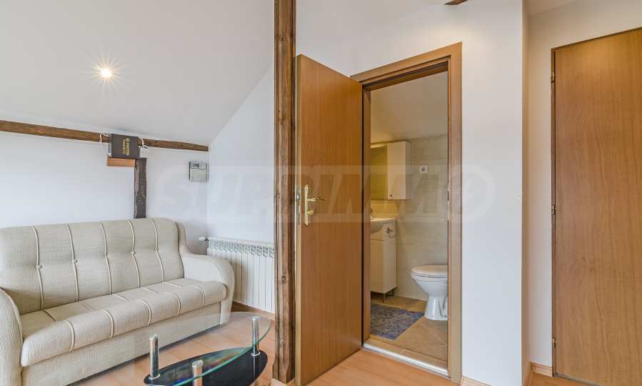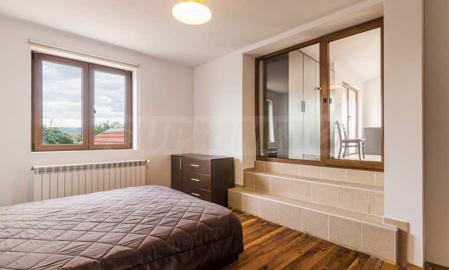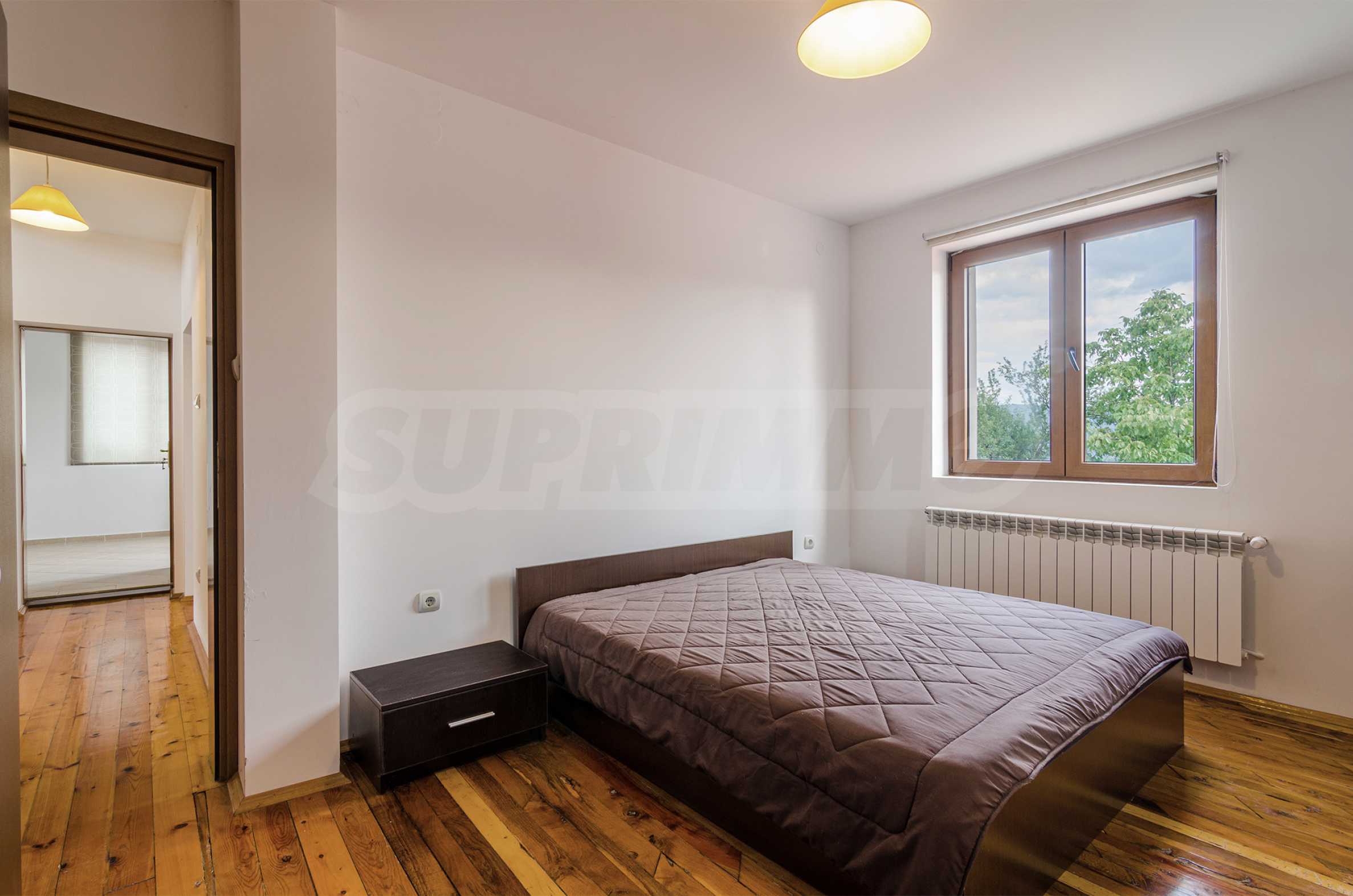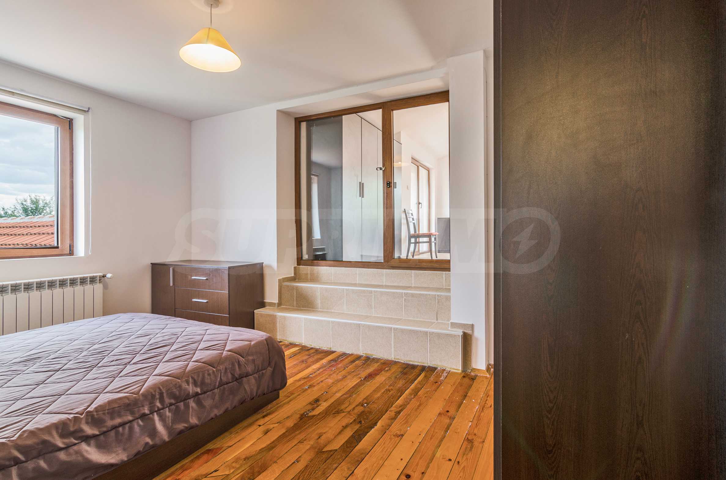 На приземния етаж ще откриете просторна кухня, трапезария, хол и една спалня. Освен това, има и самостоятелен апартамент с една спалня, който разполага с отделен вход от градината. На същото ниво се намират две бани. Горният етаж включва четири спални и три бани, като една от спалните има самостоятелен достъп през външно стълбище и тераса. В подпокривното пространство е обособен малък апартамент със собствена баня и тераса.