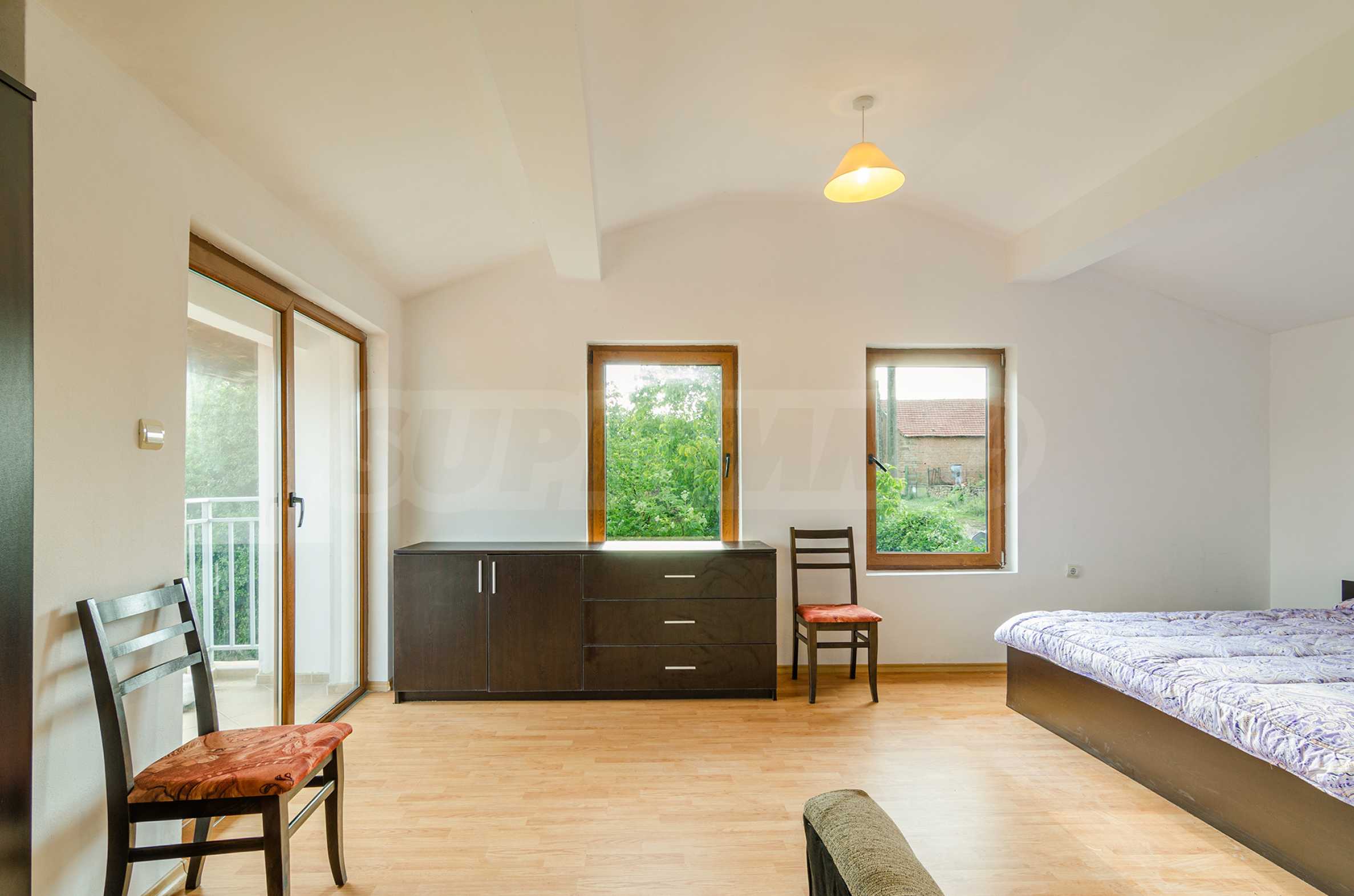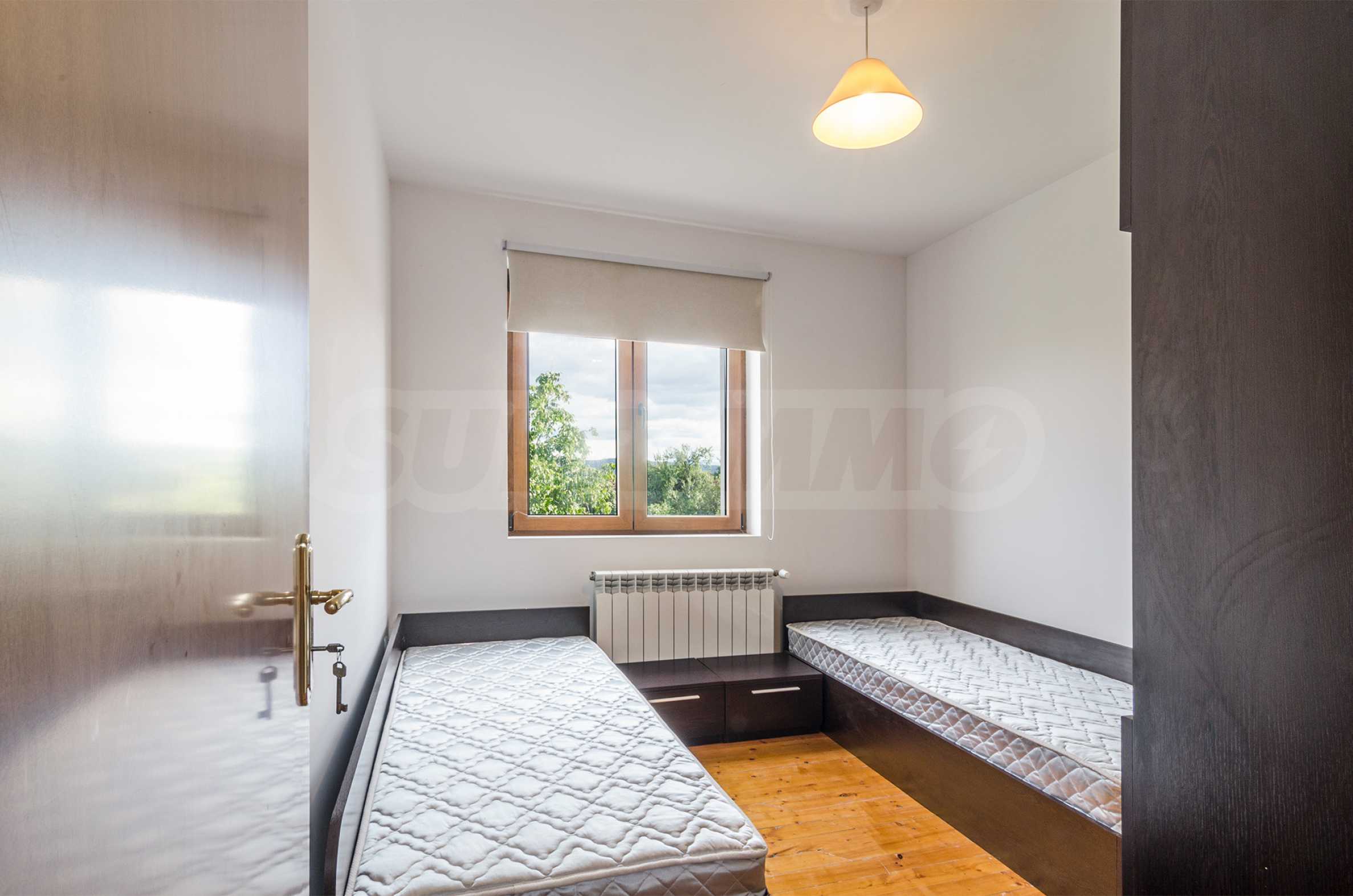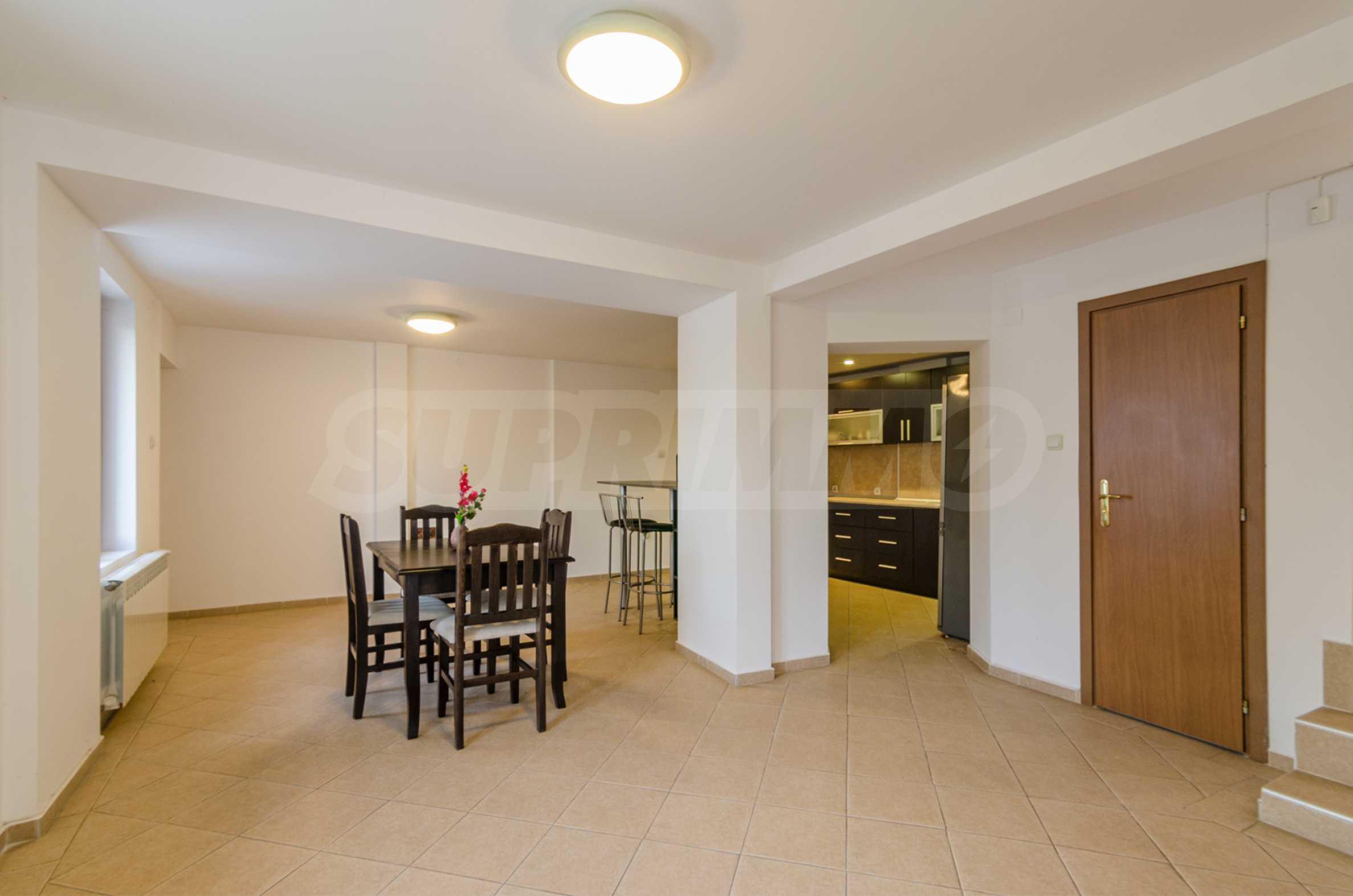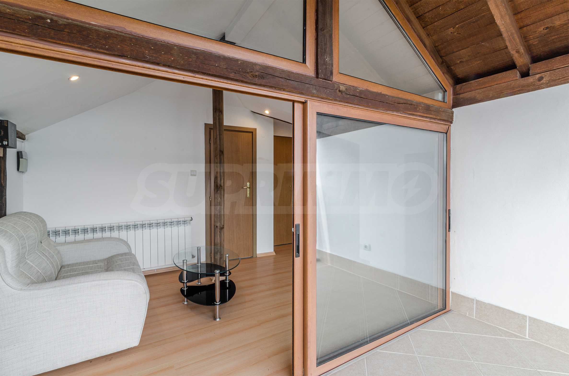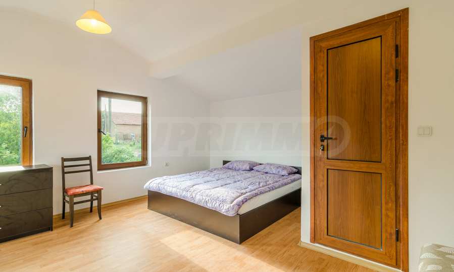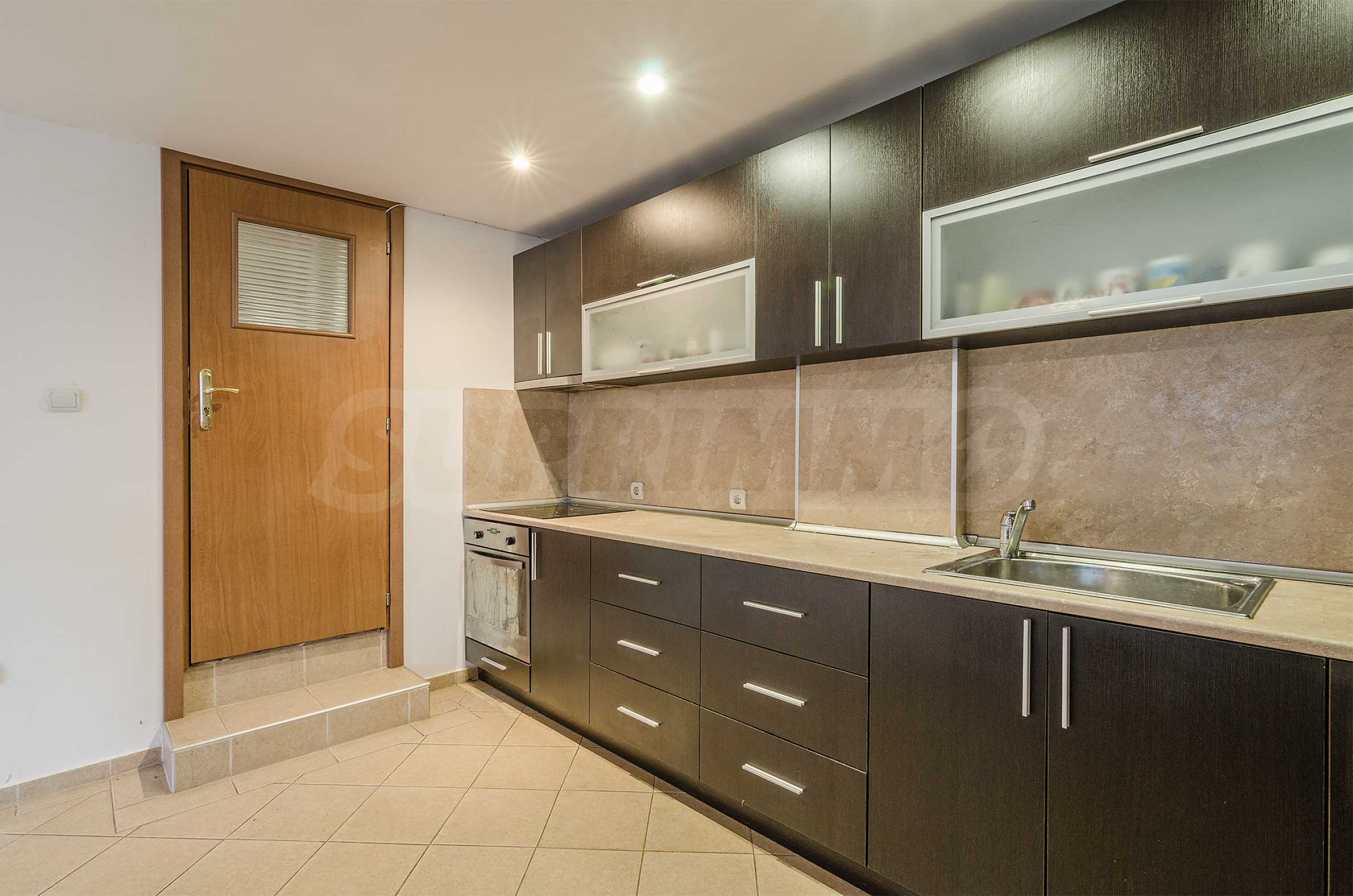 На приземния етаж ще откриете просторна кухня, трапезария, хол и една спалня. Освен това, има и самостоятелен апартамент с една спалня, който разполага с отделен вход от градината. На същото ниво се намират две бани. Горният етаж включва четири спални и три бани, като една от спалните има самостоятелен достъп през външно стълбище и тераса. В подпокривното пространство е обособен малък апартамент със собствена баня и тераса.