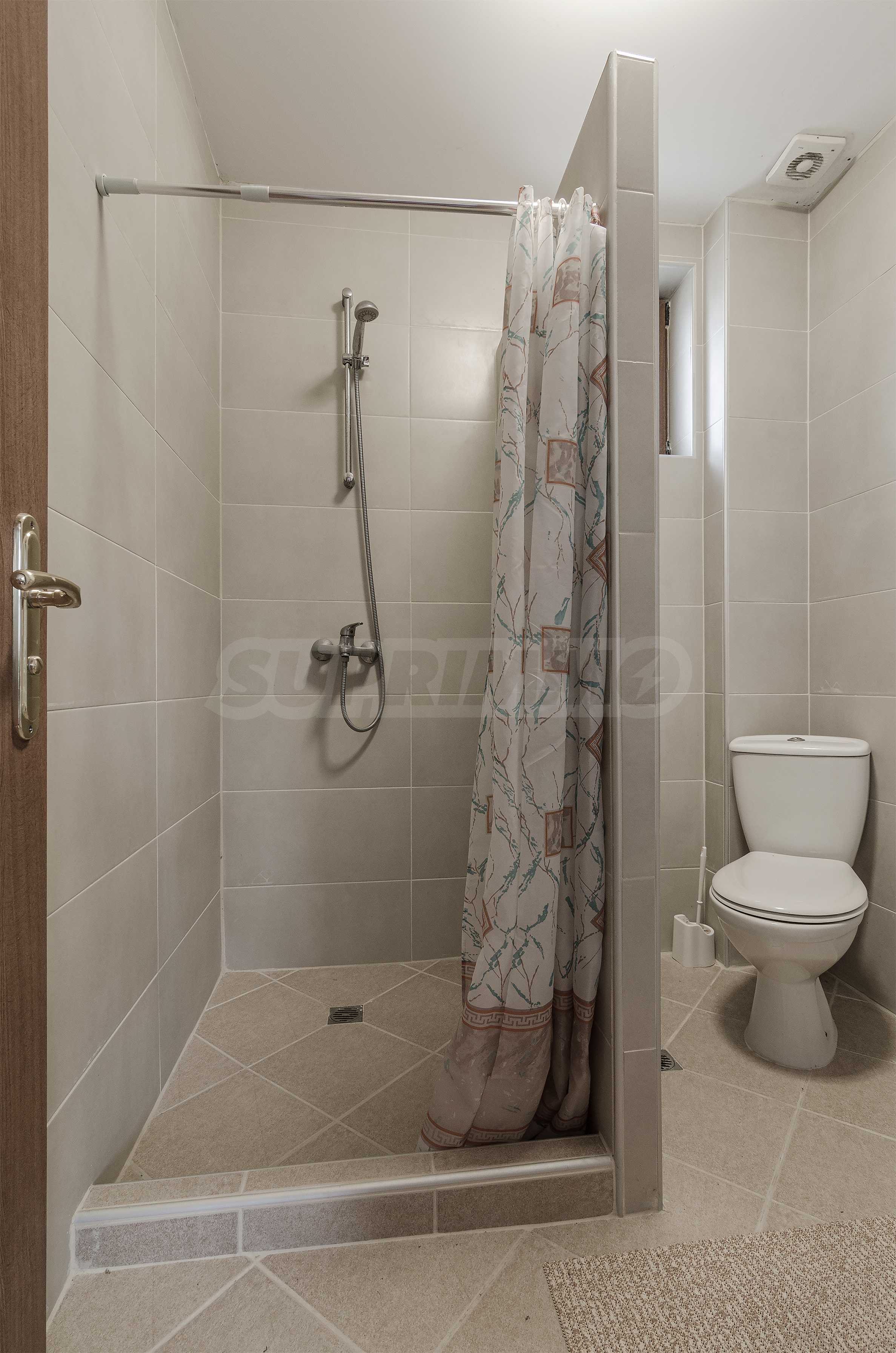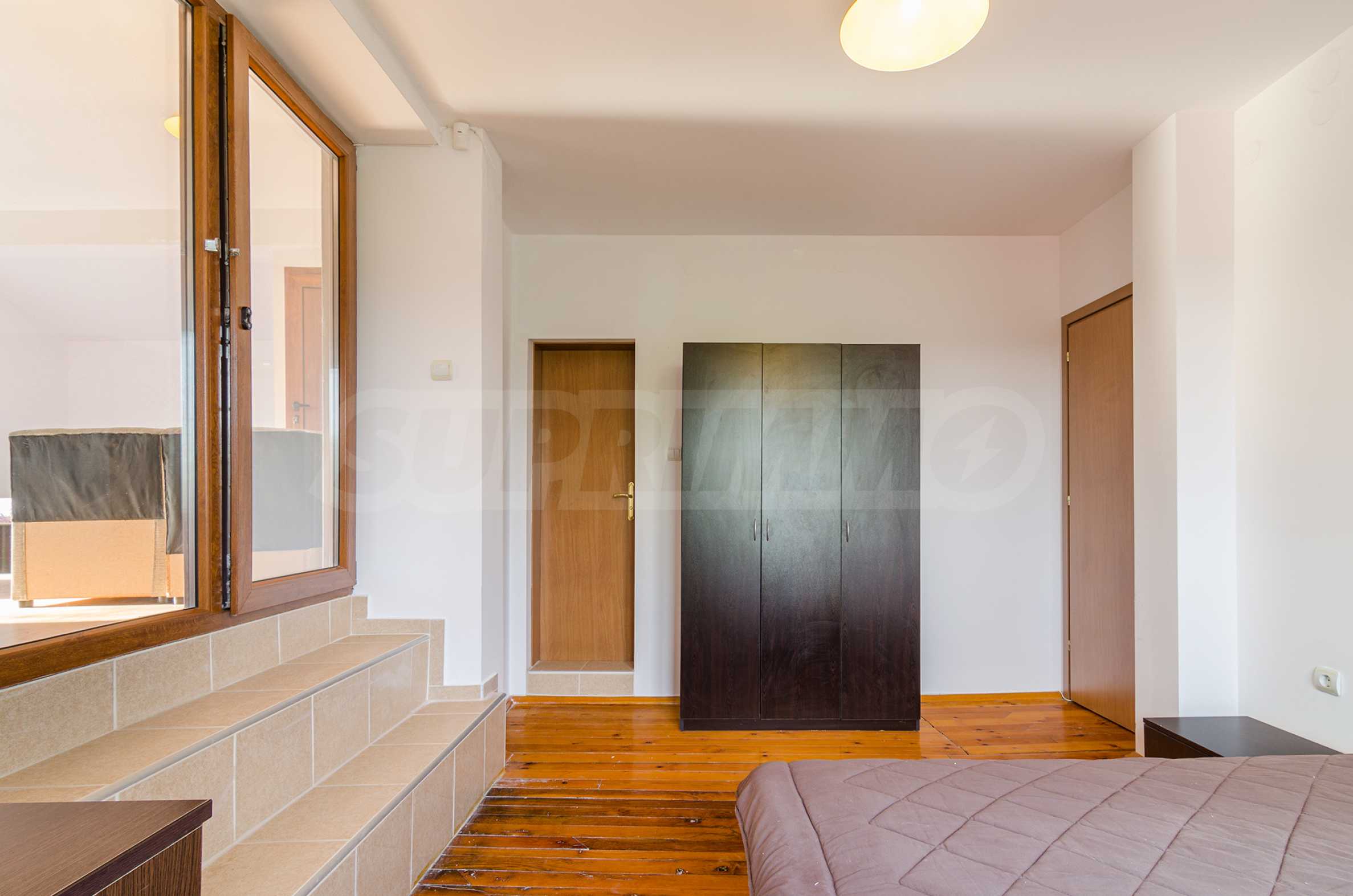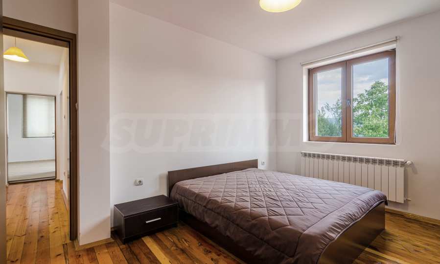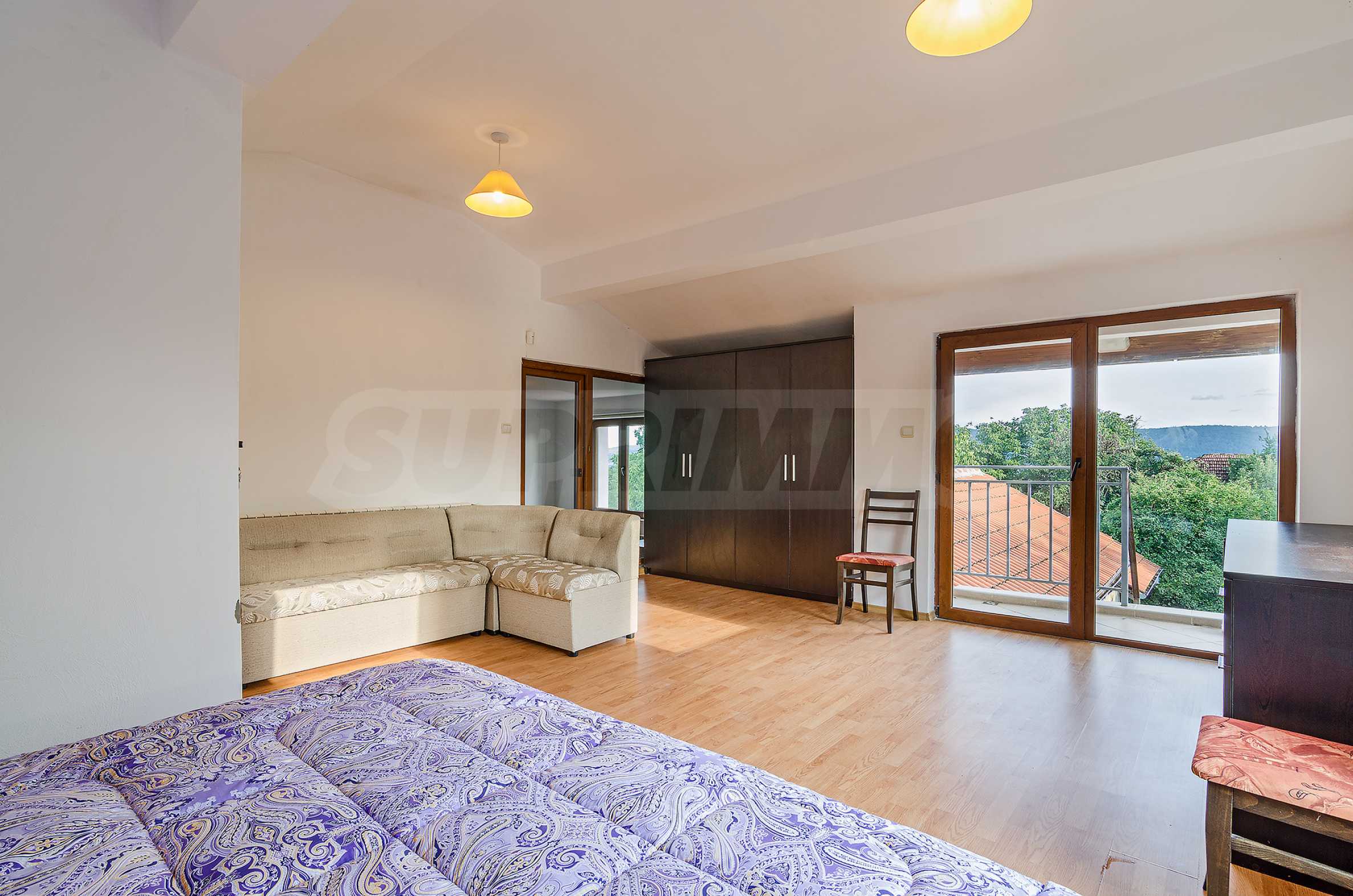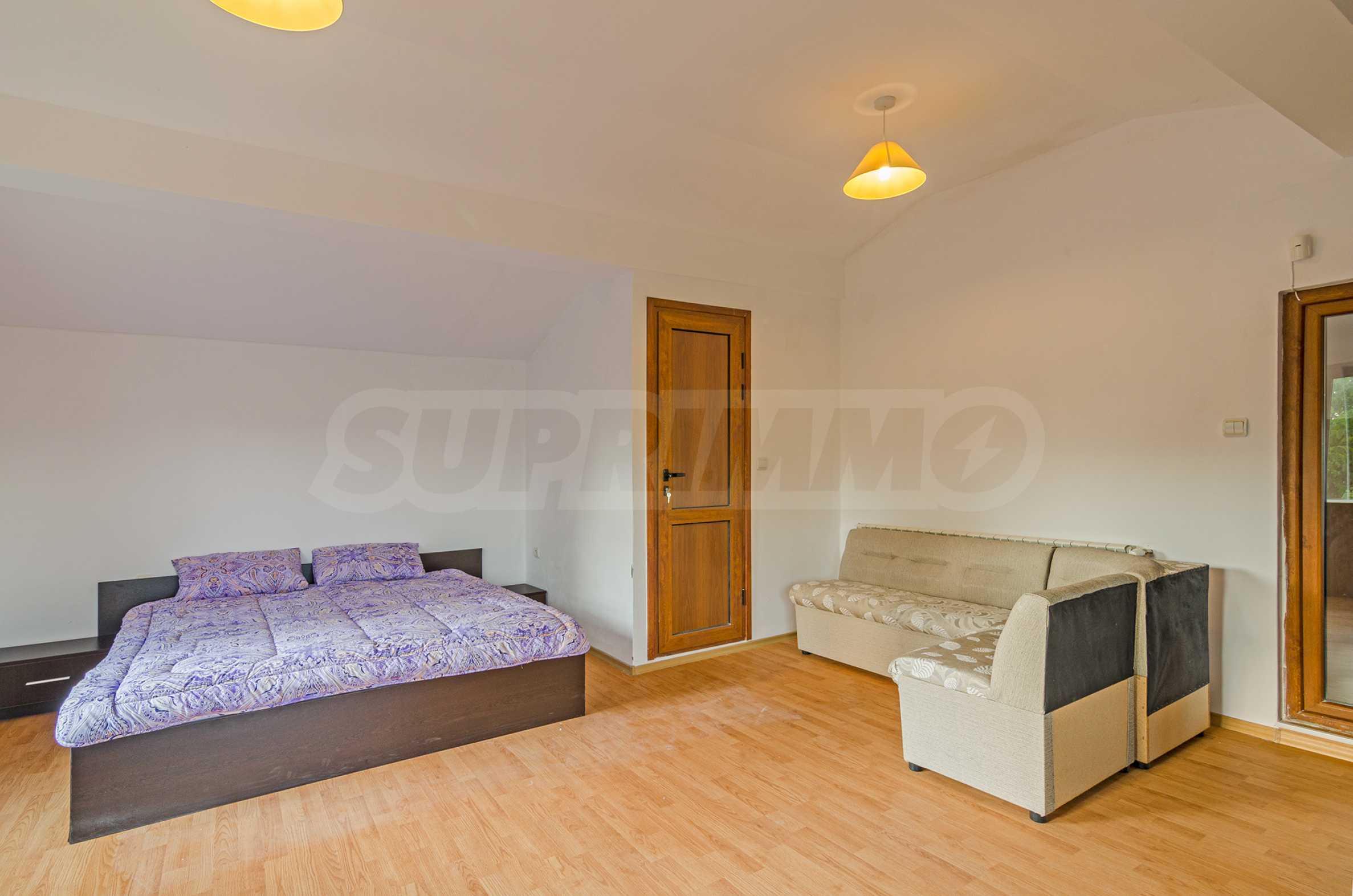 На приземния етаж ще откриете просторна кухня, трапезария, хол и една спалня. Освен това, има и самостоятелен апартамент с една спалня, който разполага с отделен вход от градината. На същото ниво се намират две бани. Горният етаж включва четири спални и три бани, като една от спалните има самостоятелен достъп през външно стълбище и тераса. В подпокривното пространство е обособен малък апартамент със собствена баня и тераса.