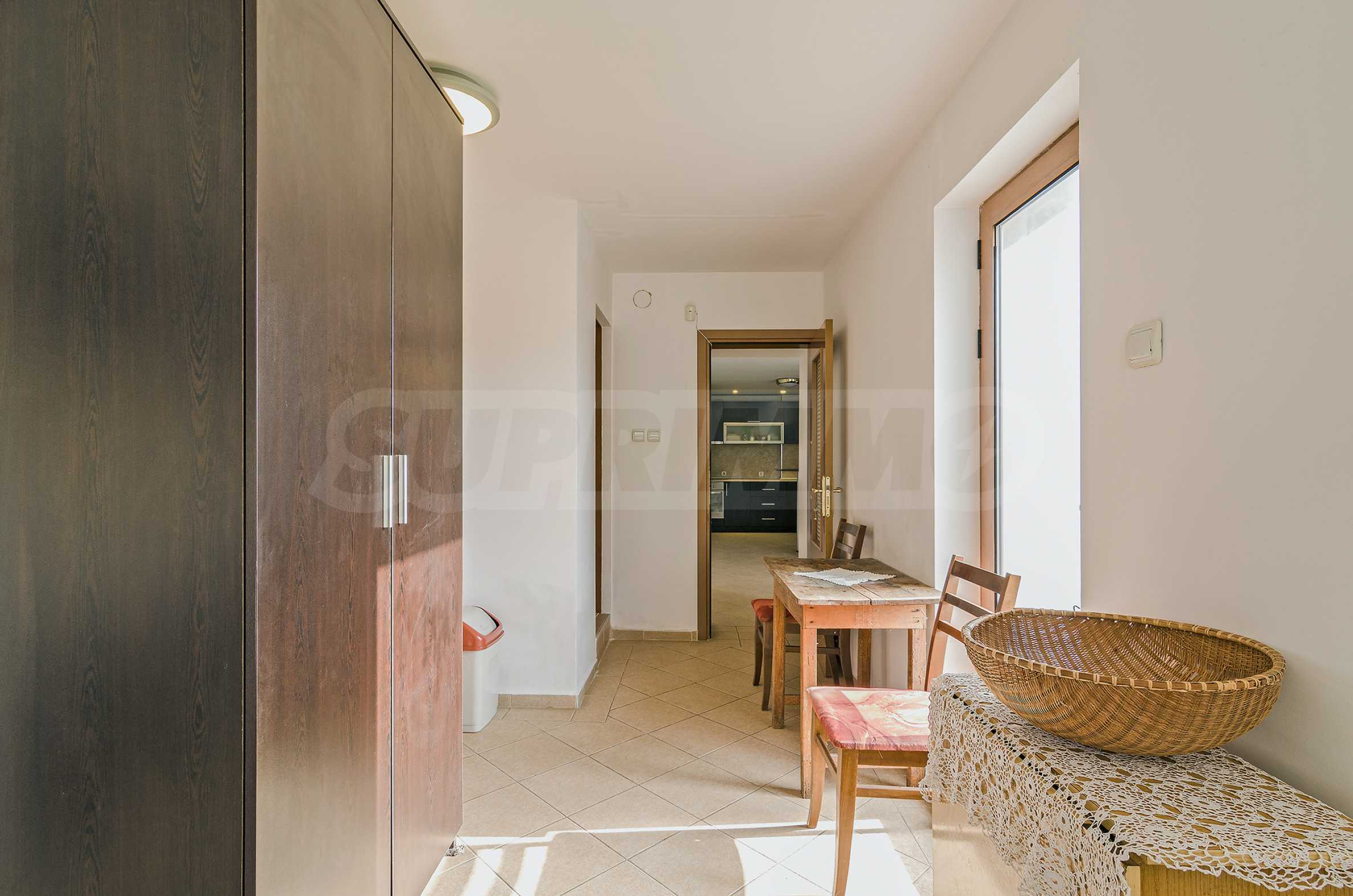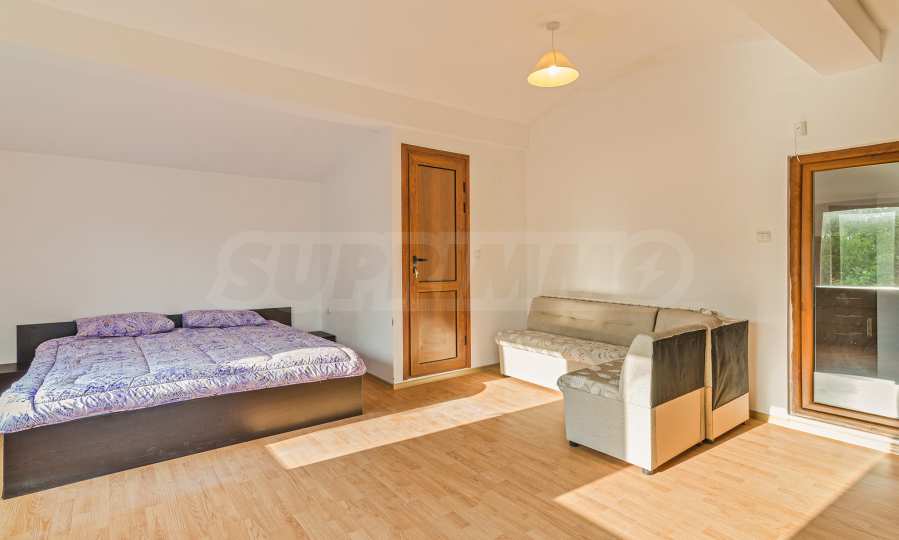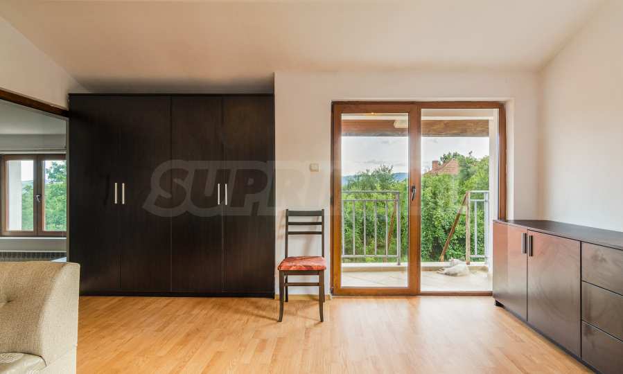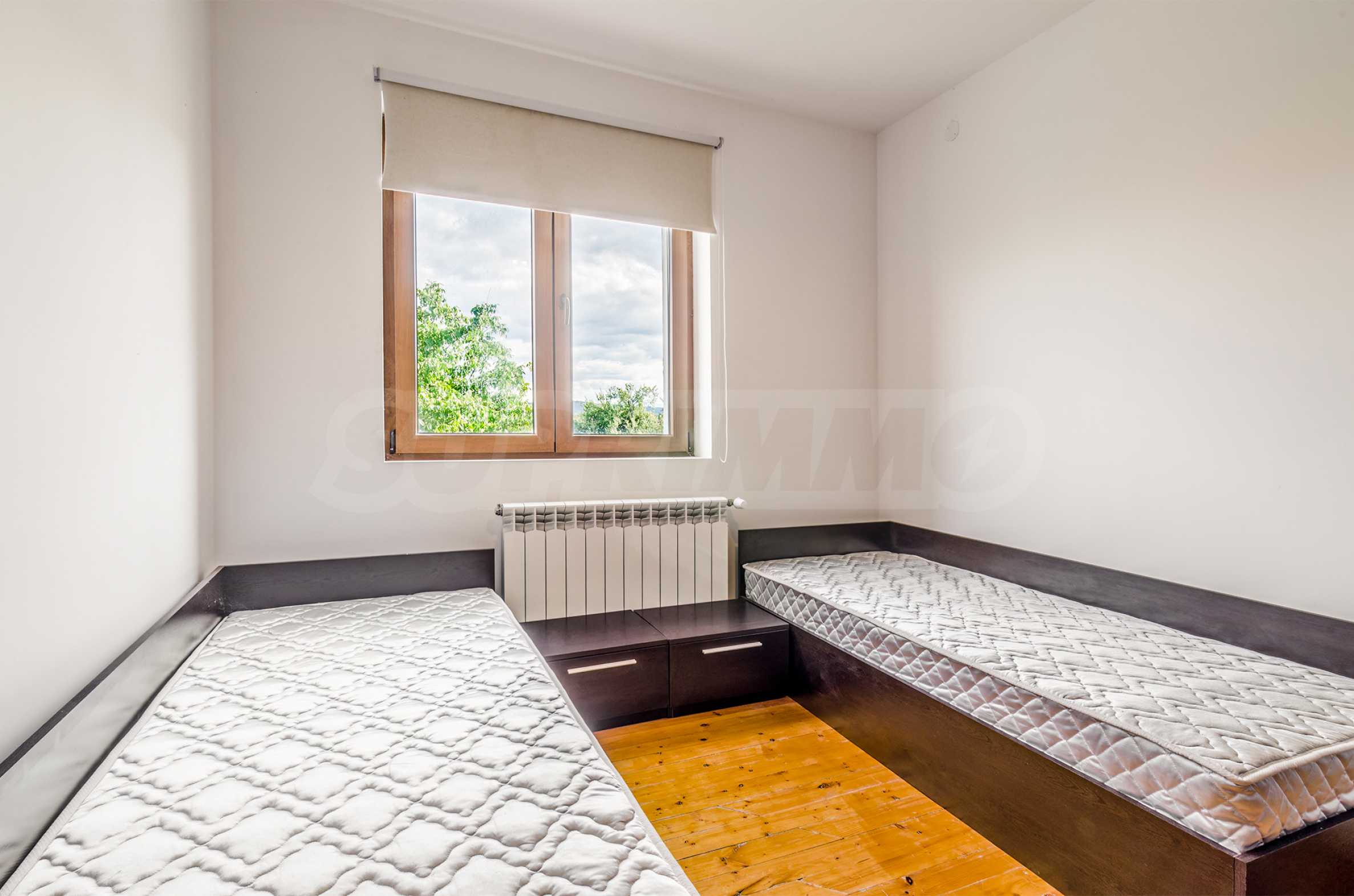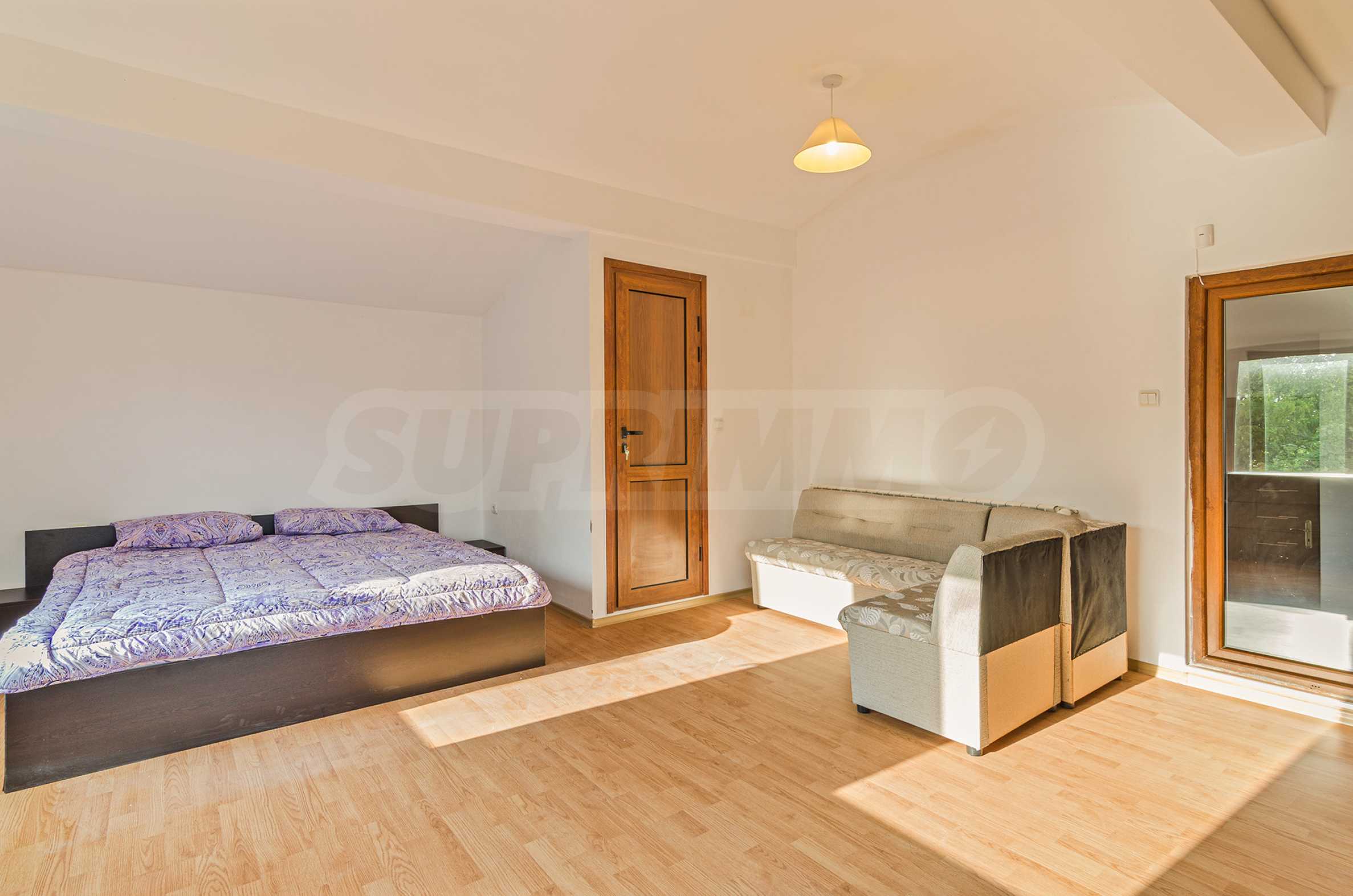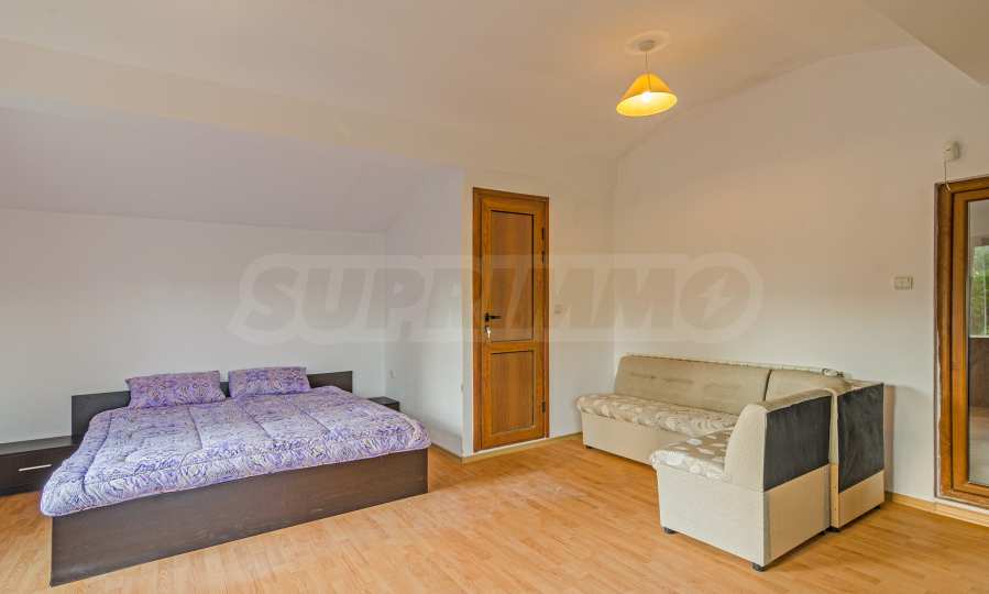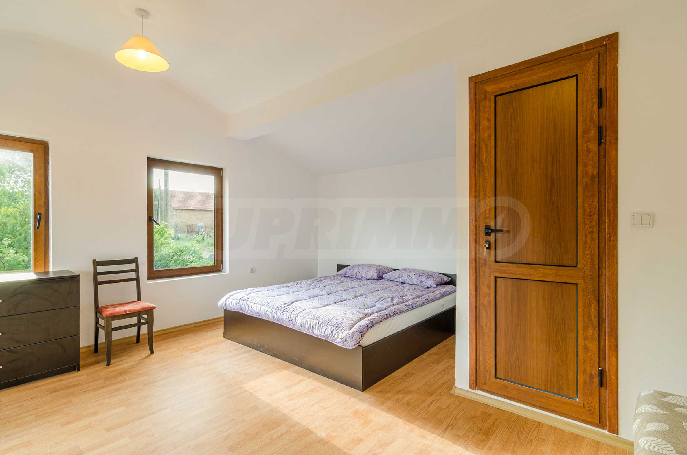 На приземния етаж ще откриете просторна кухня, трапезария, хол и една спалня. Освен това, има и самостоятелен апартамент с една спалня, който разполага с отделен вход от градината. На същото ниво се намират две бани. Горният етаж включва четири спални и три бани, като една от спалните има самостоятелен достъп през външно стълбище и тераса. В подпокривното пространство е обособен малък апартамент със собствена баня и тераса.