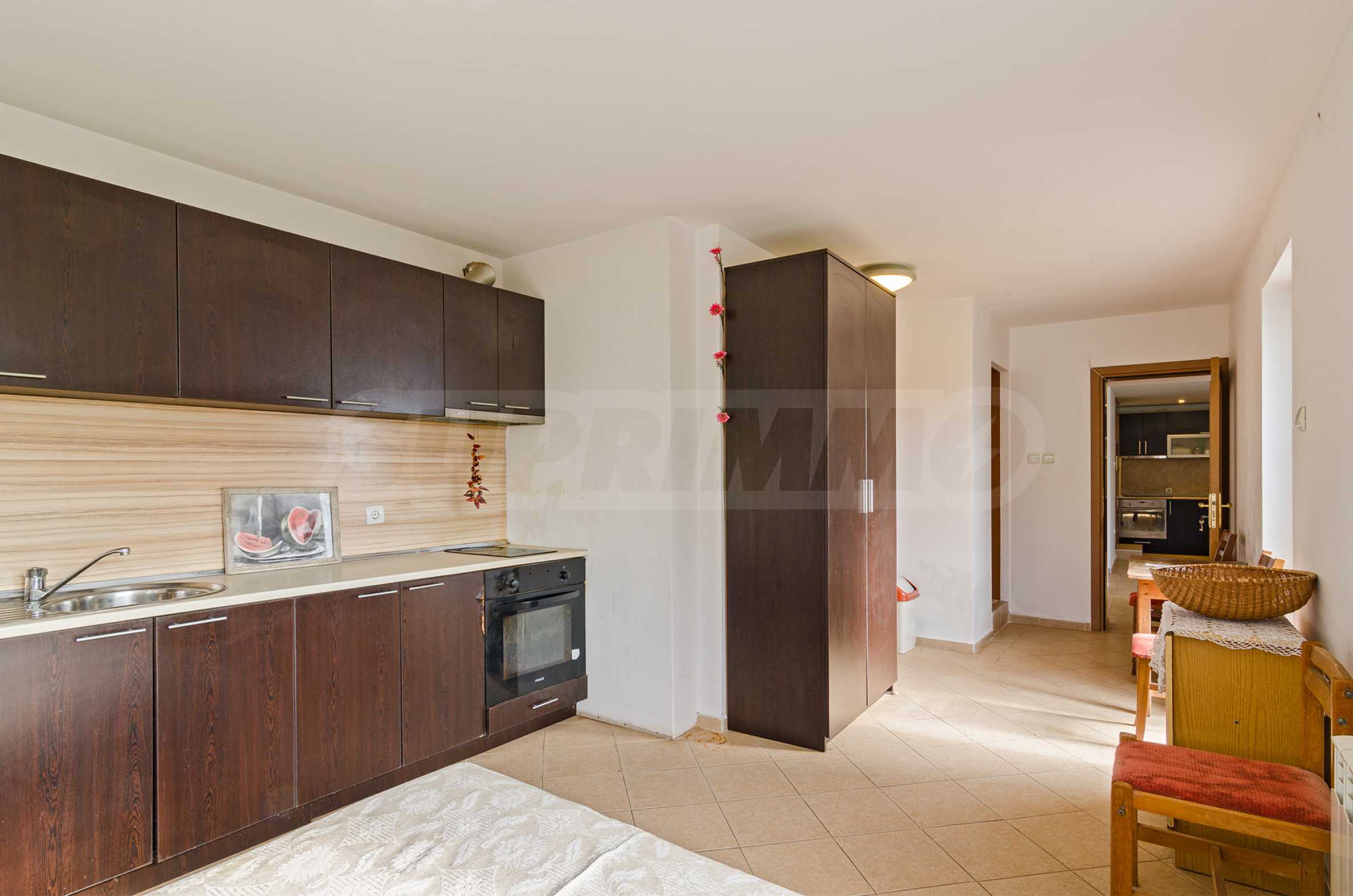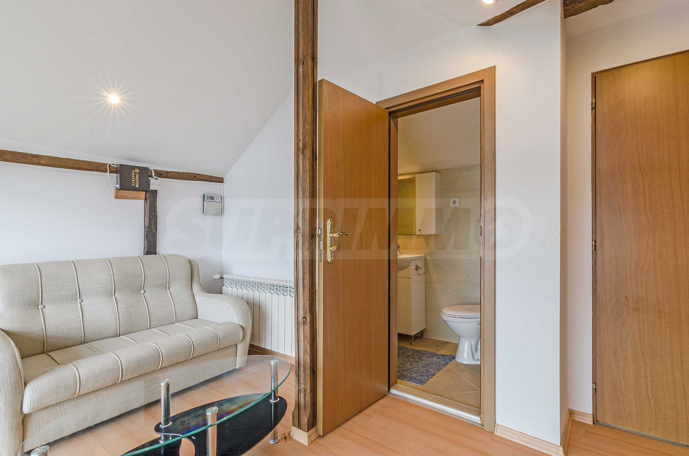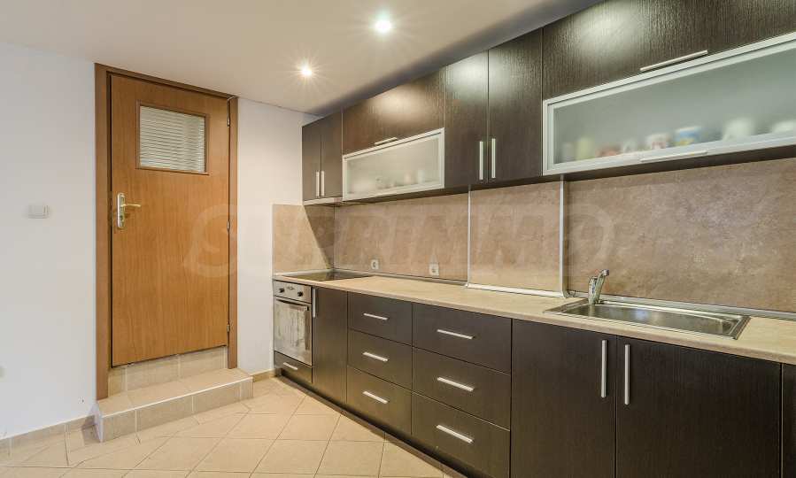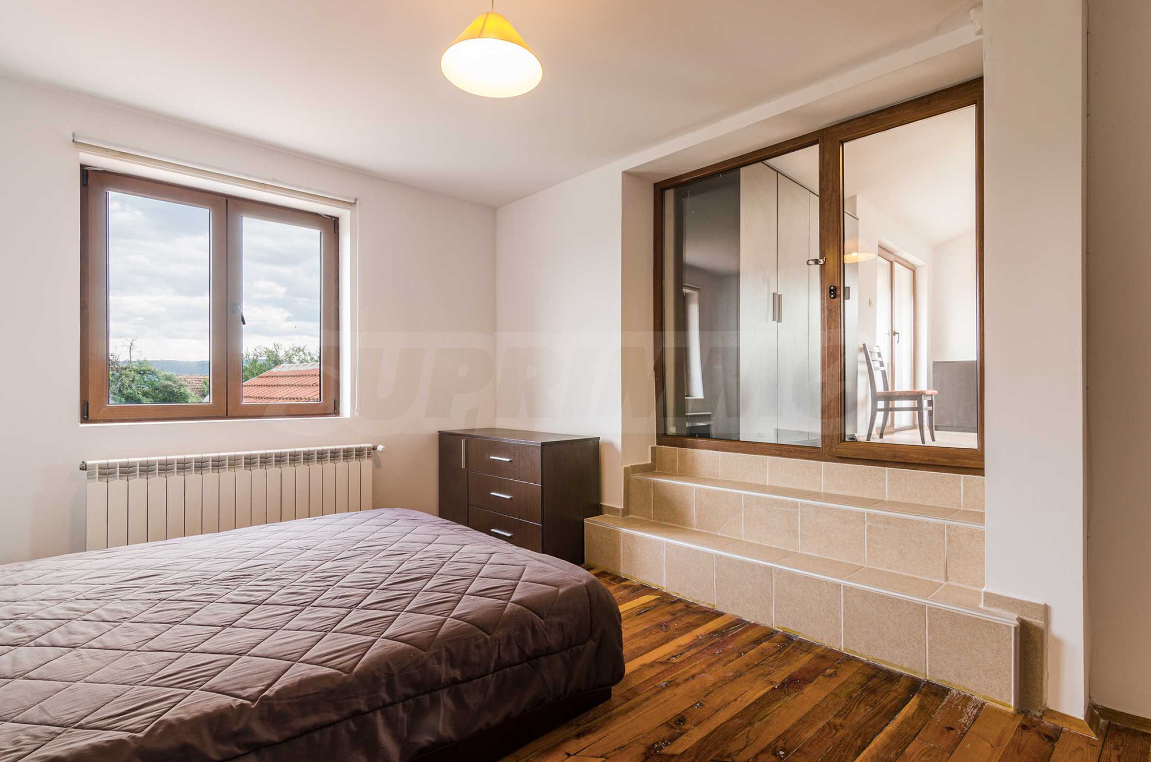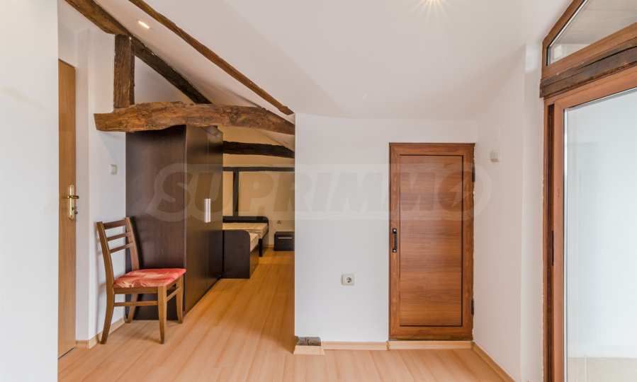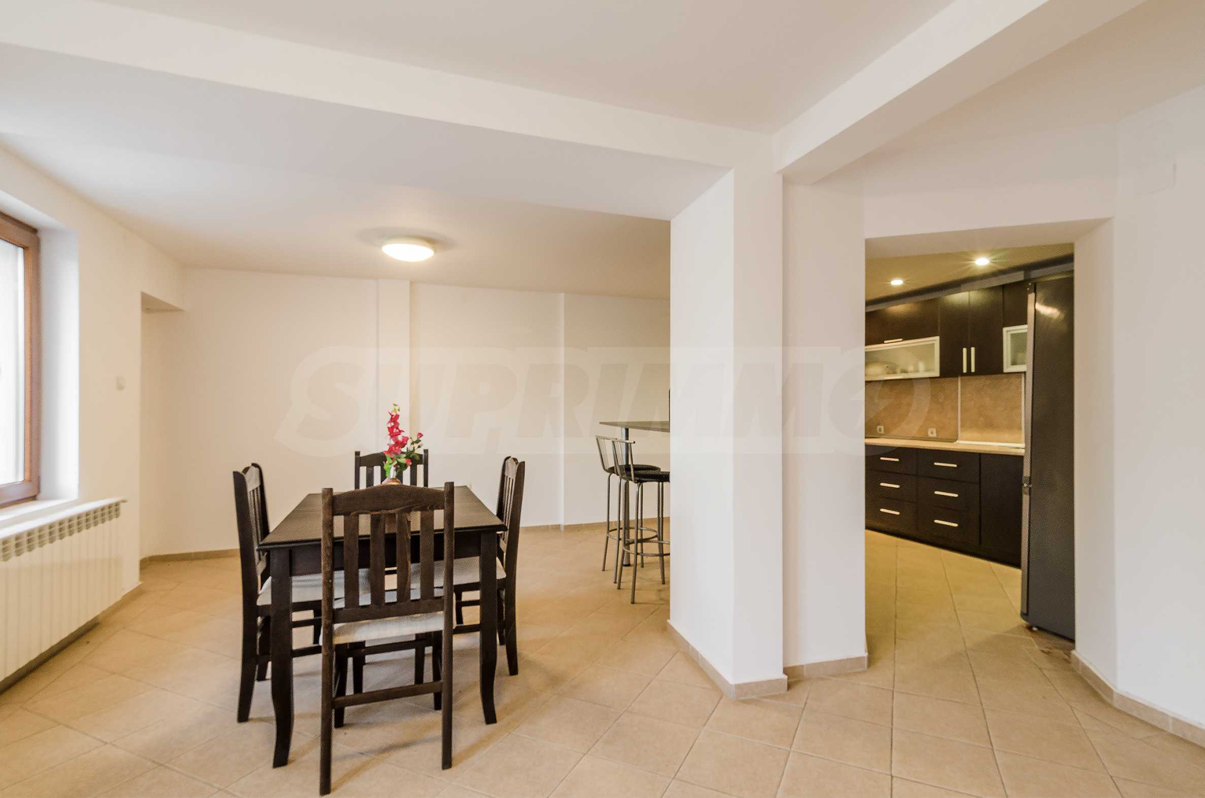 На приземния етаж ще откриете просторна кухня, трапезария, хол и една спалня. Освен това, има и самостоятелен апартамент с една спалня, който разполага с отделен вход от градината. На същото ниво се намират две бани. Горният етаж включва четири спални и три бани, като една от спалните има самостоятелен достъп през външно стълбище и тераса. В подпокривното пространство е обособен малък апартамент със собствена баня и тераса.