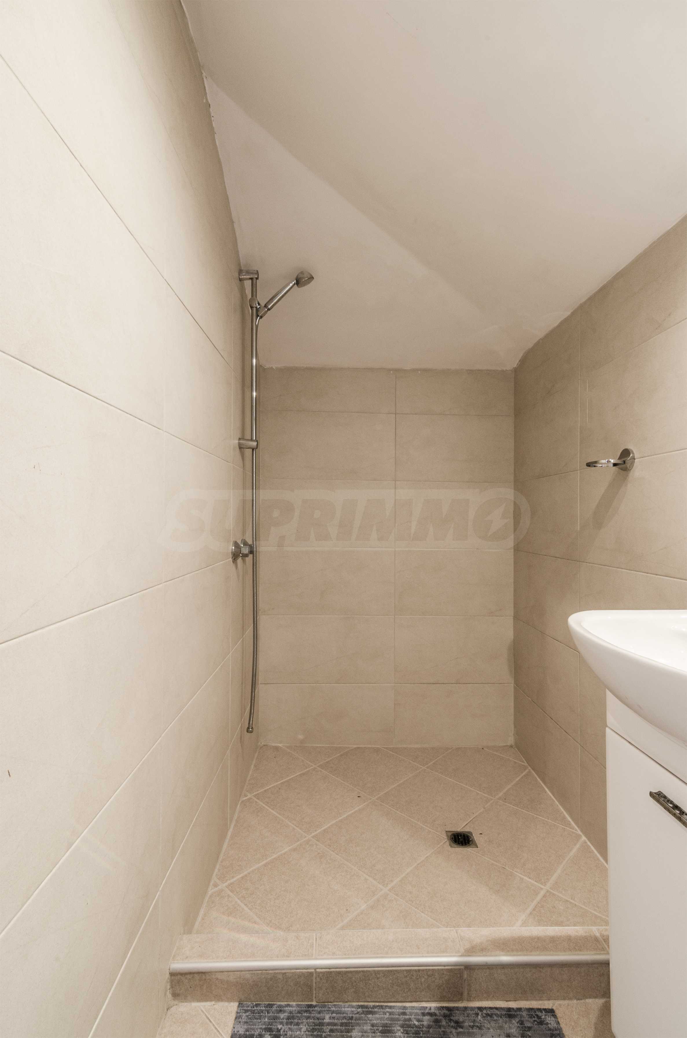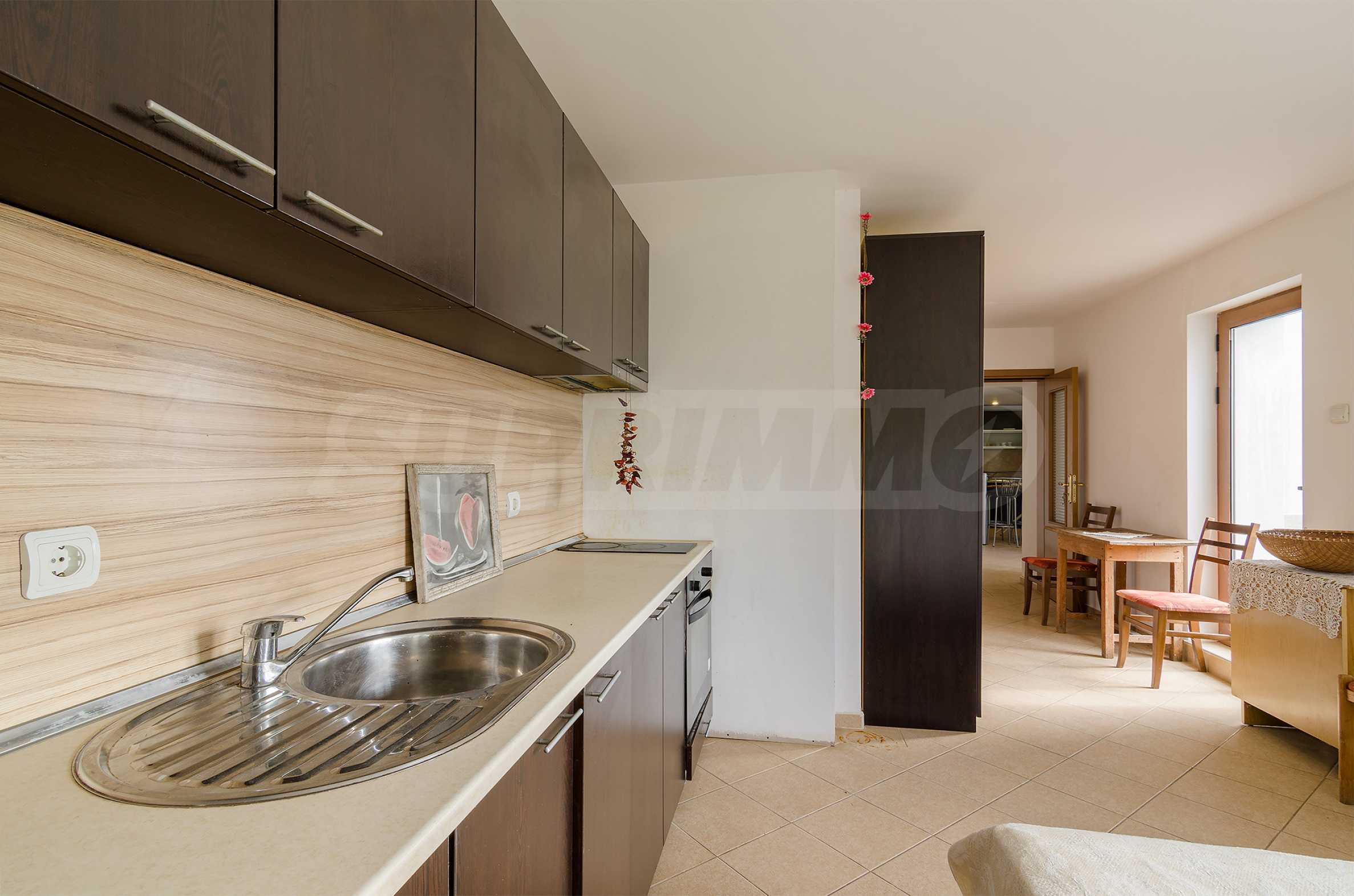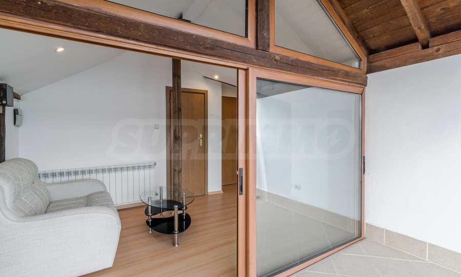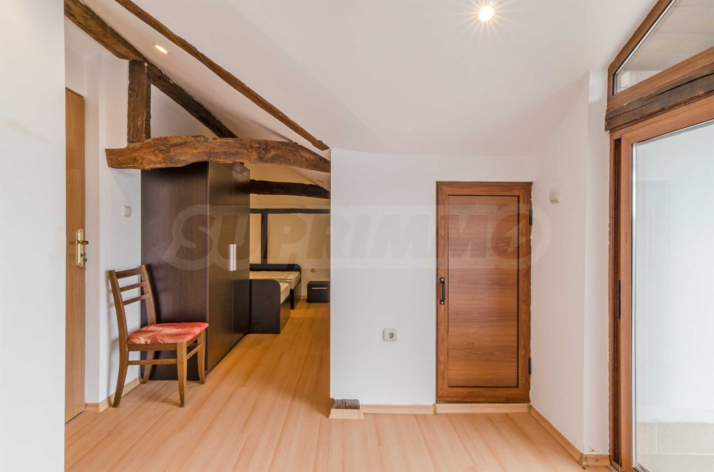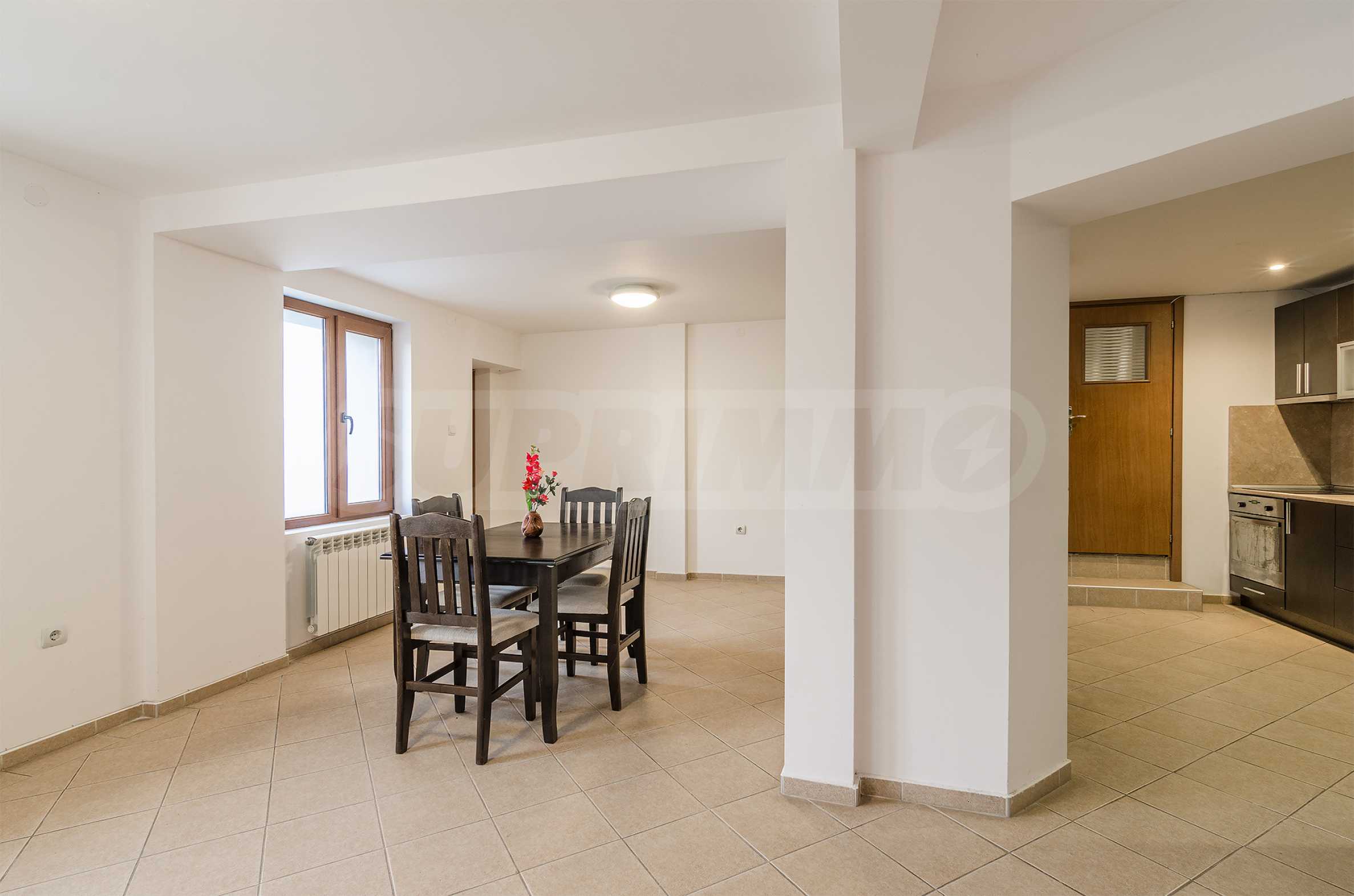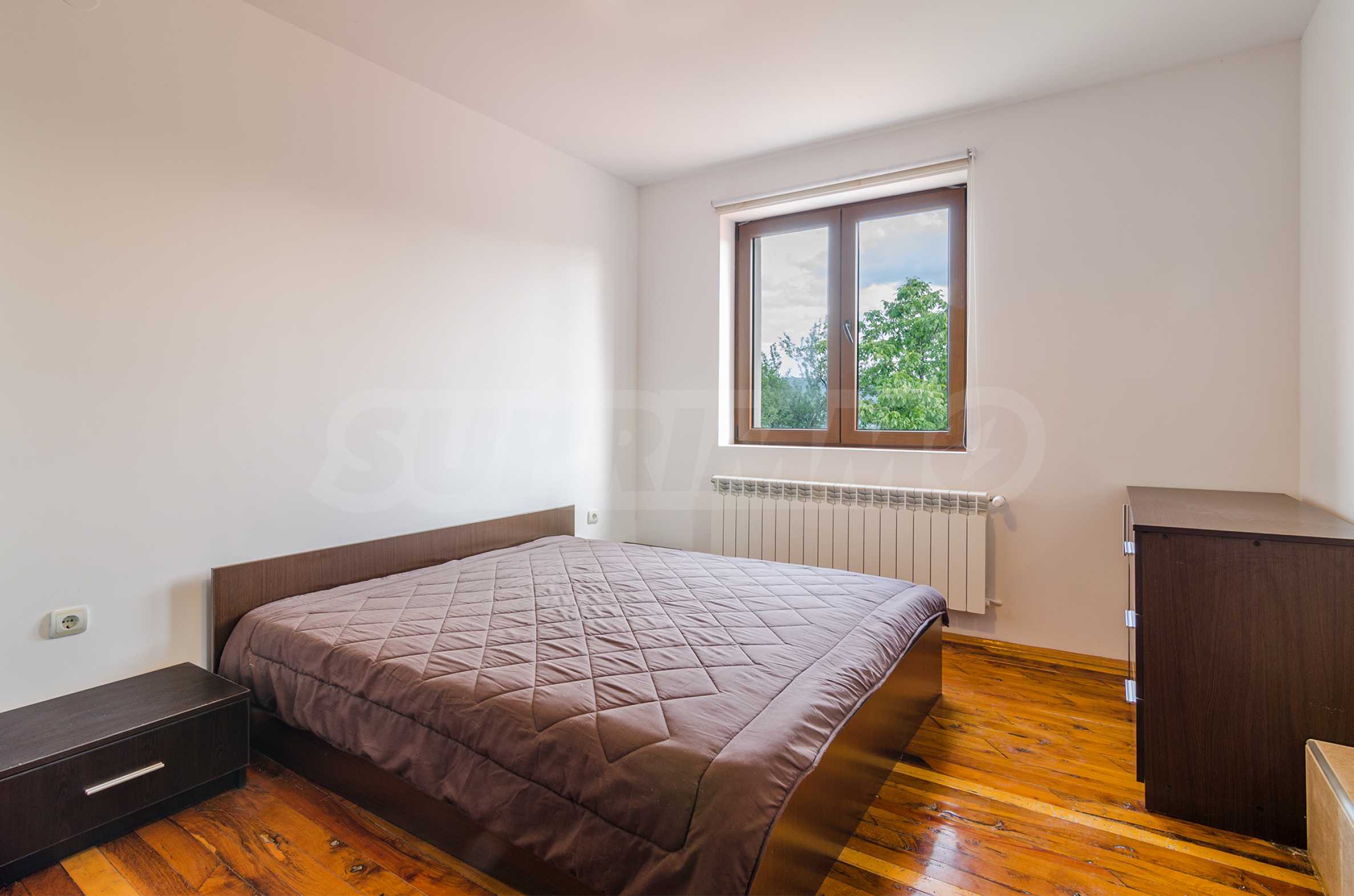 На приземния етаж ще откриете просторна кухня, трапезария, хол и една спалня. Освен това, има и самостоятелен апартамент с една спалня, който разполага с отделен вход от градината. На същото ниво се намират две бани. Горният етаж включва четири спални и три бани, като една от спалните има самостоятелен достъп през външно стълбище и тераса. В подпокривното пространство е обособен малък апартамент със собствена баня и тераса.