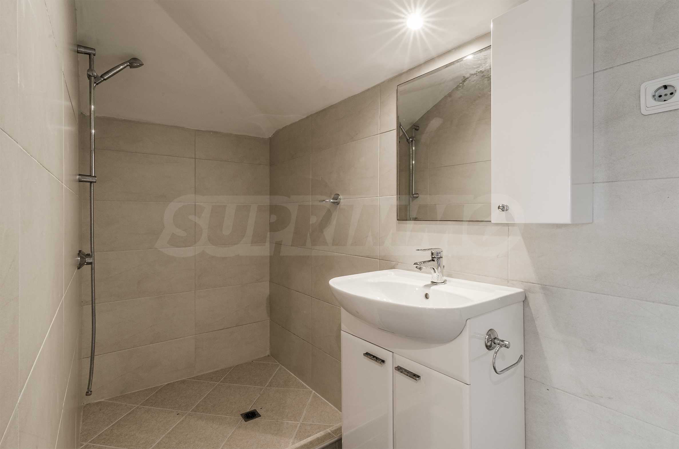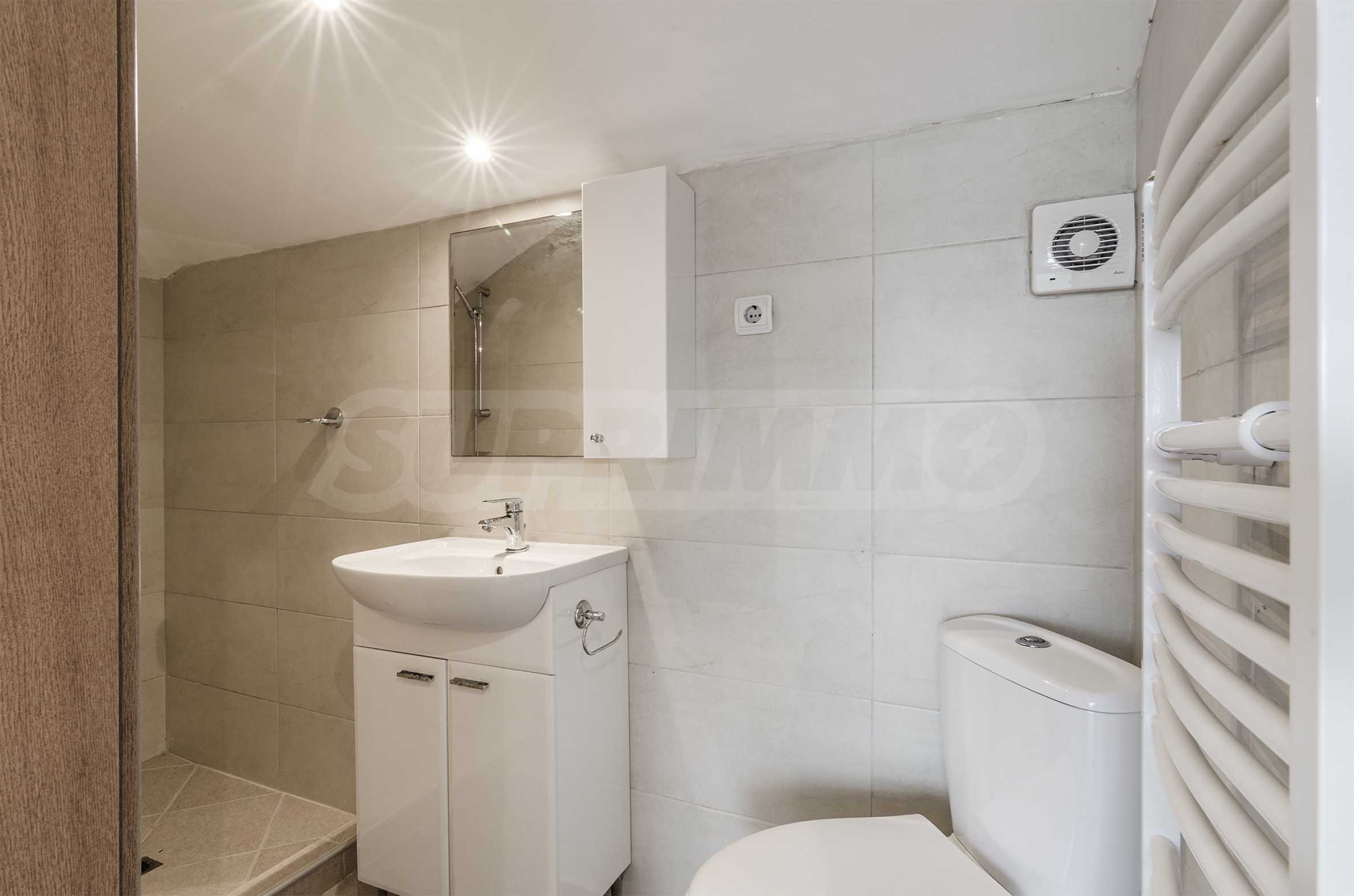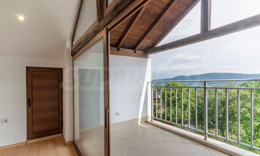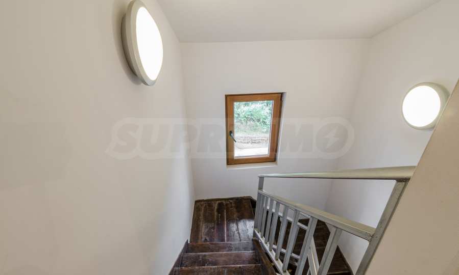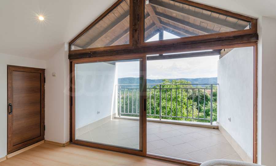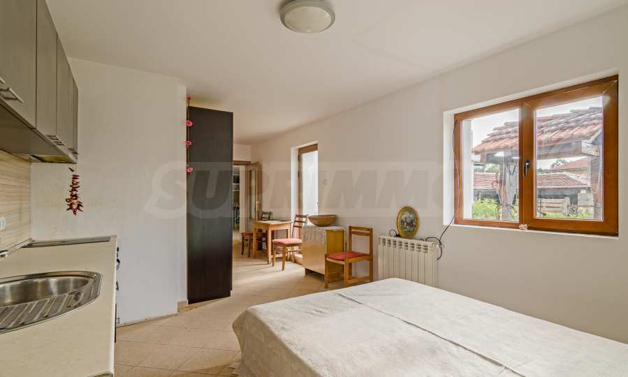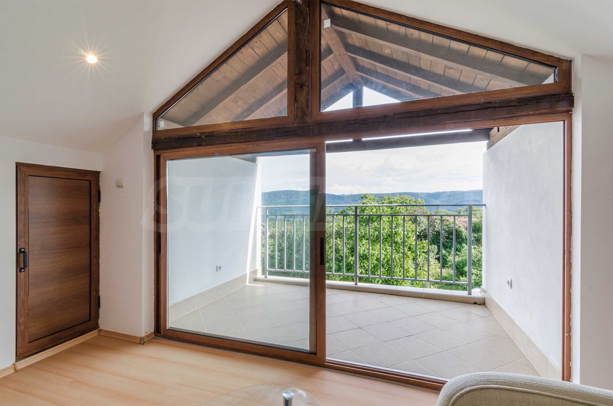 На приземния етаж ще откриете просторна кухня, трапезария, хол и една спалня. Освен това, има и самостоятелен апартамент с една спалня, който разполага с отделен вход от градината. На същото ниво се намират две бани. Горният етаж включва четири спални и три бани, като една от спалните има самостоятелен достъп през външно стълбище и тераса. В подпокривното пространство е обособен малък апартамент със собствена баня и тераса.