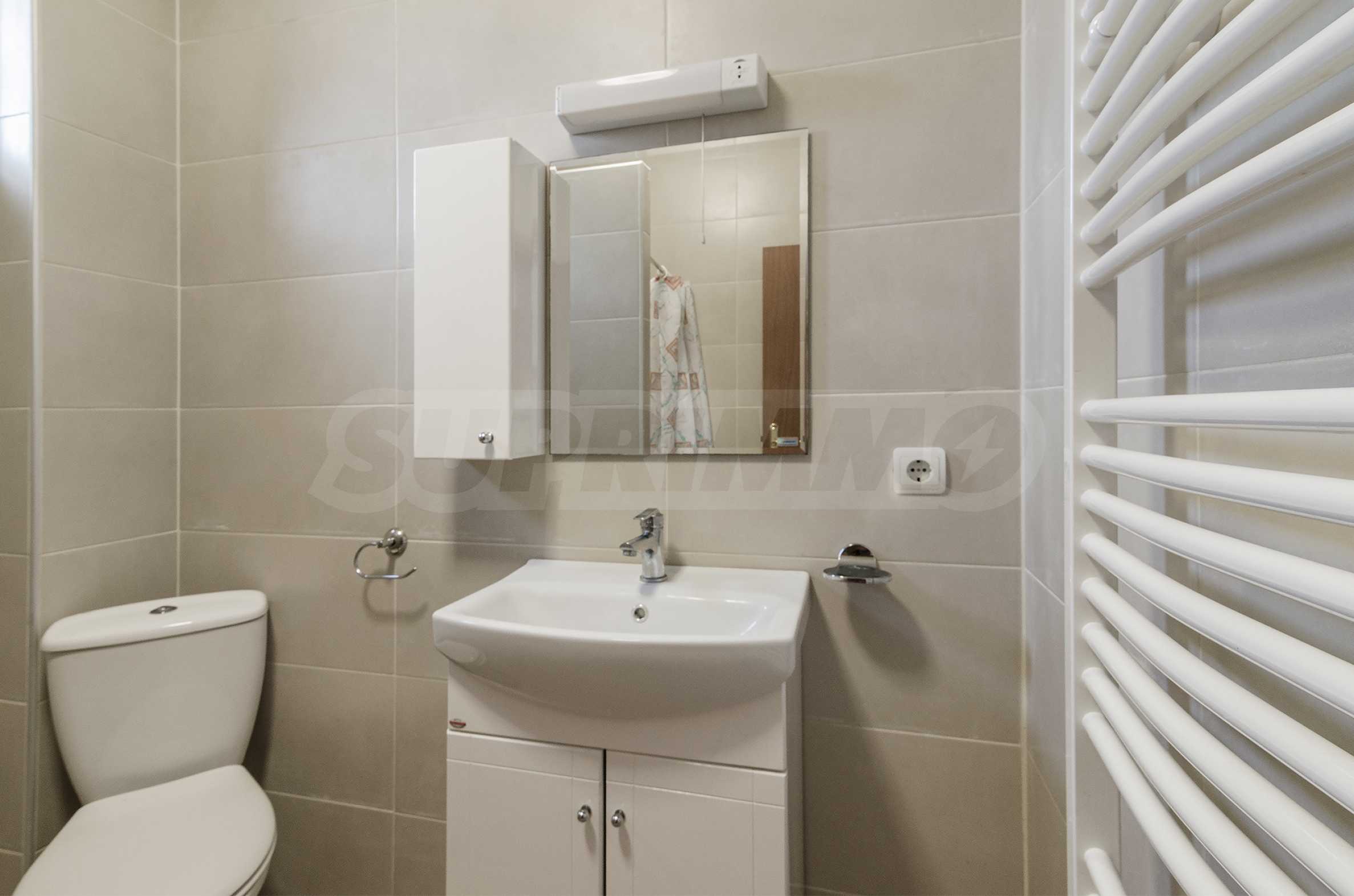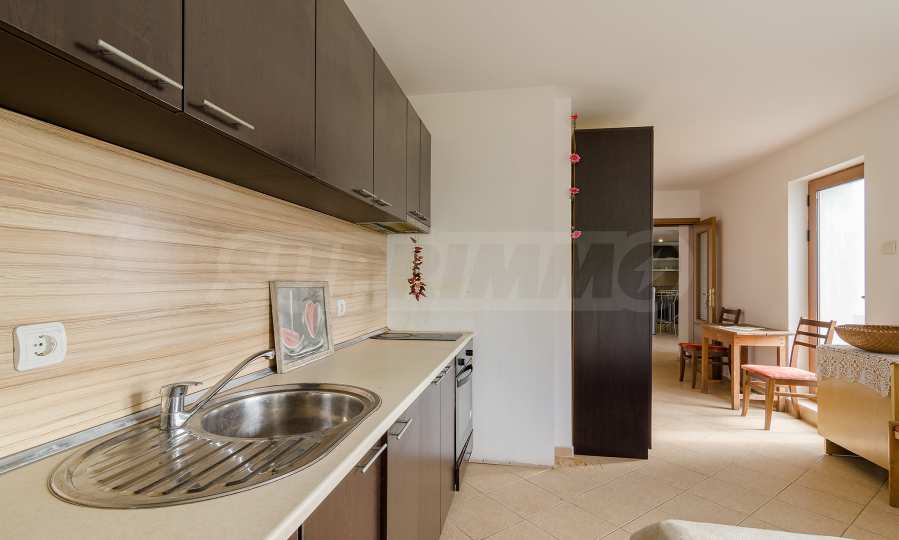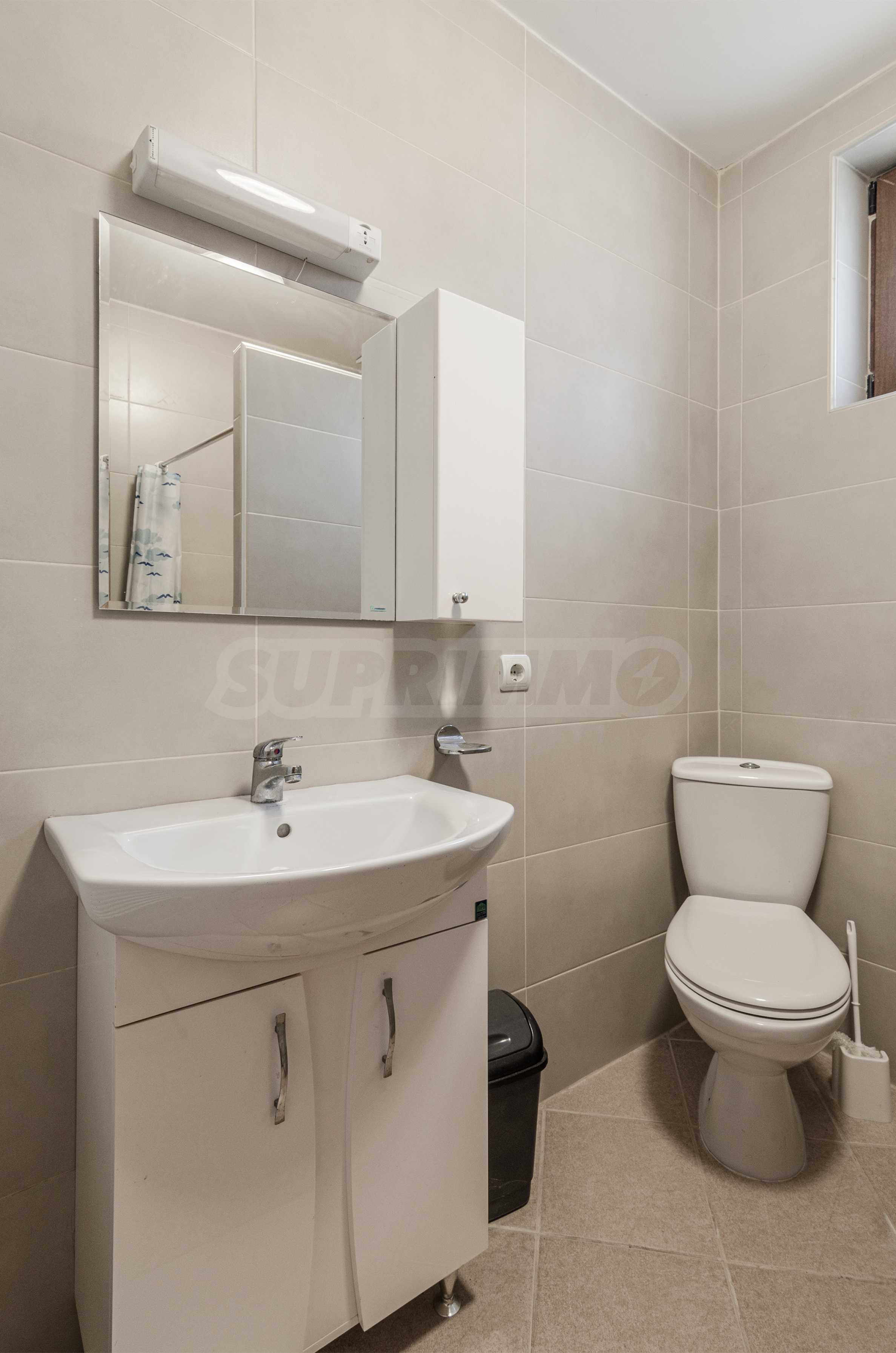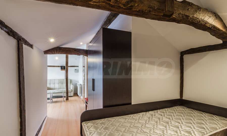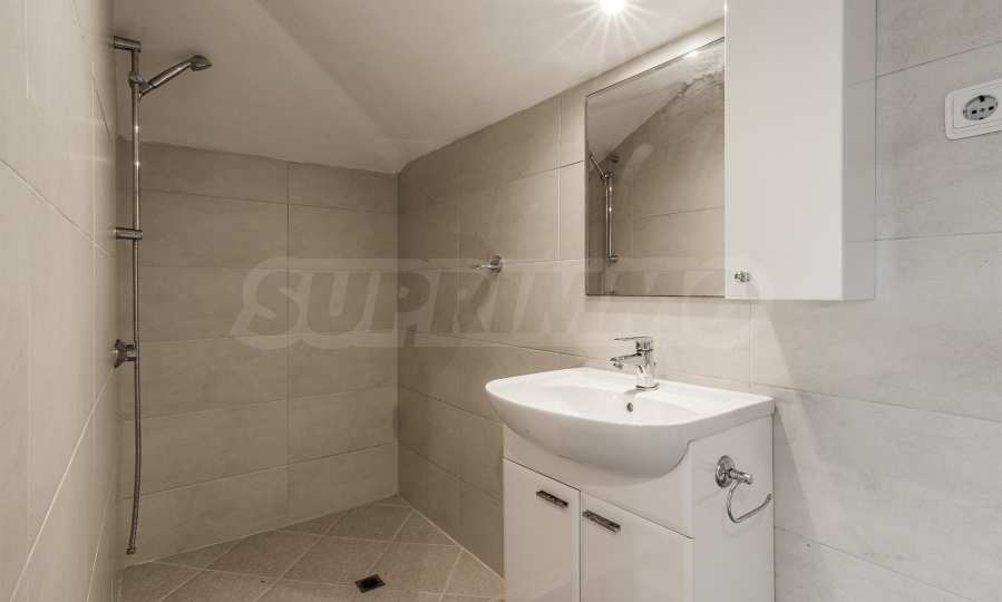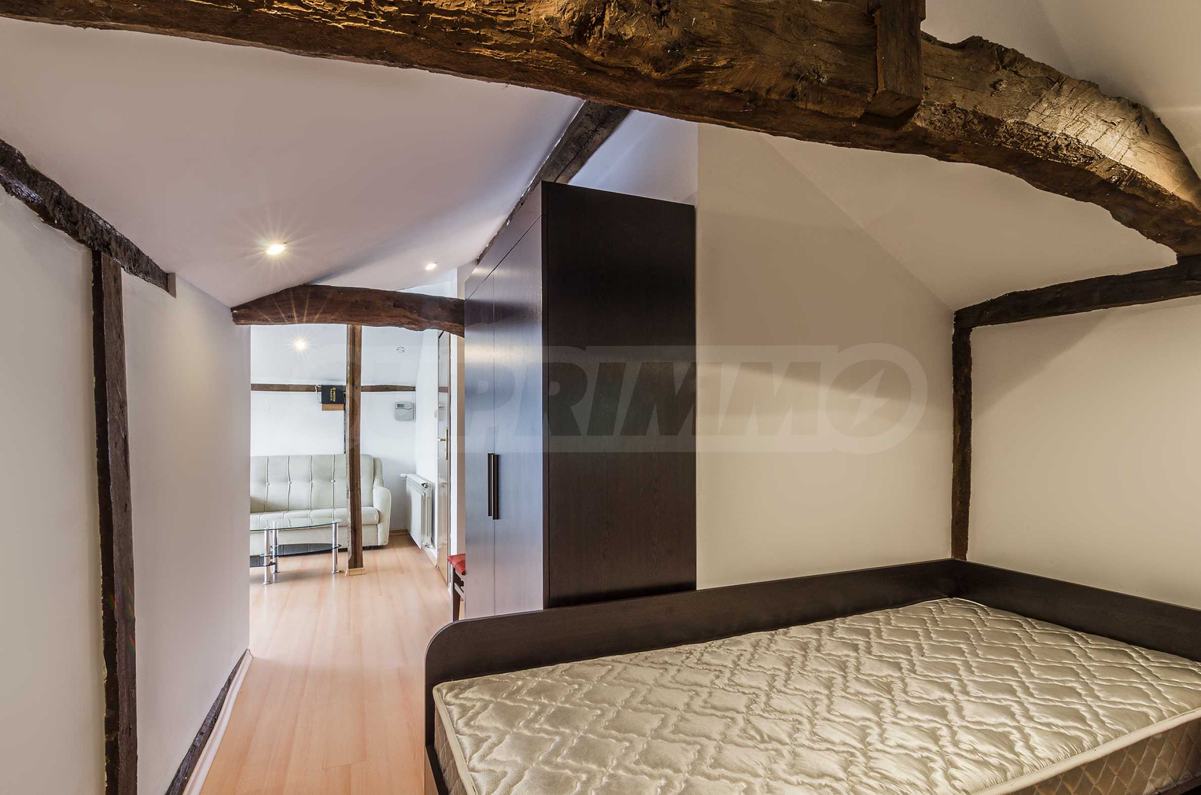 На приземния етаж ще откриете просторна кухня, трапезария, хол и една спалня. Освен това, има и самостоятелен апартамент с една спалня, който разполага с отделен вход от градината. На същото ниво се намират две бани. Горният етаж включва четири спални и три бани, като една от спалните има самостоятелен достъп през външно стълбище и тераса. В подпокривното пространство е обособен малък апартамент със собствена баня и тераса.