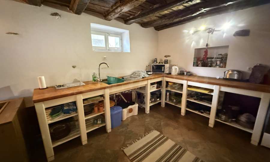 В двора ще откриете плевня, която може да бъде преустроена според вашите нужди – в лятна кухня, работилница или допълнително жилищно пространство. Има и барбекю зона, подходяща за вечери край реката.